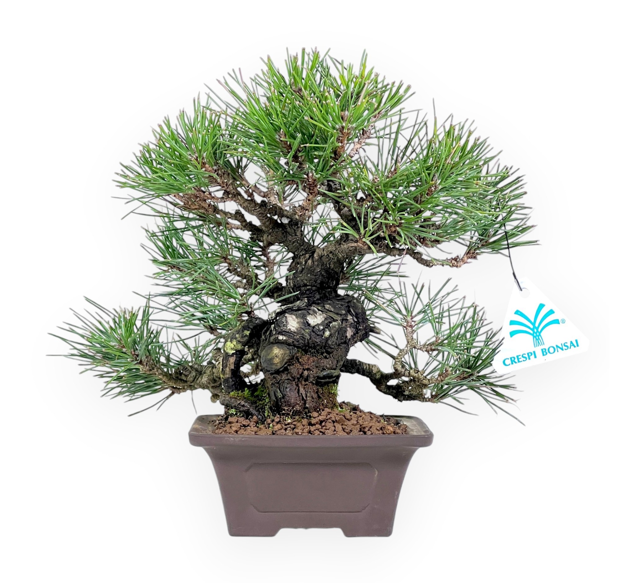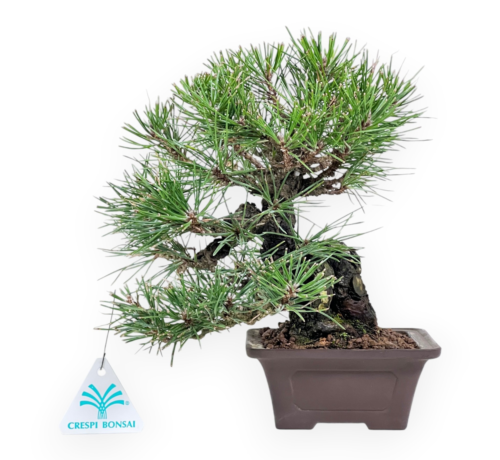Le bonsaï shohin de Pinus thunbergii (pin noir), conifère à feuilles persistantes, est robuste et très apprécié pour son écorce ridée et ses aiguilles vigoureuses. Le feuillage est dense et se compose d'aiguilles doubles, longues, fines et d'un vert vif. L'écorce mûre et rugueuse se fissure avec l'âge, devenant ainsi de plus en plus intéressante. Cultivé dans un pot carré en grès non émaillé, il accentue le contraste chromatique et souligne l'esthétique naturelle du bonsaï.