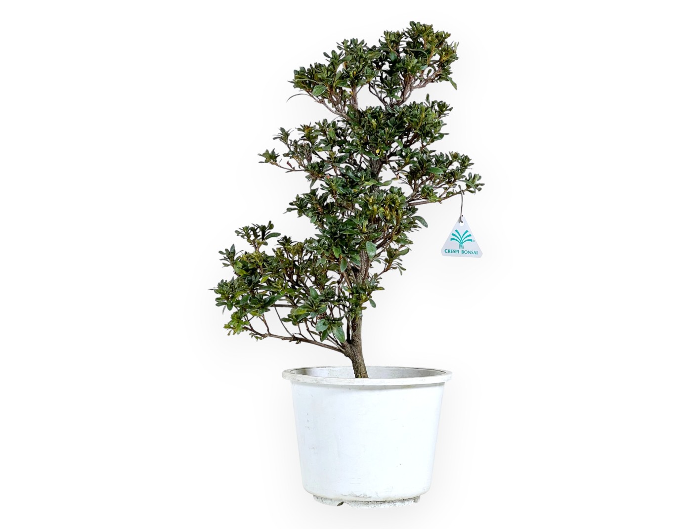 Questa pianta da lavorare di Rhododendron indicum kounomai (azalea) è una varietà sempreverde da fiore e si distingue per i suoi fiori colorati e la sua struttura arborea raffinata. È apprezzata per la sua fioritura primaverile bianca con sfumature rosa, che creano un contrasto elegante e vivace. Da notare il dettaglio della chioma di cui si può apprezzare lo sviluppo denso ed elegante grazie alla dimensione molto ridotta delle sue foglie. La pianta è coltivata in un vaso in plastica tondo bianco.
