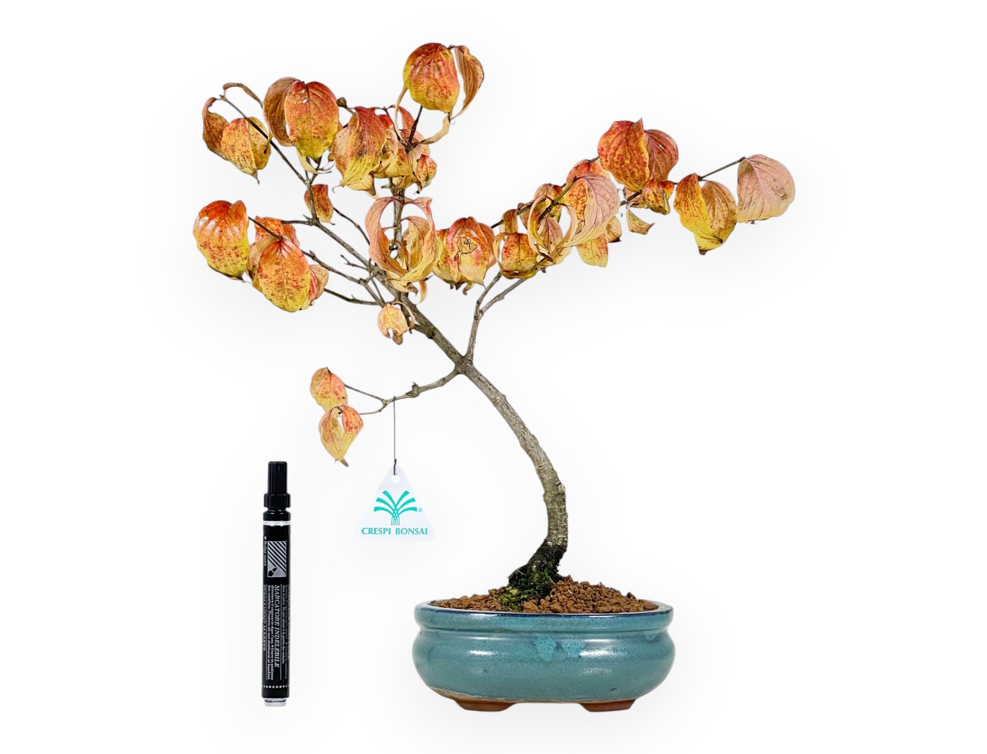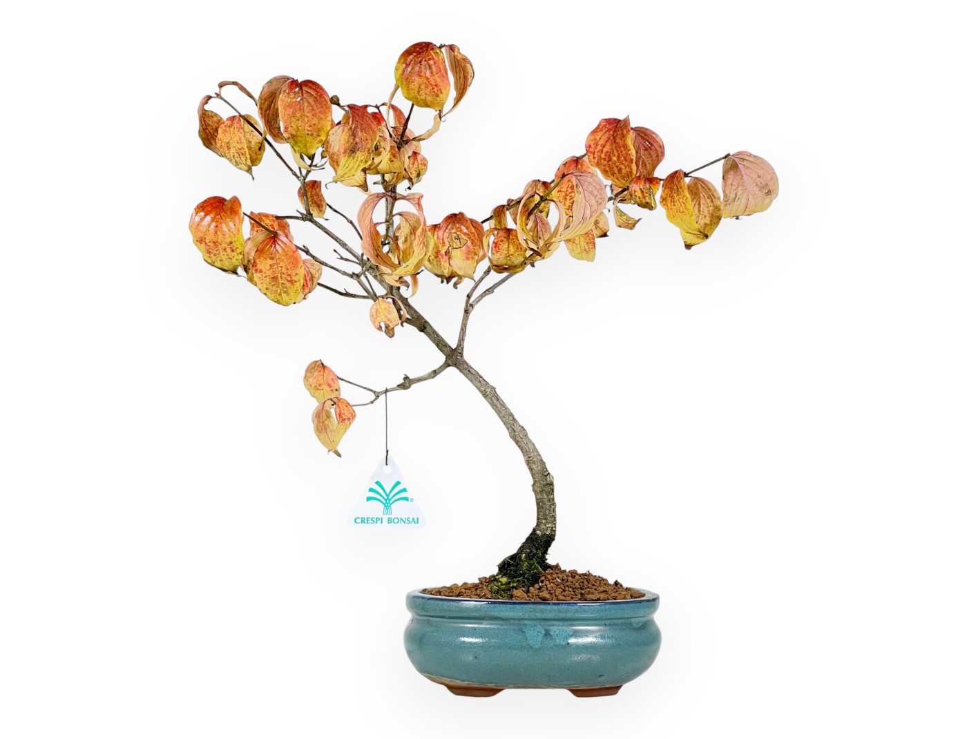 Questo bonsai di Cornus (corniolo) è un albero caducifoglie da fiore e frutto, apprezzato per la sua bellezza stagionale e la struttura elegante. Le sue foglie da verdi chiaro virano al verde intenso e brillante in primavera; si tingono di rosso, arancione e giallo in autunno, creando uno spettacolare gioco di colori; per poi spogliarsi in inverno. Il Cornus è noto per la piccola fioritura giallo-verde, a fine primavera o all'inizio dell'estate, e la produzione di piccoli frutti (drupe) di colore che varia dal rosa al rosso, con polpa giallo-arancio all'interno. Coltivato in stile inclinato (Shakan), presenta un tronco che si piega con eleganza verso un lato, donando movimento e naturalezza. Il vaso ovale in grès smaltato turchese contrasta con le sfumature del fogliame.