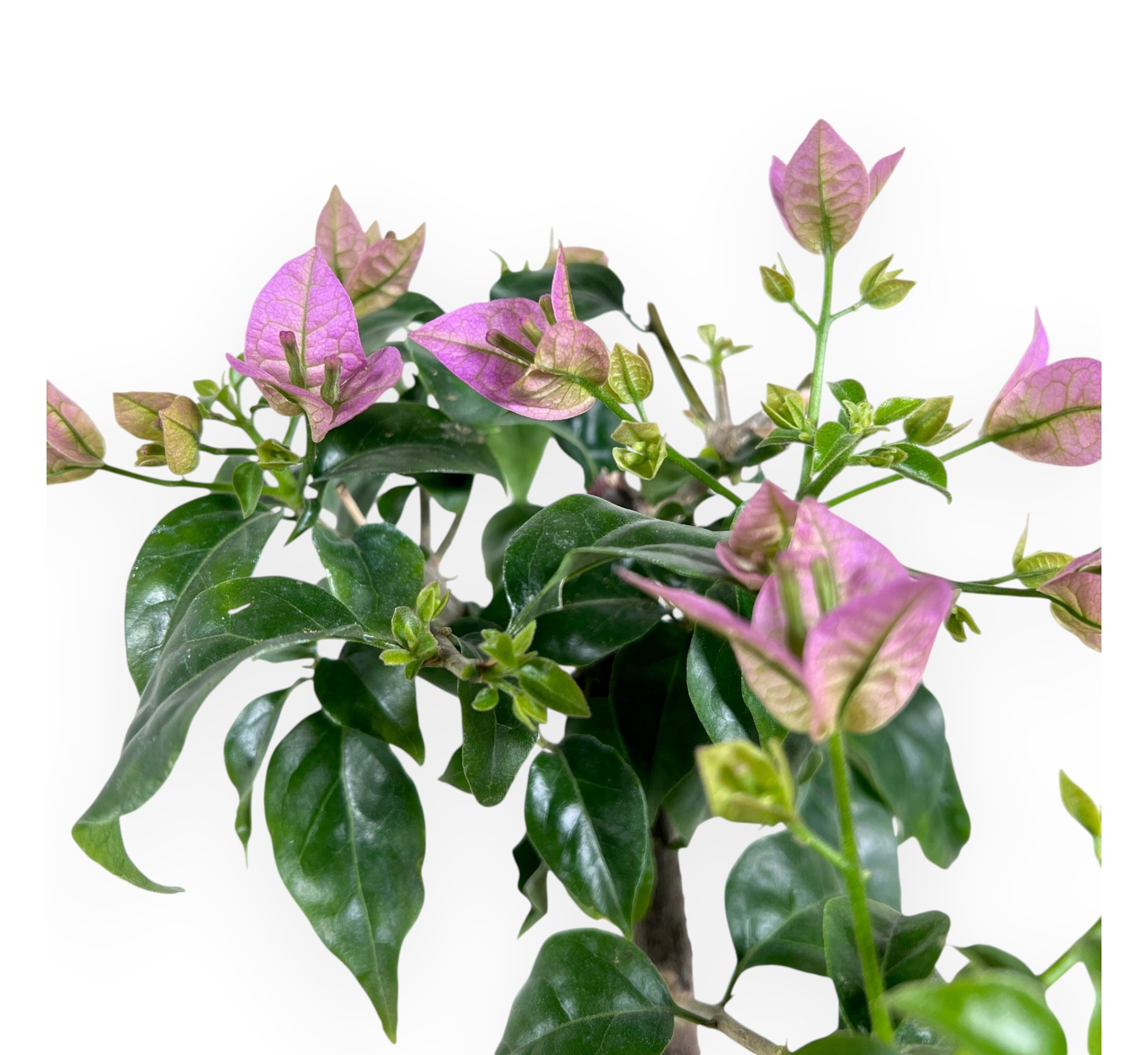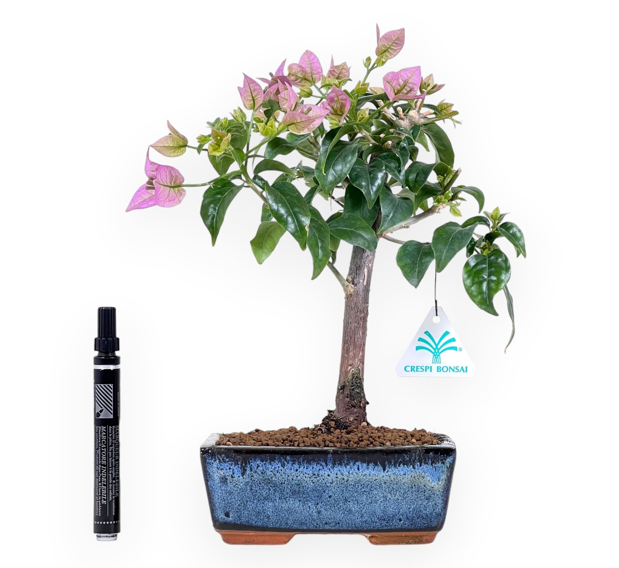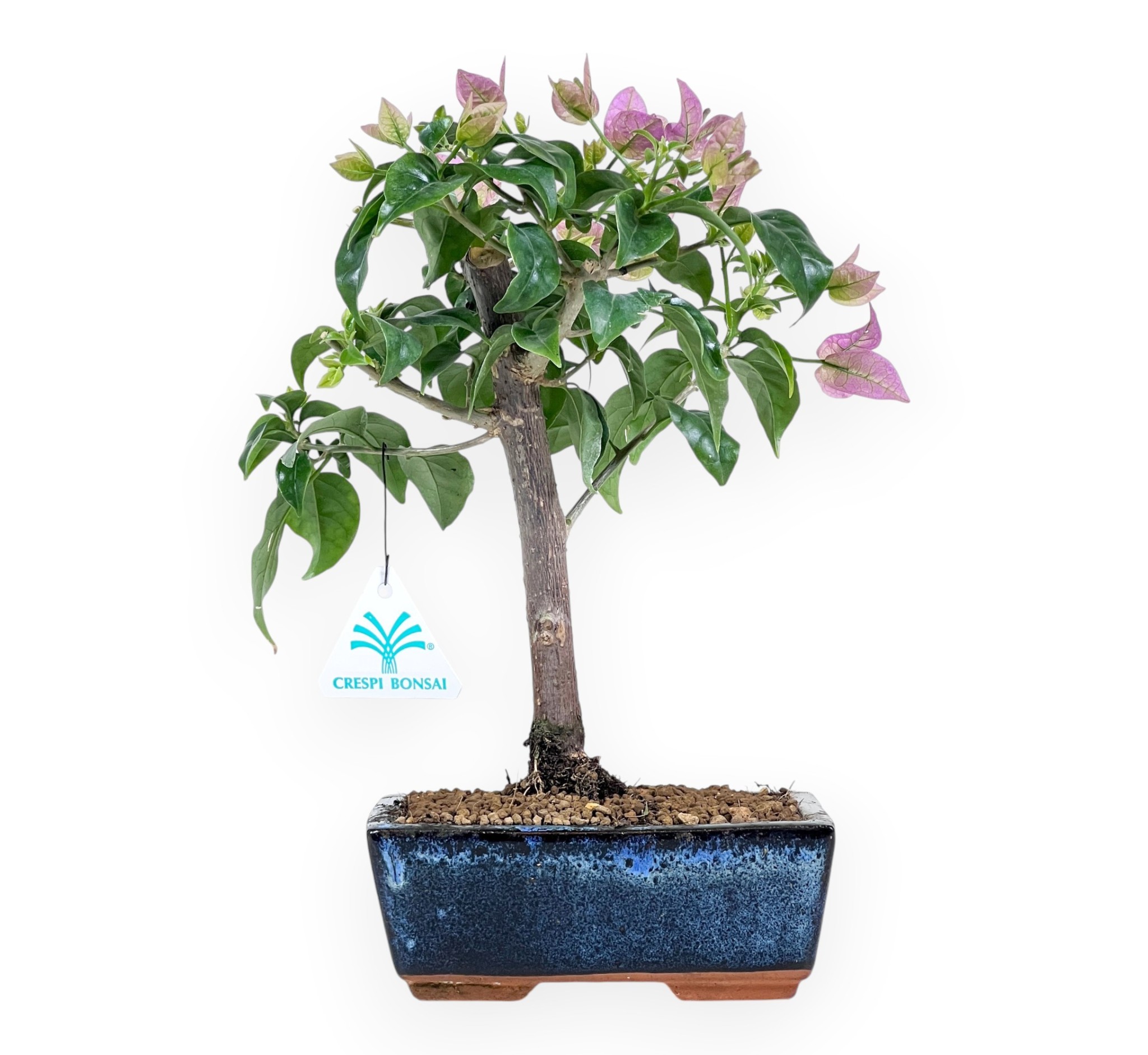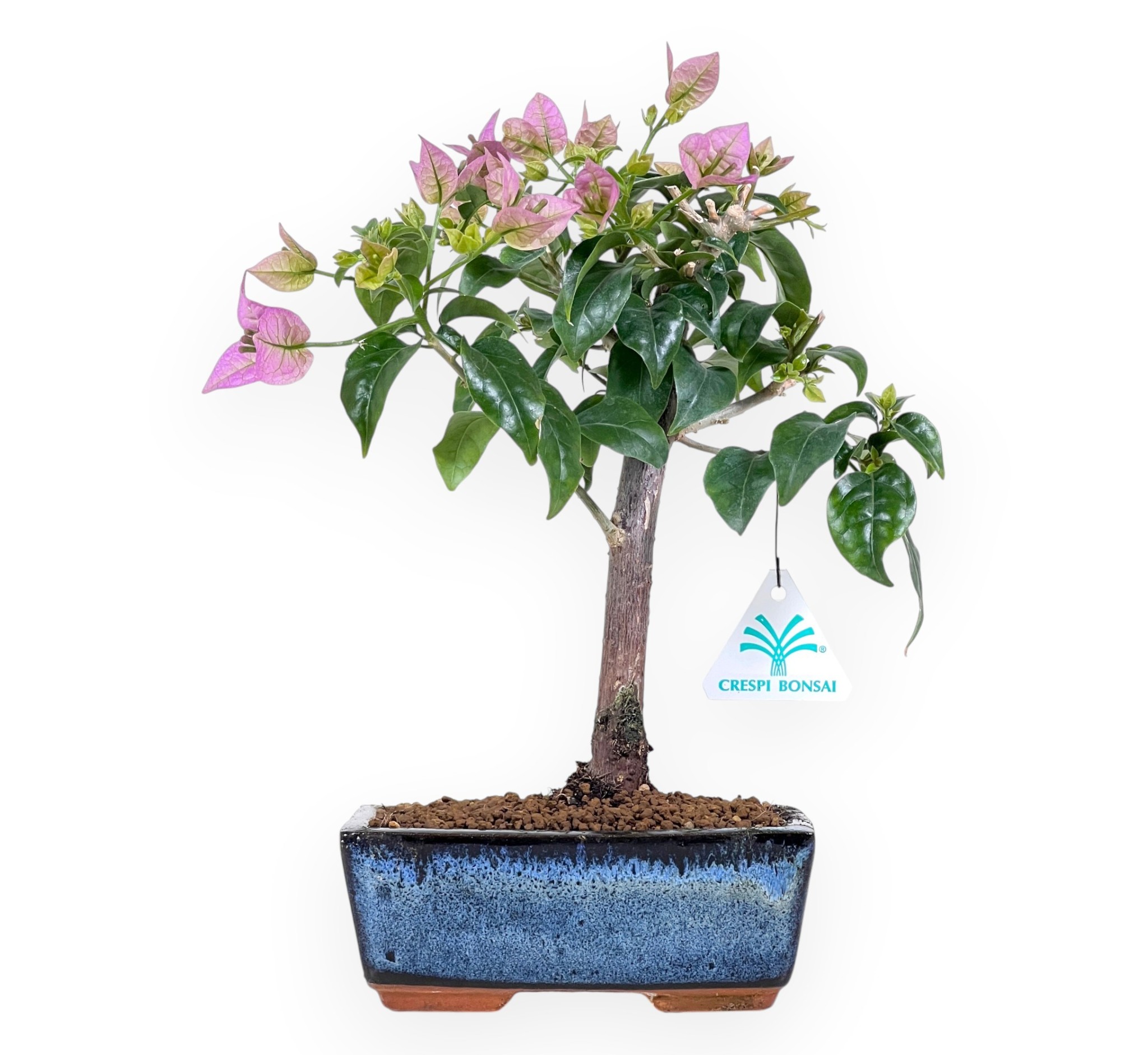 Questo bonsai di Bouganvillea glabra (Bouganville), sempreverde da fiore, è apprezzato per la sua fioritura vivace e scenografica che rende la pianta molto ornamentale. I veri fiori sono piccoli, tubolari e di colore bianco-crema, riuniti al centro di tre brattee sottili e cartacee, dalla consistenza vellutata, di colore rosa-lilla. La fioritura è generosa e può comparire più volte durante l’anno in presenza di luce abbondante; generalmente è più intensa tra primavera ed estate, ma in ambienti luminosi e riparati può iniziare già a fine inverno. Con chioma di colore verde intenso e ramificazione armoniosa. Coltivato in vaso rettangolare in grès smaltato blu, esalta il contrasto cromatico e valorizza l’estetica della pianta.