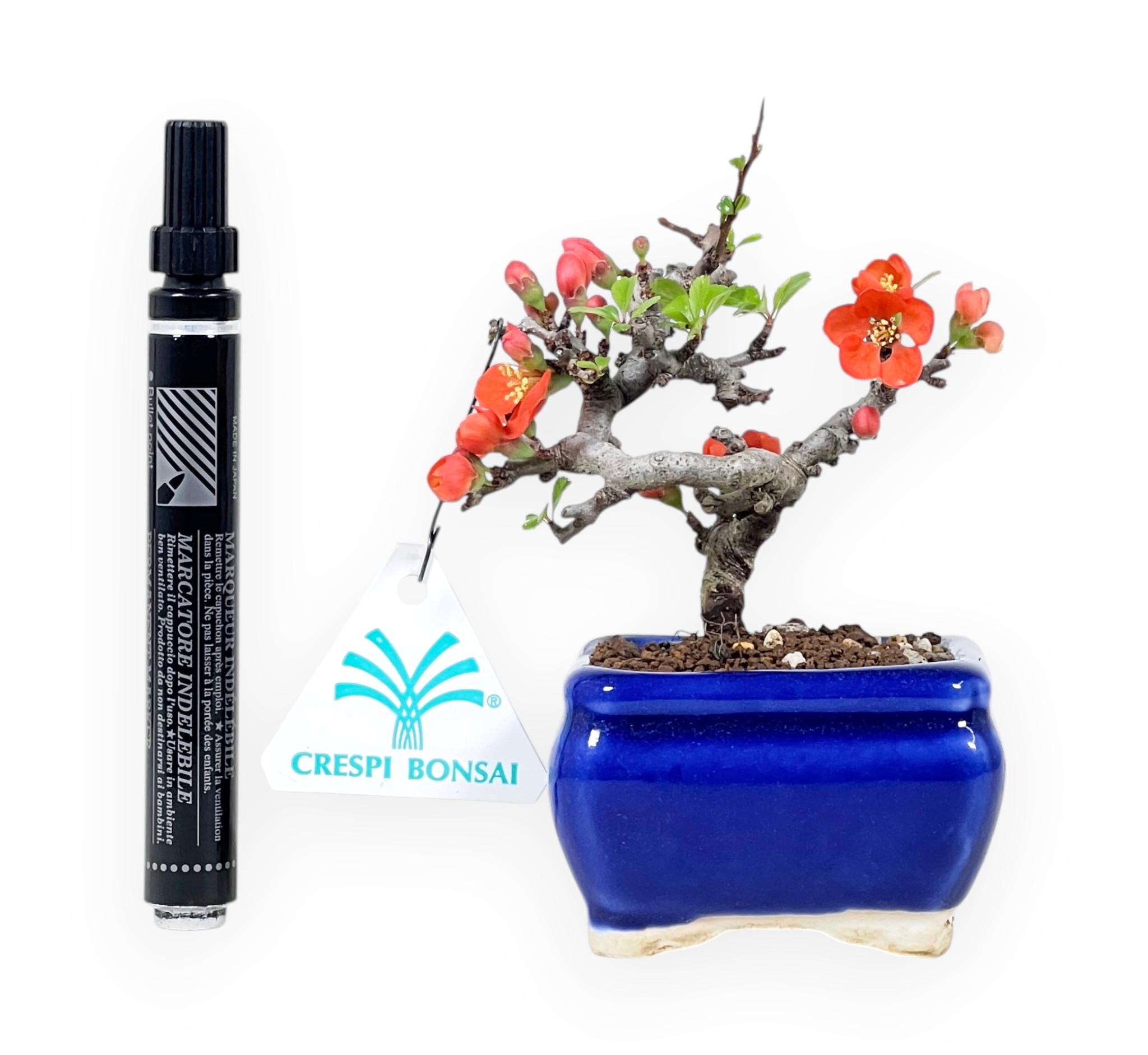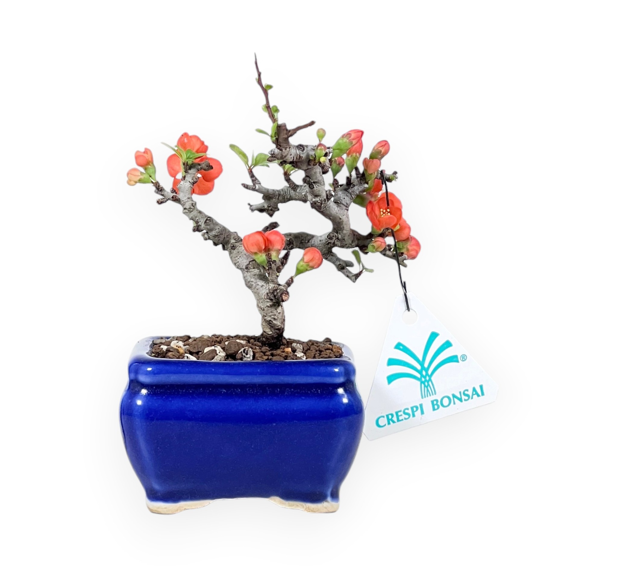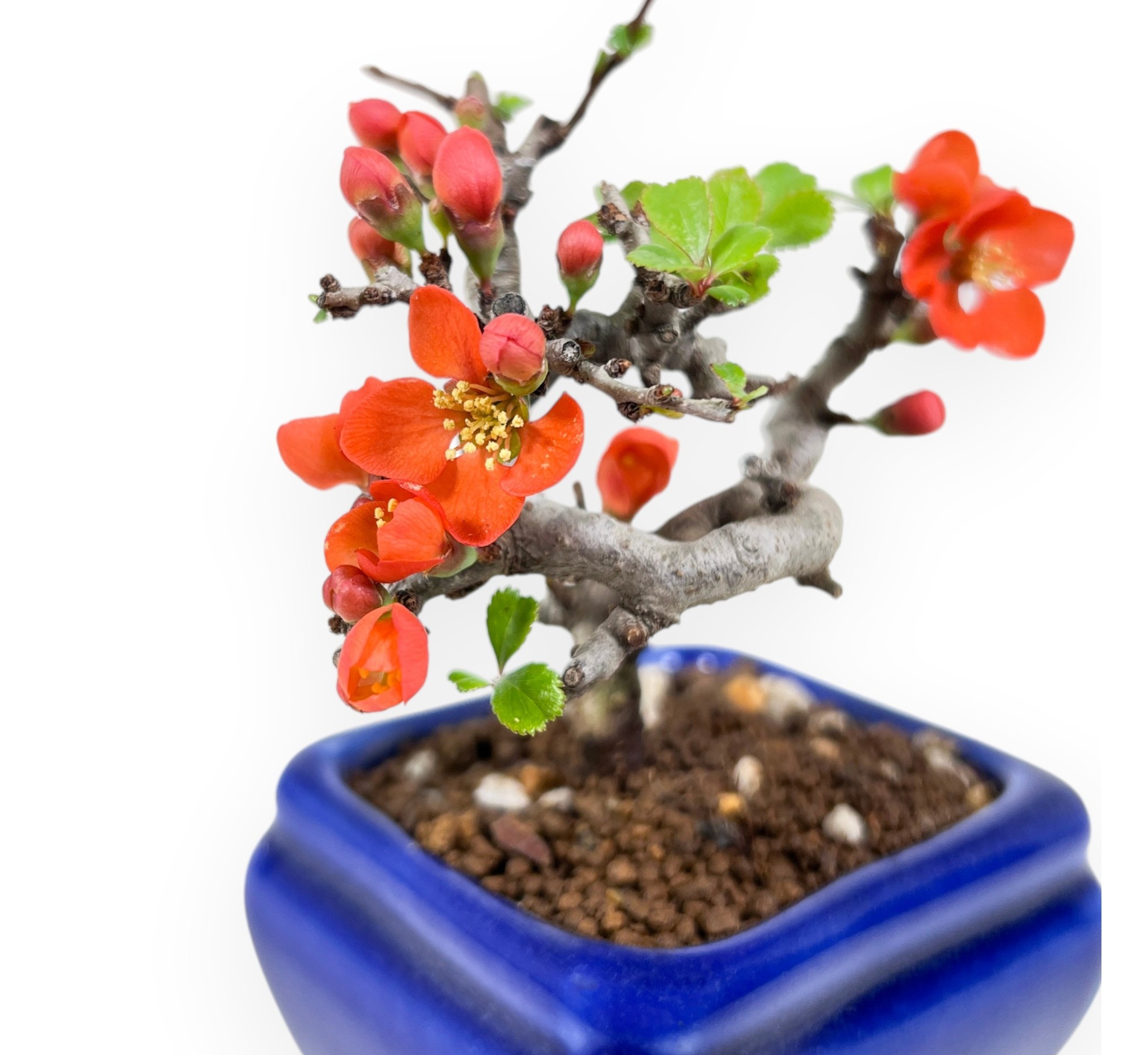 Bonsai shohin di Chaenomeles speciosa: specie caducifoglia molto apprezzata per la sua fioritura precoce e abbondante dai toni vivaci arancio-rossi, che anticipa la comparsa del fogliame. I delicati fiori, con stami dorati in evidenza, risaltano lungo i rami ancora parzialmente spogli, creando un forte impatto ornamentale. La chioma, che si sviluppa successivamente con piccole foglie verde brillante, mantiene una struttura compatta e armoniosa, spogliandosi durante la stagione invernale. Presenta un tronco ben proporzionato, con movimento sinuoso e corteccia matura che conferisce carattere alla pianta. Il bonsai è coltivato in un elegante vaso rettangolare in grès smaltato blu che crea un raffinato contrasto con l’intensità cromatica della fioritura, esaltandone l’equilibrio estetico complessivo.