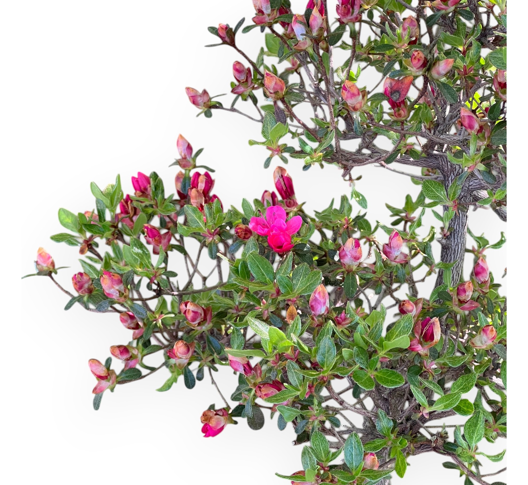 Bonsai di Rhododendron indicum benikomachi (azalea), sempreverde da fiore, si distingue per i suoi fiori colorati. È apprezzata per la sua fioritura primaverile di colore rosa intenso tendente al fucsia, che crea un contrasto elegante e vivace con il verde delle foglie. Da notare il dettaglio della chioma di cui si può apprezzare lo sviluppo denso ed elegante grazie alla dimensione ridotta delle sue foglie. Coltivata in un vaso in plastica tondo nero.
