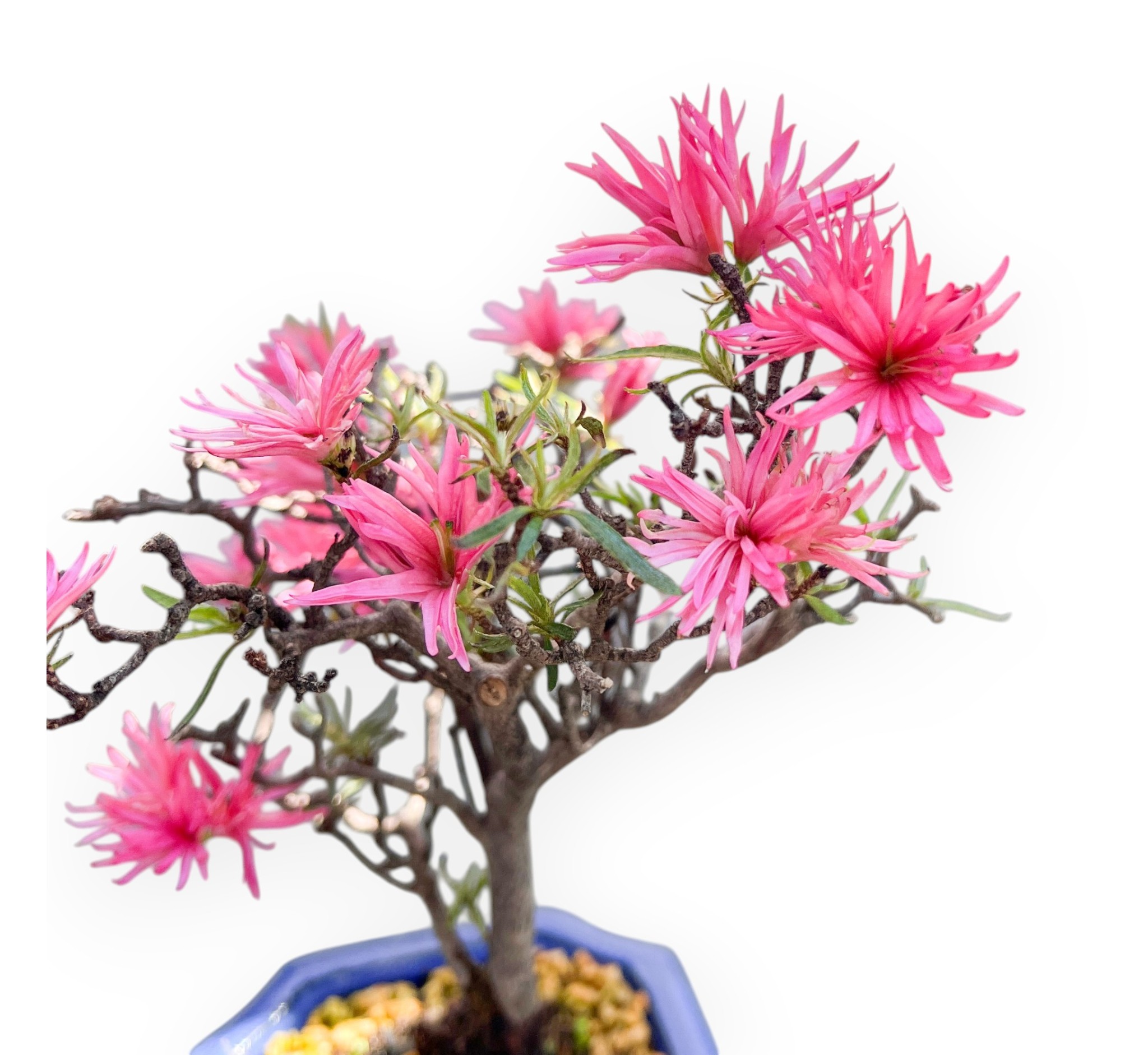 Bonsai di Rhododendron indicum (azalea), sempreverde da fiore, si distingue per i suoi particolari fiori colorati. È apprezzata per la sua fioritura primaverile di colore rosa intenso, dai petali sottili, allungati e leggermente arricciati che creano un effetto leggero e dinamico. Le foglie sono piccole, ovali e allungate, di colore verde brillante durante la stagione vegetativa. Essendo una sempreverde, mantiene il fogliame tutto l’anno; nei mesi più freddi può assumere sfumature più scure, mantenendo comunque un aspetto decorativo. Il vaso rettangolare in grès smaltato blu, crea un contrasto raffinato con il colore della vegetazione, esaltando la composizione con eleganza.
