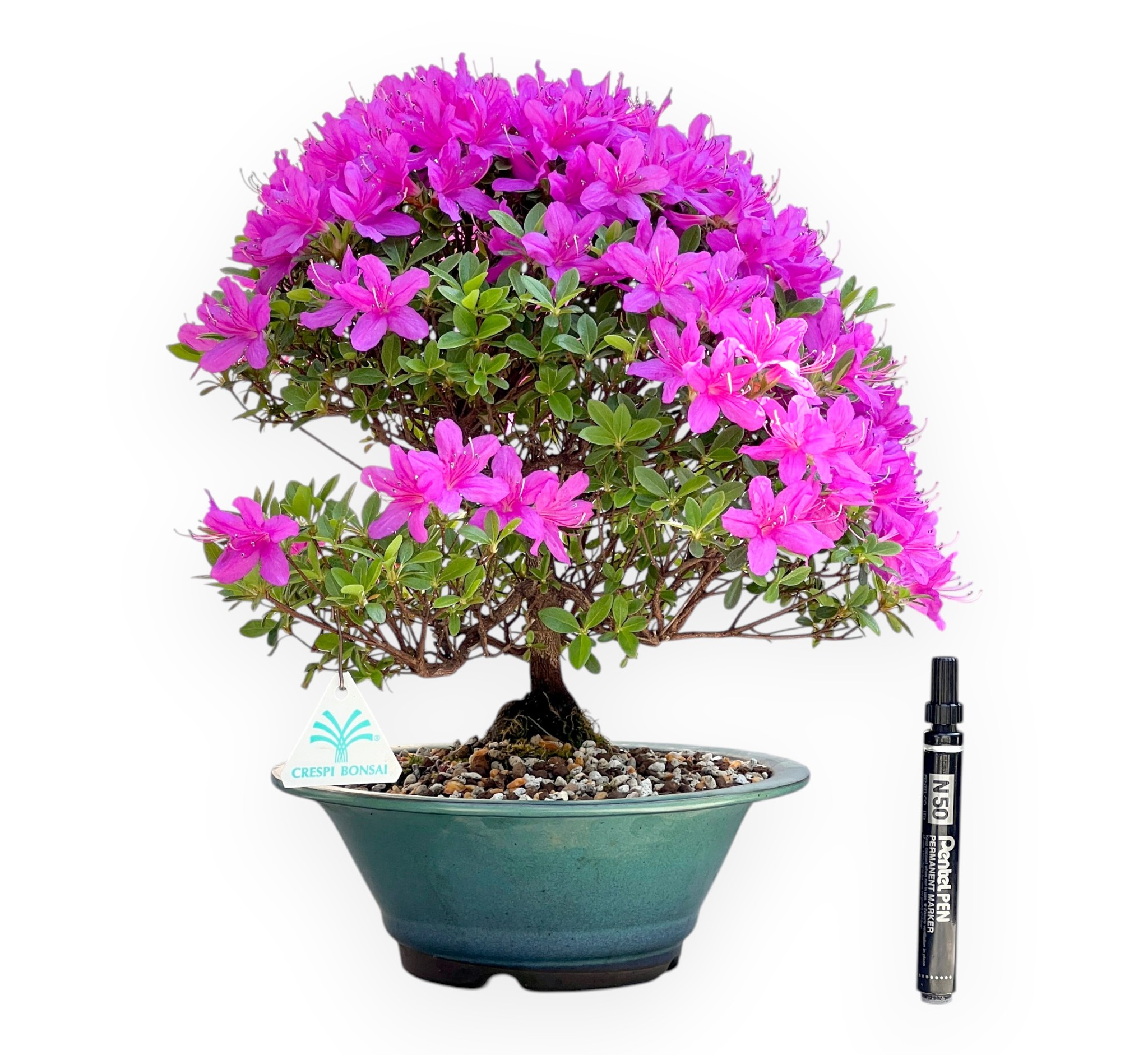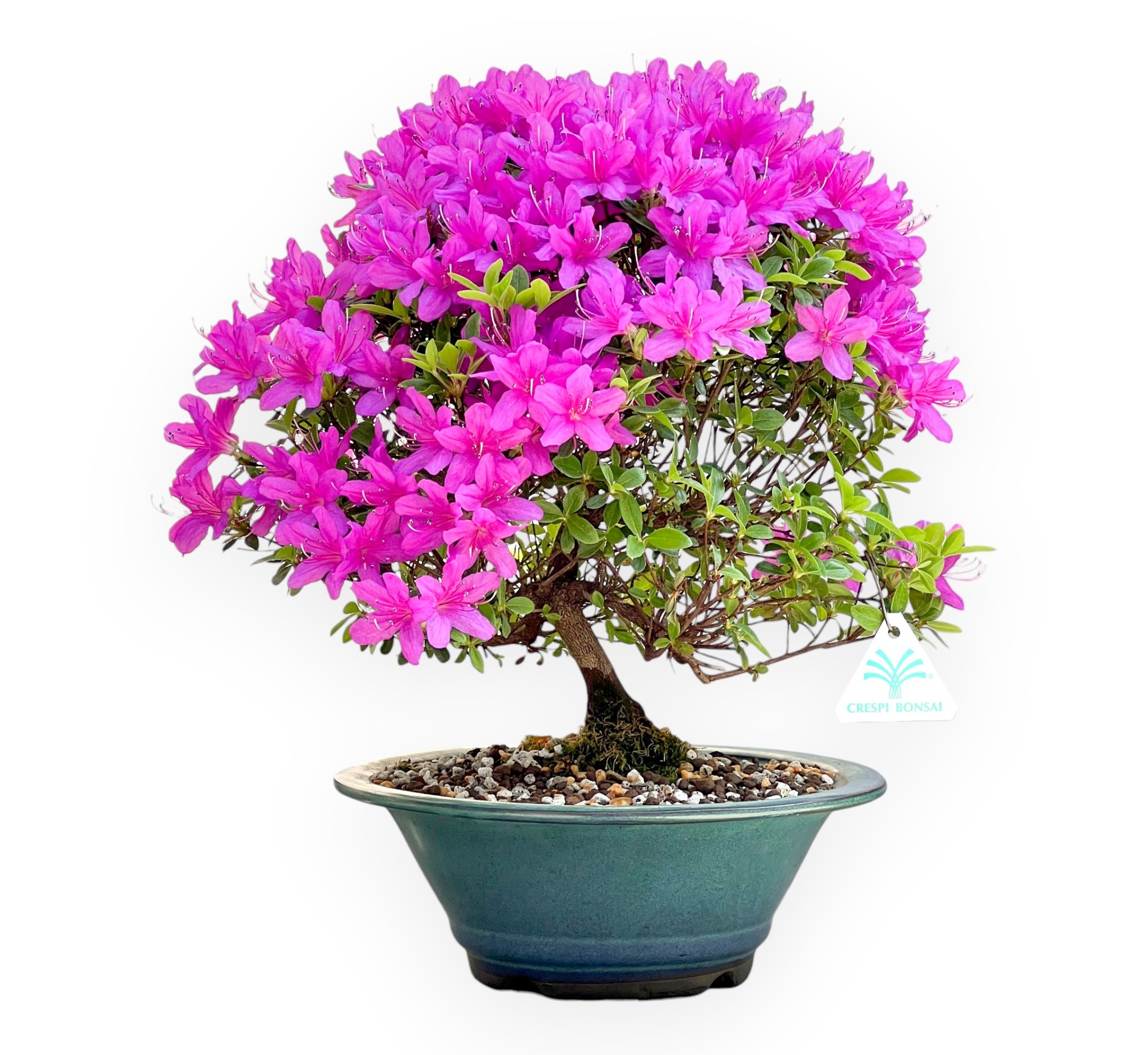 Bonsai di Rhododendron indicum ryusei (azalea), sempreverde da fiore, si distingue per i suoi fiori colorati. È apprezzato per la sua fioritura primaverile di colore fucsia, che crea un contrasto elegante e vivace con il verde delle foglie. Le foglie sono piccole e ovali, di colore verde brillante durante la stagione vegetativa. Essendo una sempreverde, mantiene il fogliame tutto l’anno; nei mesi più freddi può assumere sfumature più scure o bronzate, mantenendo comunque un aspetto decorativo. Coltivato in un vaso tondo in grès smaltato verde-turchese, completa il bonsai esaltando la bellezza della pianta, donando equilibrio e raffinatezza.