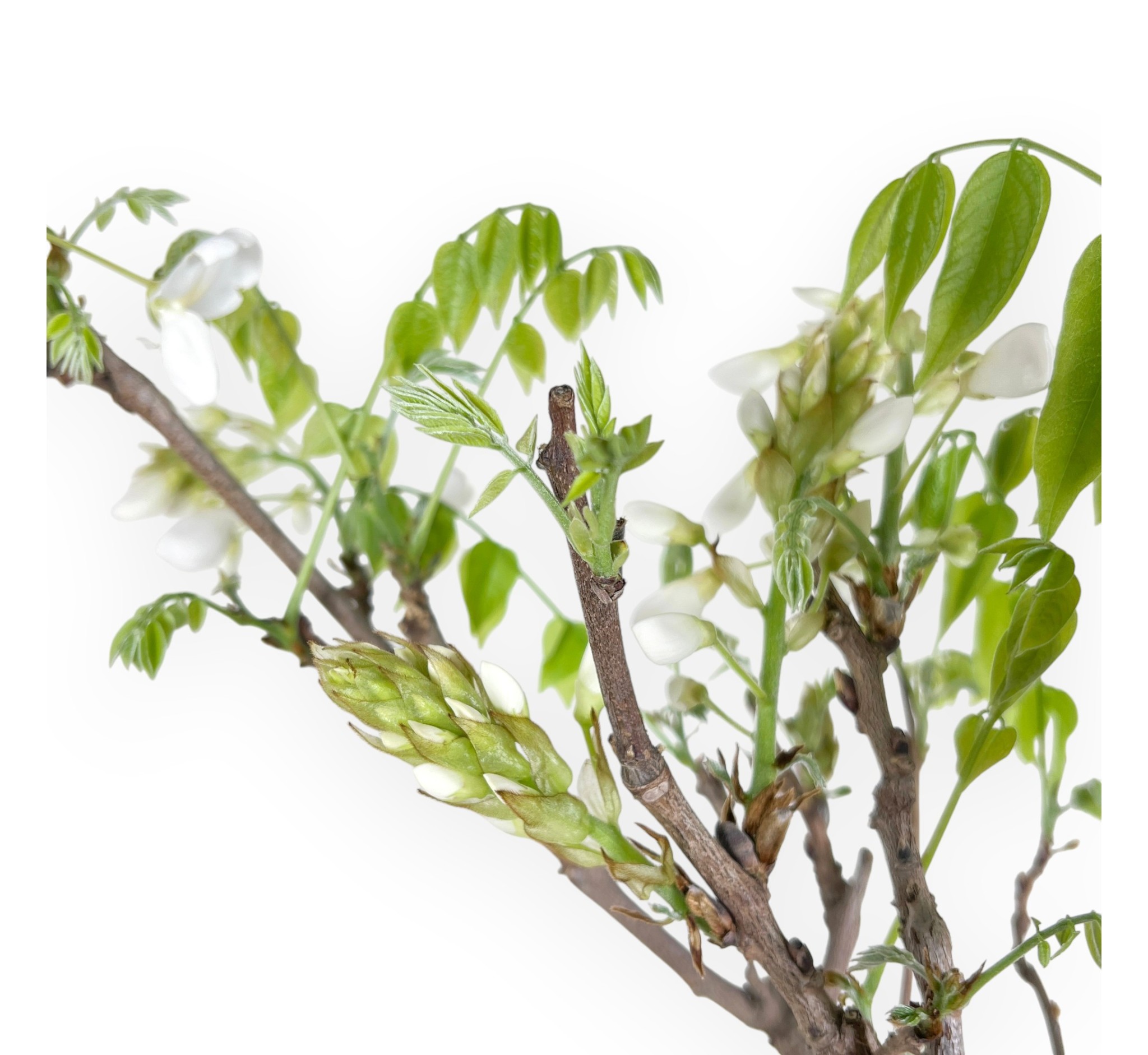 Bonsai di Wisteria floribunda, specie caducifoglie da fiore, nota per la spettacolare fioritura primaverile. In primavera produce le caratteristiche gemme floreali, che si sviluppano prima o contemporaneamente alle foglie. La fioritura rappresenta il momento più scenografico: lunghi racemi penduli di fiori profumati bianchi, creano un effetto elegante e leggero. Le foglie, di colore verde si aprono progressivamente accompagnando la fioritura senza mai sovrastarla. Durante l’estate, dopo la fioritura, la vegetazione si infittisce formando una chioma più piena, mentre in autunno le foglie ingialliscono prima di cadere, lasciando nuovamente in evidenza la struttura spoglia del bonsai. Presenta un tronco leggermente inclinato che dona movimento alla composizione. Coltivato in un vaso tondo in grès smaltato blu, che contrasta elegantemente con le sfumature del fogliame e richiama le tonalità della fioritura.