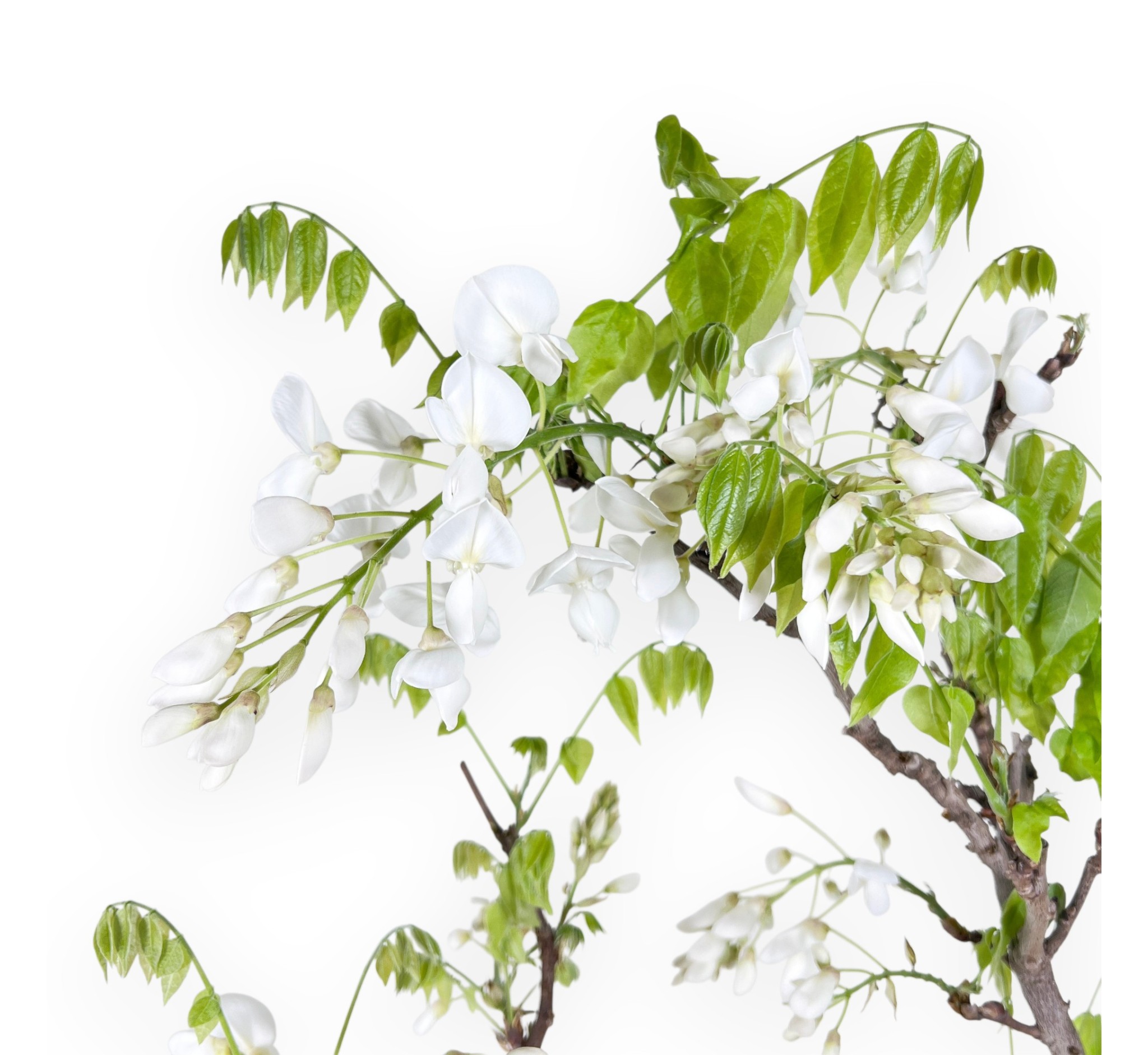 Bonsai di Wisteria floribunda, specie caducifoglie da fiore, nota per la spettacolare fioritura primaverile. In primavera produce le caratteristiche gemme floreali, che si sviluppano prima o contemporaneamente alle foglie. La fioritura rappresenta il momento più scenografico: lunghi racemi penduli di fiori profumati bianchi, creano un effetto elegante e leggero. Le foglie verdi si aprono progressivamente accompagnando la fioritura senza mai sovrastarla. Durante l’estate, dopo la fioritura, la vegetazione si infittisce formando una chioma più piena, mentre in autunno le foglie ingialliscono prima di cadere, lasciando nuovamente in evidenza la struttura spoglia del bonsai. Presenta un tronco leggermente inclinato che dona movimento alla composizione. Coltivato in un vaso tondo in grès smaltato blu, che contrasta elegantemente con le sfumature del fogliame e richiama le tonalità della fioritura.