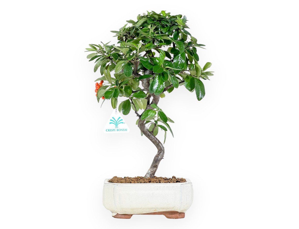 Questo bonsai di Pyracantha appartenente alla varietà sempreverde da frutto, è apprezzato per la fioritura primaverile bianca e la produzione di bacche arancioni vivaci in autunno-inverno. È coltivato in vaso rettangolare con angoli smussati in grès smaltato beige, che dona un aspetto elegante. Il tronco sinuoso a "S" dona un'elegante sensazione di movimento.