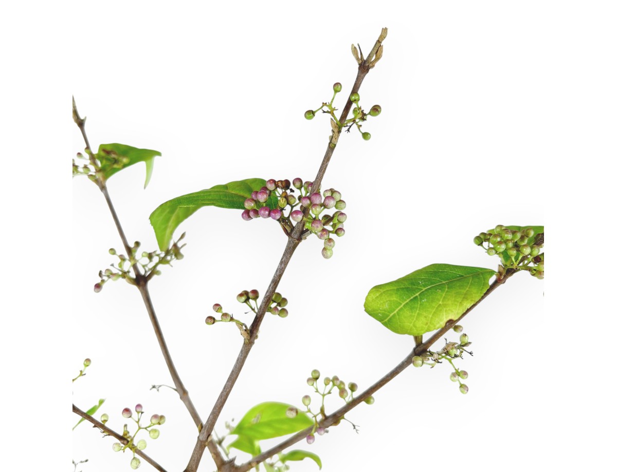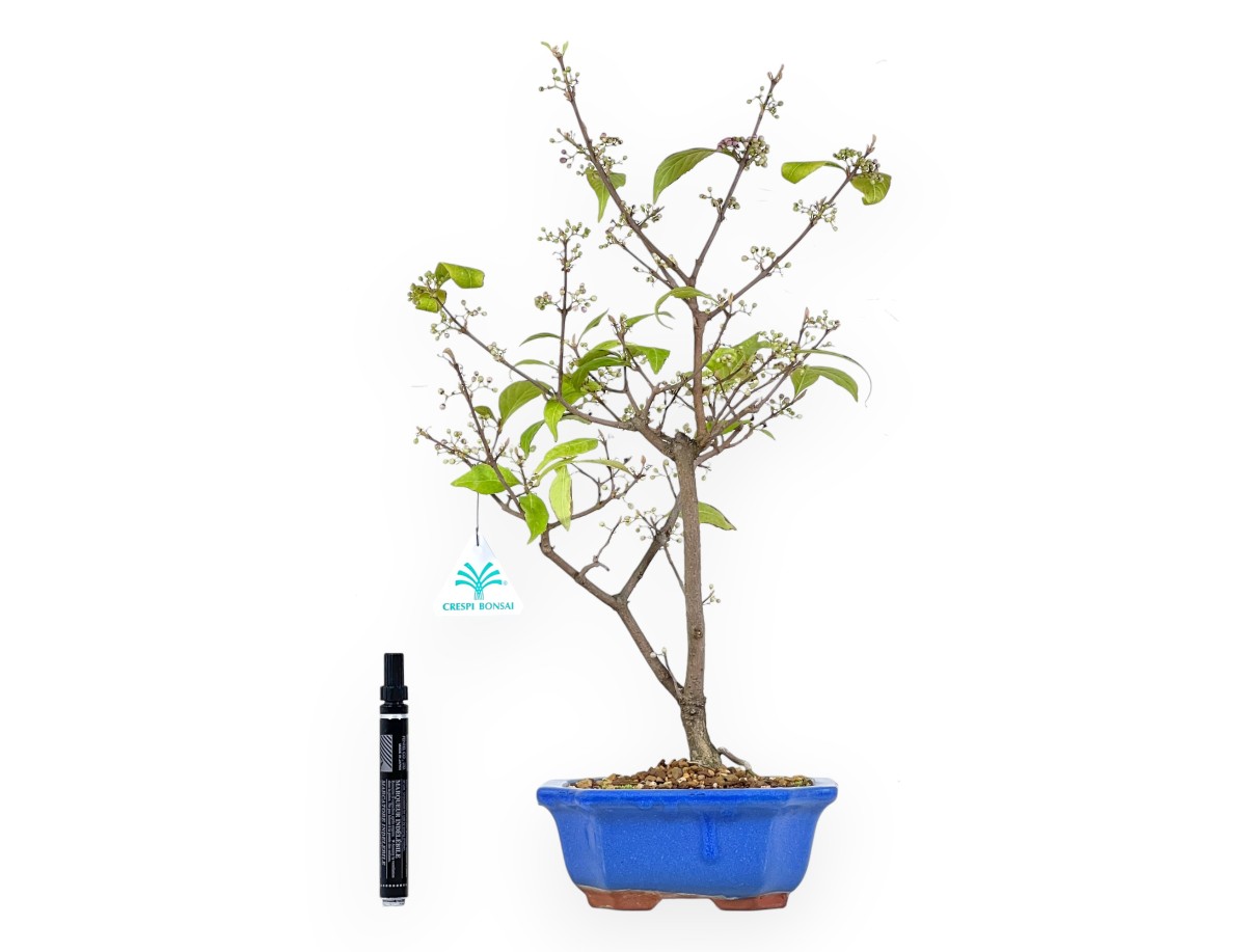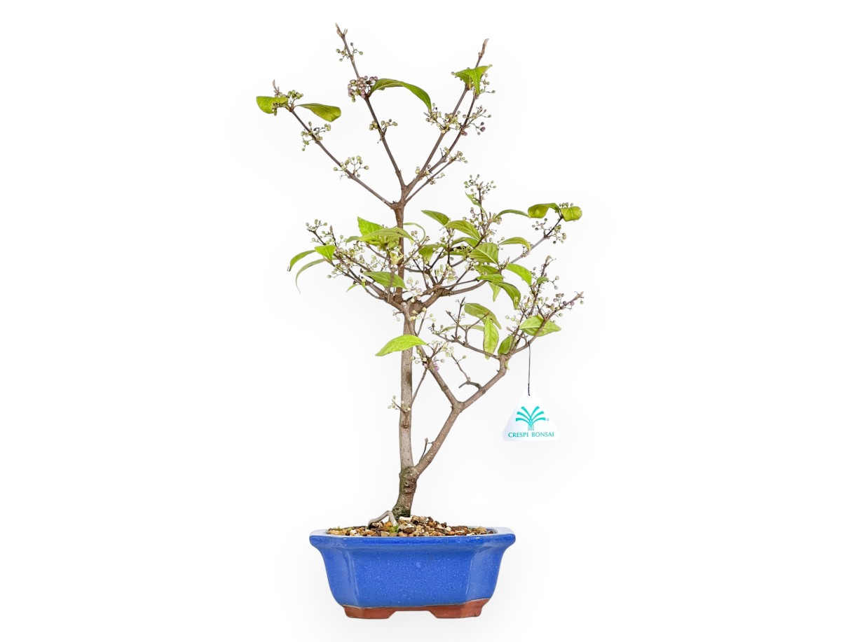 Questo bonsai di Callicarpa japonica (callicarpa) appartenente alla varietà caducifoglie da frutto, è noto per i suoi piccoli frutti viola che decorano i rami in autunno, creando un effetto ornamentale unico. In tarda primavera produce fiori rosa-lilla, a quattro petali, disposti in grappoli all'ascella delle foglie. Il bonsai è coltivato in un vaso in grès smaltato blu cobalto, dalla forma rettangolare con angoli smussati, che valorizza la delicatezza della pianta e dona eleganza all’insieme.