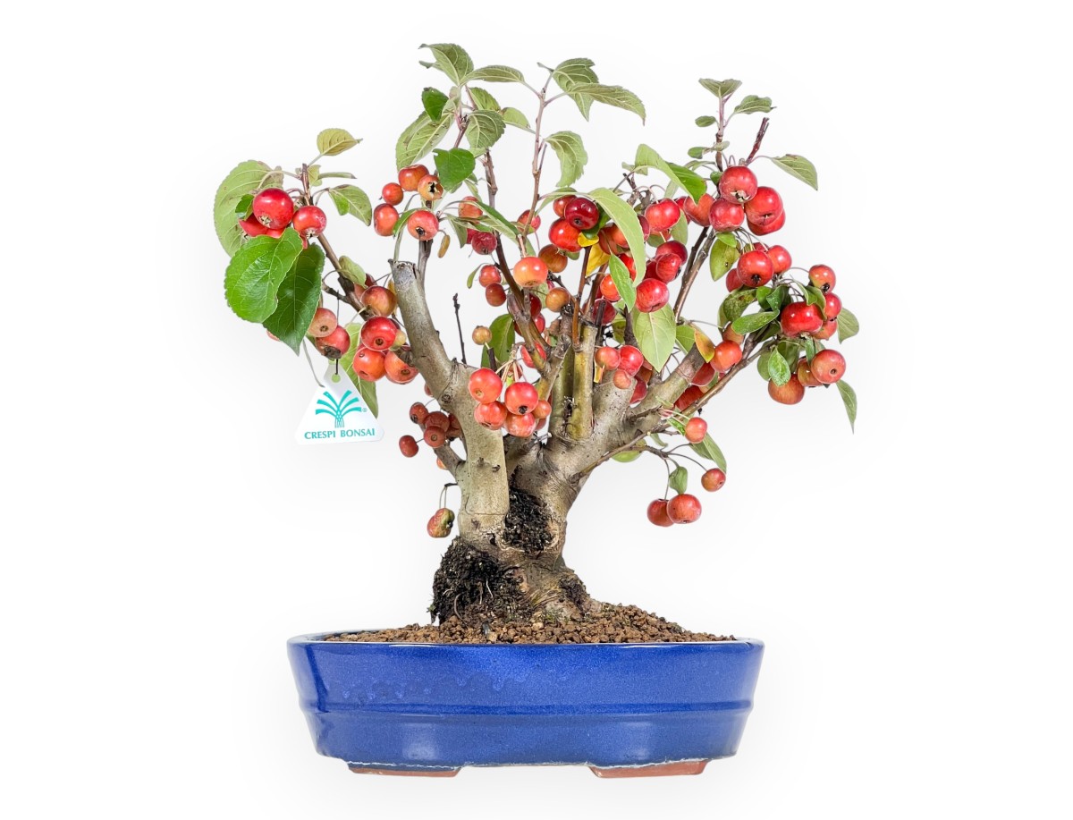 Bonsai di Melo caratterizzato da altezza senza vaso di 32,5 cm, dimensione del tronco di 6 cm e nebari di 13 cm. La pianta è coltivata in un vaso ovale in grès smaltato le cui dimensioni sono 26,5x18,5xH7,5 cm.