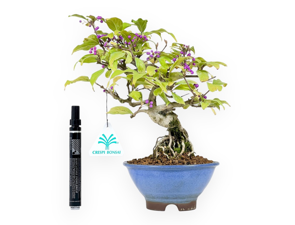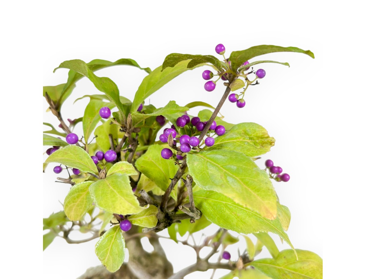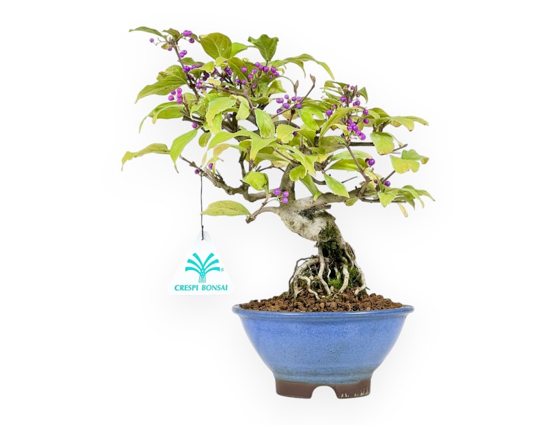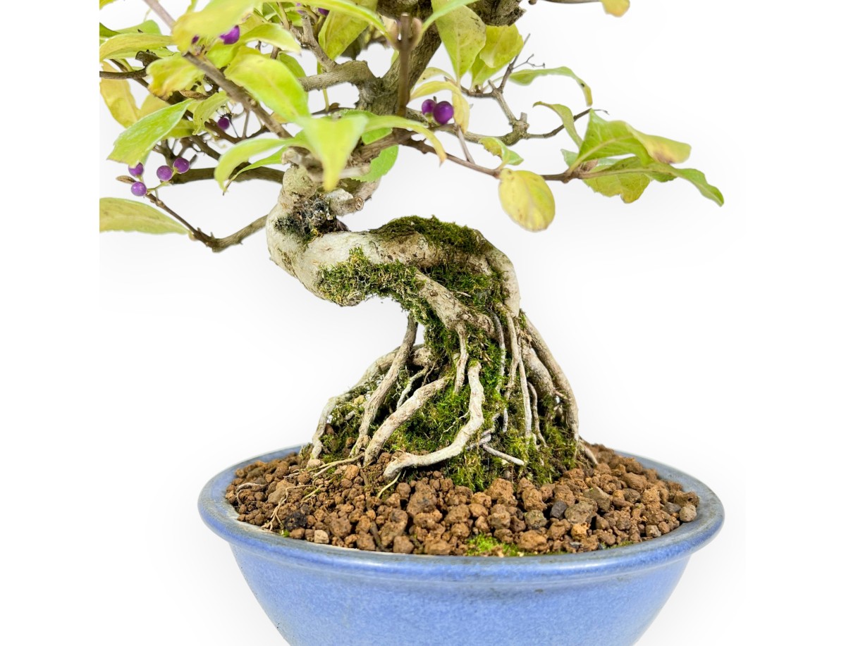 Questo bonsai shohin di Callicarpa japonica (callicarpa) appartenente alla varietà caducifoglie da frutto, è noto per i suoi piccoli frutti viola che decorano i rami in autunno, creando un effetto ornamentale unico. In tarda primavera produce fiori rosa-lilla, a quattro petali, disposti in grappoli all'ascella delle foglie. La chioma si colora di giallo aranciato in autunno e si spoglia in inverno. Coltivato in stile a radici esposte (Neagari) accentua la stabilità e robustezza del bonsai, mentre il tronco si sviluppa con sinuose curve verso l'alto, creando una forma naturale ed equilibrata. È coltivato in vaso tondo in grès smaltato blu che dona eleganza.