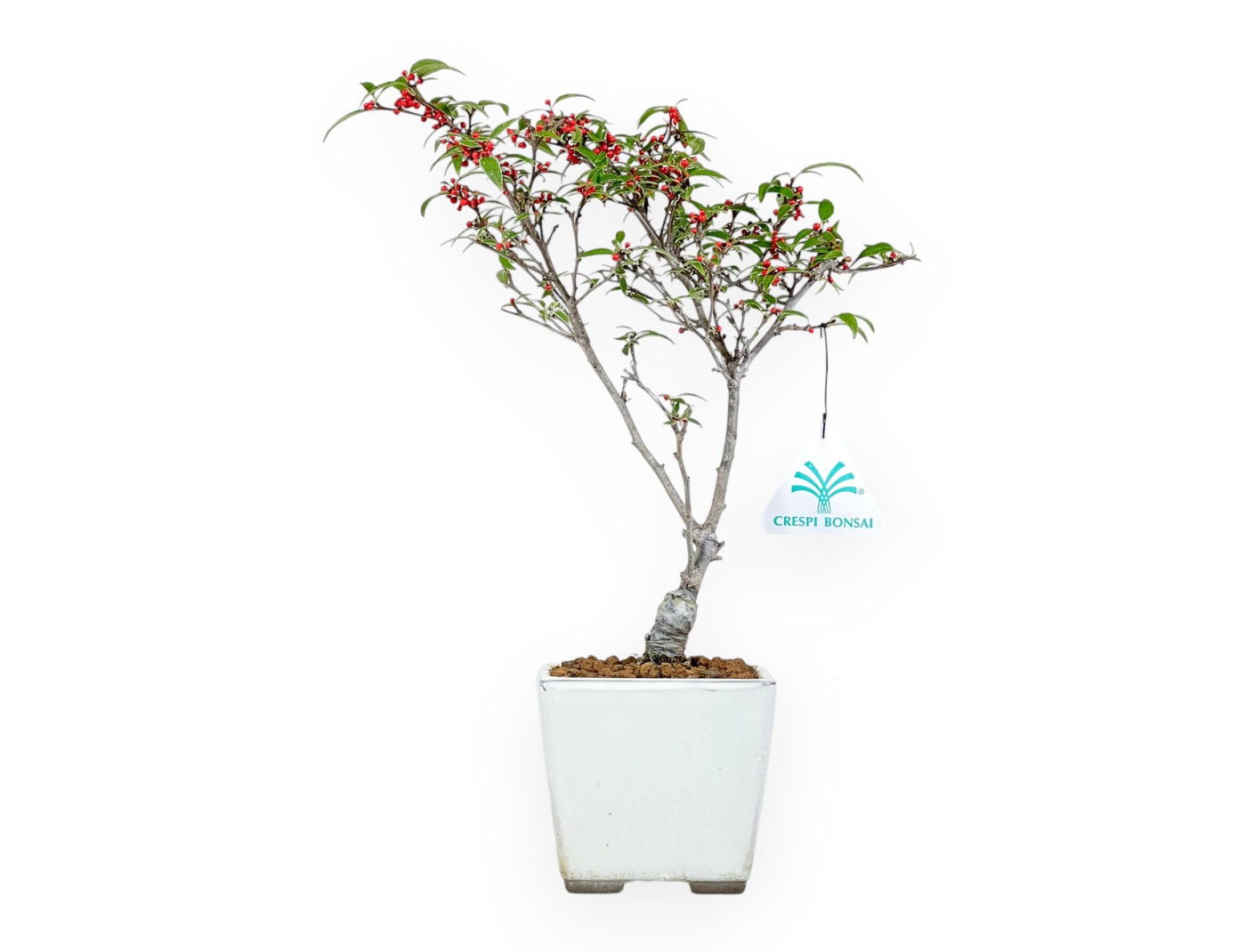 Questo bonsai di Ilex serrata (agrifoglio) appartenente alla varietà caducifoglie da frutto, è una varietà ornamentale apprezzata per la sua fioritura primaverile bianco-rosata e le sue bacche rosse o arancioni, che maturano in autunno e rimangono sulla pianta per gran parte dell’inverno. La chioma, composta da foglie piccole e seghettate, si spoglia in inverno lasciando spazio alle bacche rosse. Coltivato in vaso quadrato in grès smaltato beige, che mette in risalto la bellezza del bonsai, creando un contrasto piacevole con il verde delle foglie e il rosso delle bacche.