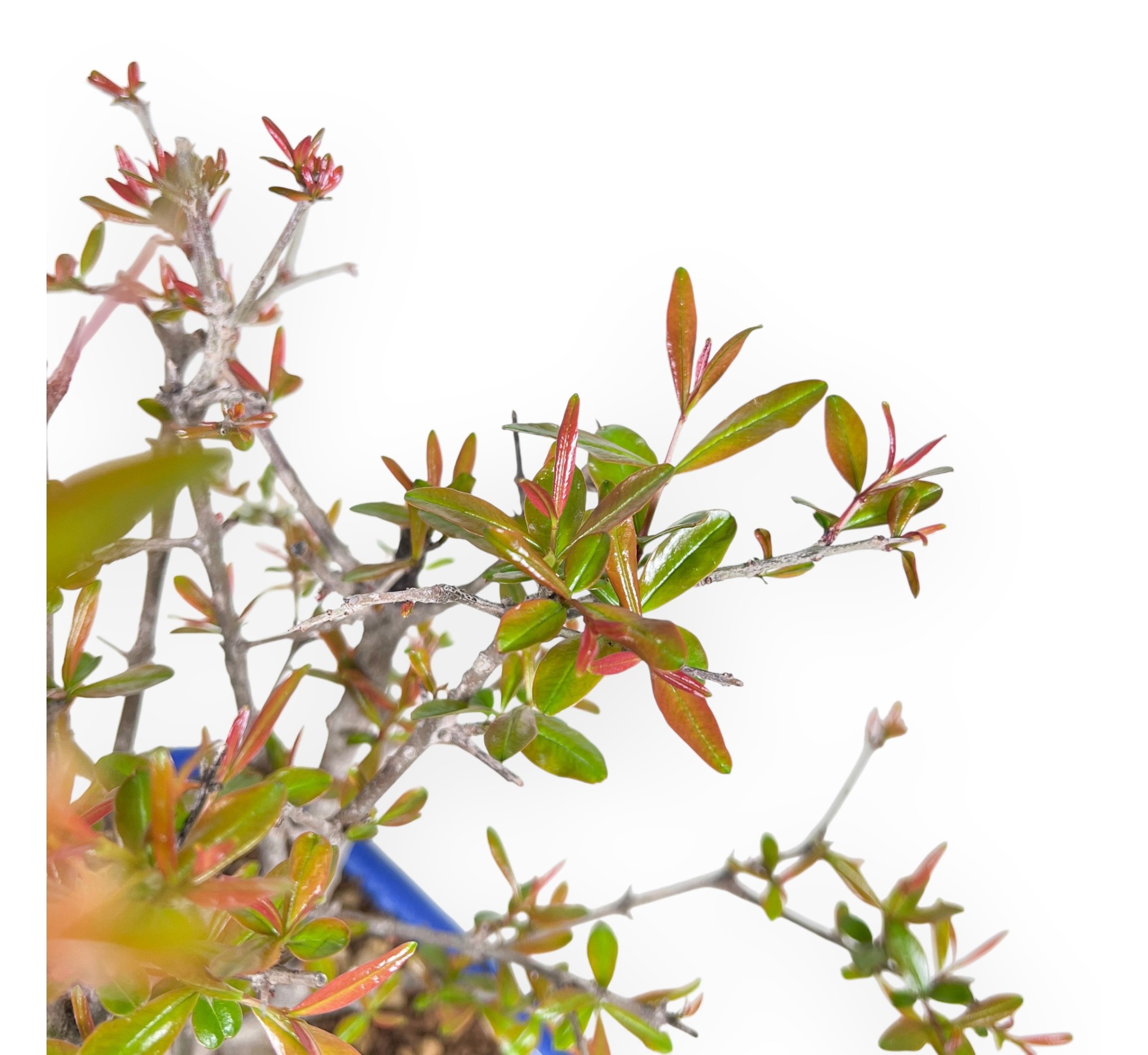 Bonsai di Punica granatum (melograno), caducifoglie da frutto, apprezzata per la sua capacità di unire eleganza, rusticità e spettacolarità stagionale. Le foglie, piccole e lanceolate, si presentano in primavera con giovani germogli rosso-bronzei molto decorativi, verdi brillanti durante la stagione vegetativa, per poi assumere tonalità calde giallo-aranciate in autunno prima della caduta. Durante l’inverno, la pianta si spoglia completamente, mettendo in risalto la struttura elegante del tronco e dei rami. Tra la tarda primavera e l'estate produce fiori di colore rosso-arancio acceso, dalla forma caratteristica e molto ornamentale. Se coltivato nelle giuste condizioni, ai fiori seguono frutti, le melagrane, che maturano verso fine estate-autunno aggiungendo ulteriore valore estetico alla pianta. Coltivato in un vaso rettangolare in grès smaltato blu chiaro, crea un contrasto raffinato con il colore della vegetazione, esaltando la composizione con eleganza.