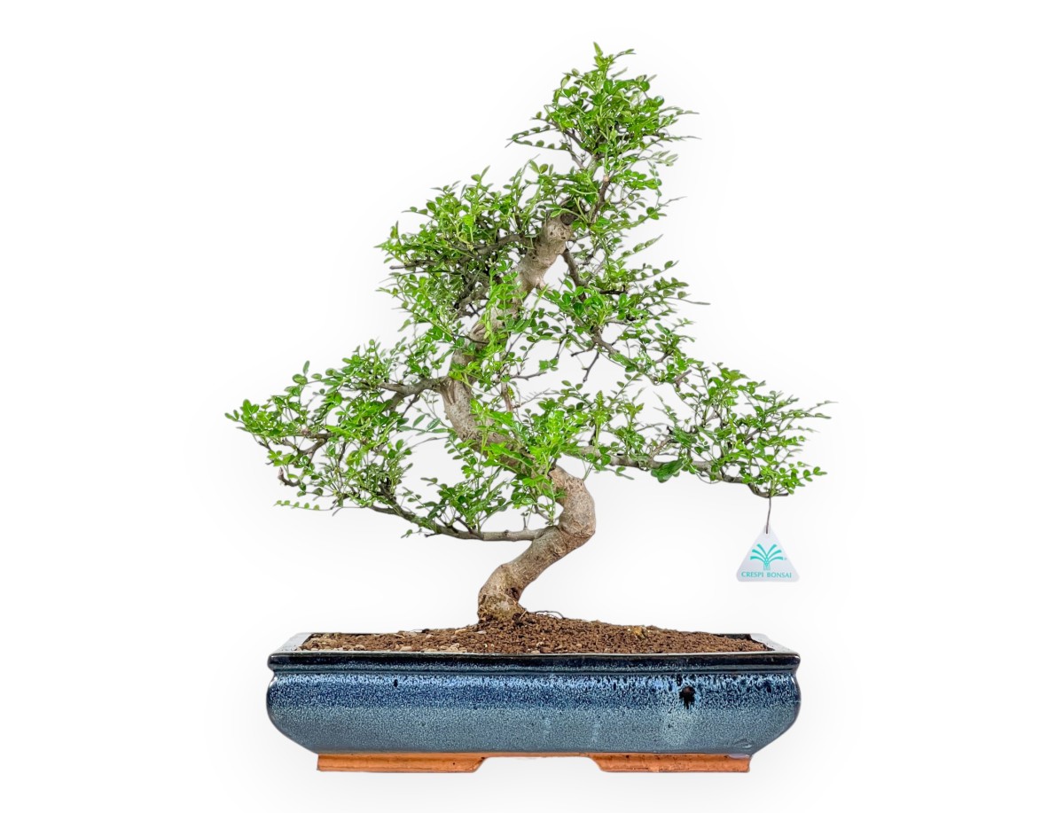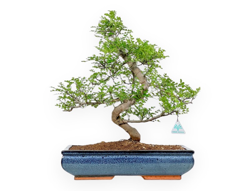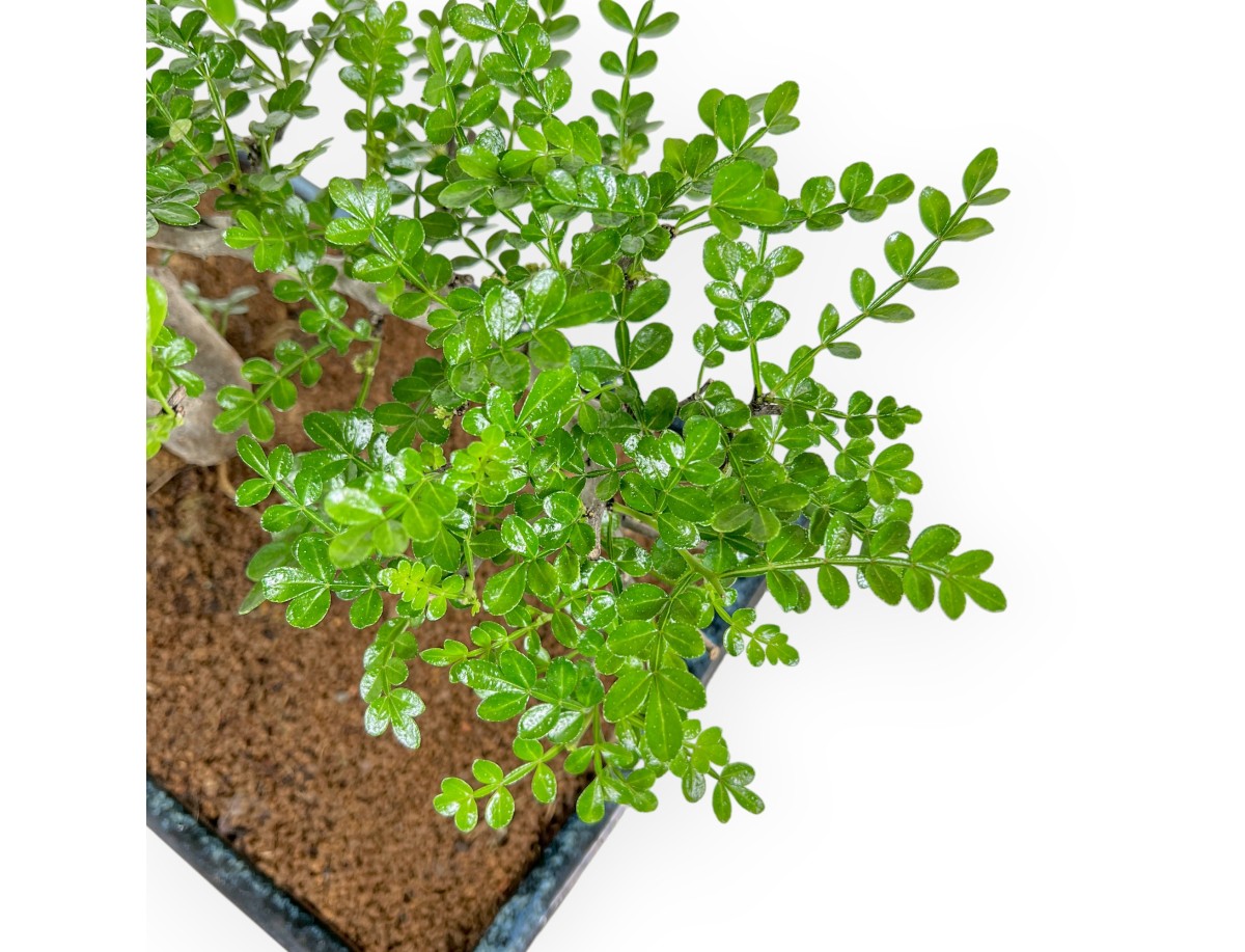 Bonsai sempreverde, in vaso di grès smaltato blu rettangolare