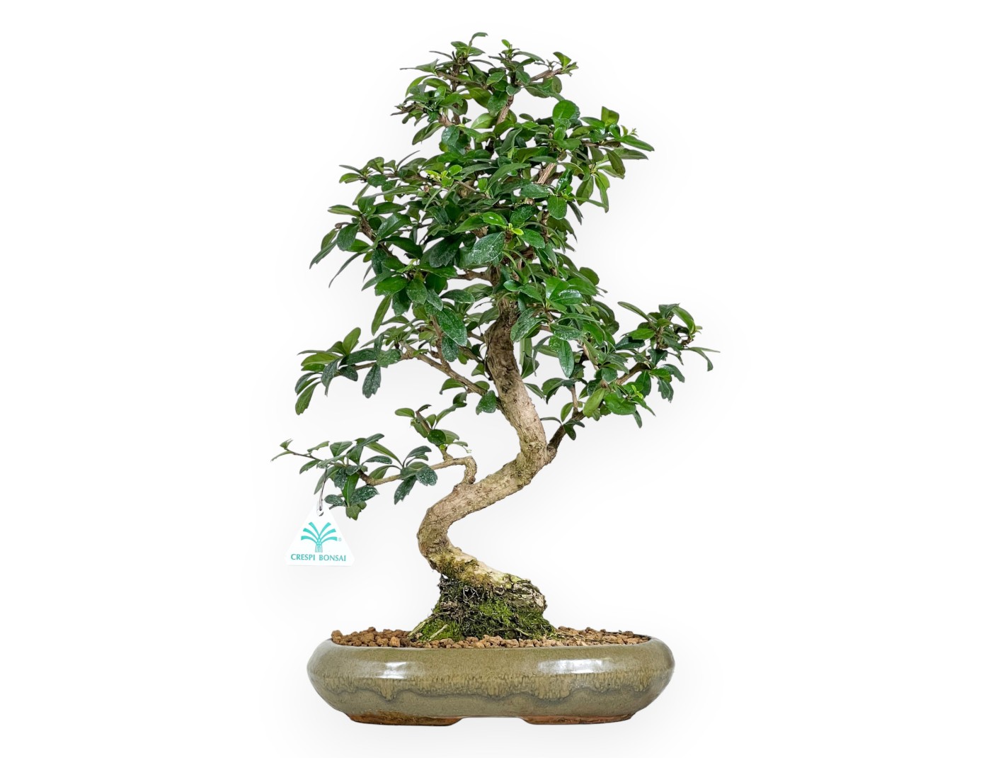 Questo bonsai di Carmona macrophylla (pianta del tè) appartenente alla varietà sempreverde da interno, è apprezzato per la produzione in primavera ed estate di piccoli fiori bianchi a forma di stella. La sua chioma, con foglie lucide e compatte, conferisce un aspetto raffinato. L’aspetto complessivo della pianta è armonioso, con una bella proporzione tra tronco sinuoso a "S", rami e vaso. Coltivato in vaso ovale in grès smaltato verde oliva, crea un equilibrio cromatico che mette in risalto il fogliame brillante senza distogliere l’attenzione dalla forma del bonsai, mentre la forma ovale esalta la stabilità del nebari e la delicatezza complessiva della composizione.