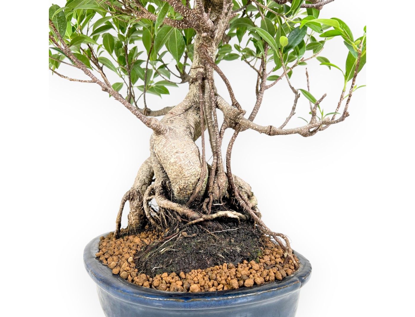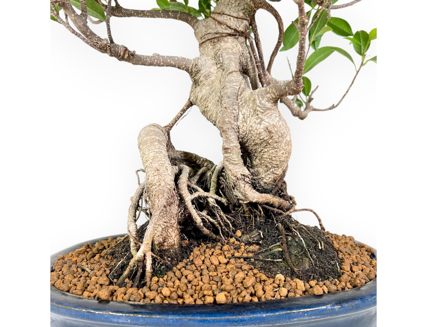 Questo bonsai di Ficus retusa (fico) appartenente alla varietà sempreverde da interno, è apprezzato per la resistenza e la rapida crescita. Presenta una chioma folta con foglie ovali di colore verde intenso, tronco robusto e radici ben sviluppate. Presenta uno stile a radici esposte (neagari) con struttura robusta e ben sviluppata, arricchita da radici aeree caratteristiche di questa specie, che creano un effetto scultoreo e dinamico, mettendo in risalto la bellezza delle radici. Coltivato in vaso ovale in grès smaltato blu, crea un effetto visivo di grande impatto.