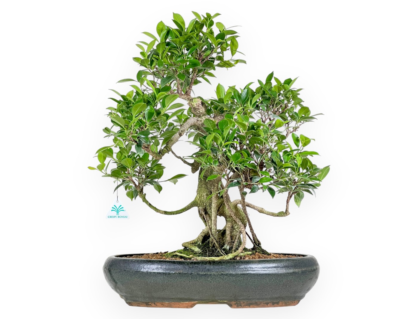 Questo bonsai di Ficus retusa (fico) appartenente alla varietà sempreverde da interno, è apprezzato per la resistenza e la rapida crescita. Presenta una chioma folta con foglie ovali di colore verde intenso, tronco robusto e radici ben sviluppate. Presenta uno stile a palchi, struttura robusta e ben sviluppata, arricchita da radici aeree che rendono questo bonsai caratteristico e di grande fascino, creando un effetto scultoreo e mettendo in risalto la bellezza delle radici. Coltivato in vaso ovale in grès smaltato verde scuro, mette in risalto il colore delle foglie e si abbina perfettamente all’aspetto raffinato del bonsai.