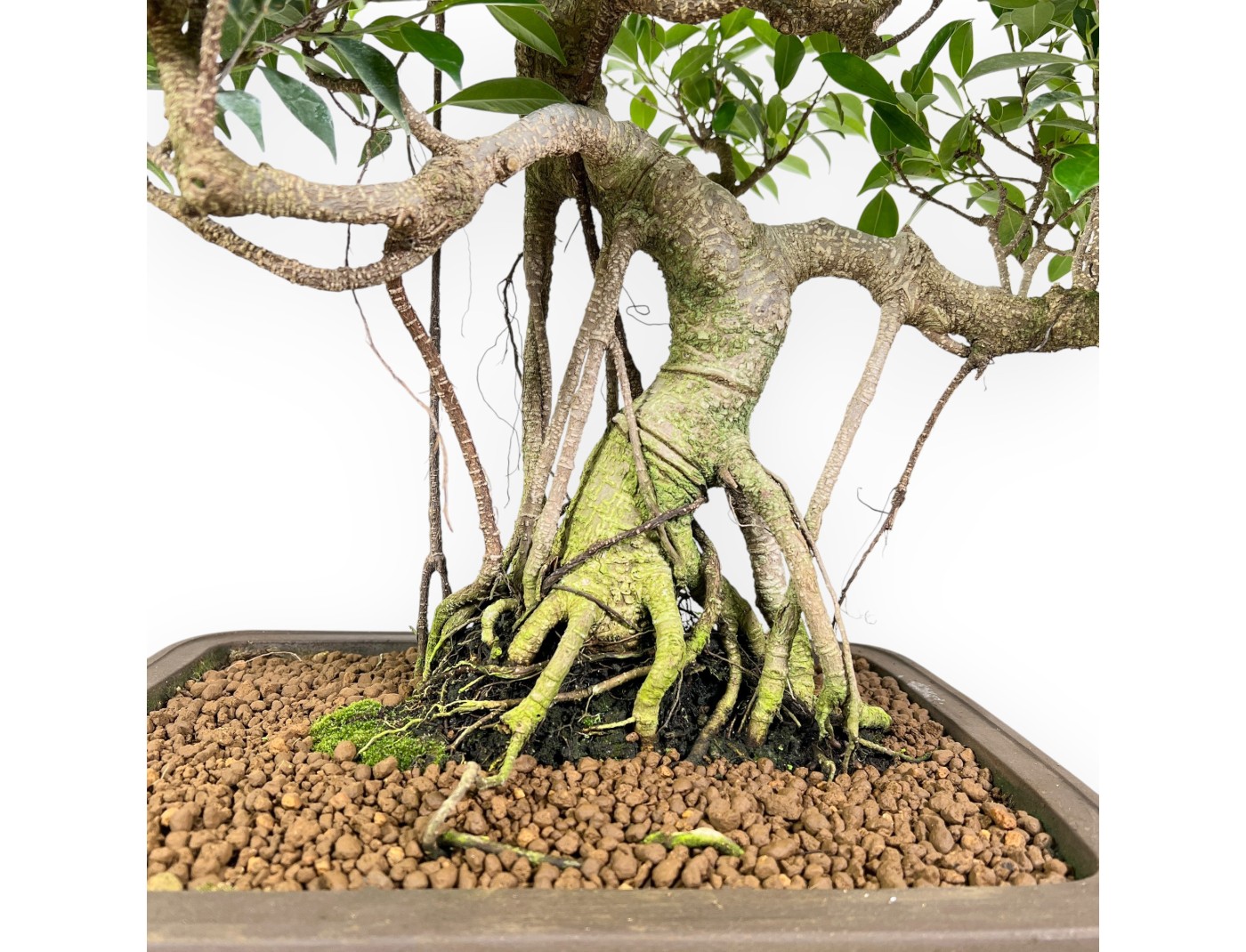 Questo bonsai di Ficus retusa (fico) appartenente alla varietà sempreverde da interno, è apprezzato per la resistenza e la rapida crescita. Presenta una chioma folta con foglie ovali di colore verde intenso, tronco robusto e radici ben sviluppate. Presenta uno stile a palchi, struttura robusta e ben sviluppata, arricchita da radici esposte e radici aeree che rendono questo bonsai caratteristico e di grande fascino, creando un effetto scultoreo e mettendo in risalto la bellezza delle radici. Coltivato in vaso rettangolare in grès non smaltato valorizza la struttura di tronco e radici, e mette in risalto il colore delle foglie abbinandosi all’aspetto raffinato e maestoso del bonsai.