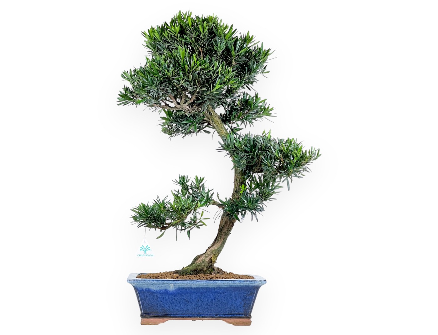 Questo bonsai di Podocarpus macrophylla (Podocarpo) è una conifera sempreverde da interno, apprezzata per la sua resistenza. Se ben coltivato, fiorisce in tarda primavera con piccoli coni riproduttivi, dopodiché produce frutti carnosi verdi che maturano in tonalità rosso-porpora / viola scuro. Presenta struttura con tronco leggermente inclinato e ricurvo dalla linea morbida e naturale che conferisce dinamicità e movimento elengante. La chioma ben strutturata, con foglie verdi intenso e lanceolate, crea volume donando profondità e armonia. Coltivato in vaso rettangolare in grès smaltato blu, crea un'elegante contrasto con il colore delle foglie e valorizza la struttura enfatizzandone eleganza e raffinatezza.