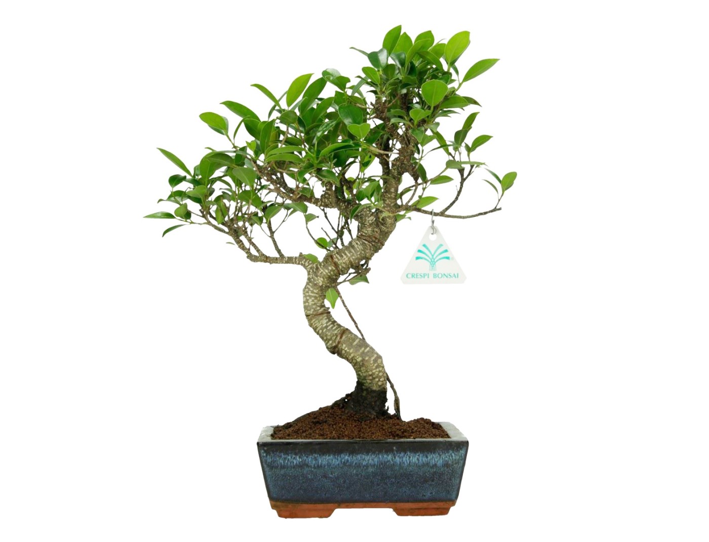 Il bonsai di Ficus retusa (fico) appartenente alla varietà sempreverde da interno, è apprezzato per la resistenza e la rapida crescita. Presenta una chioma folta con foglie ovali di colore verde intenso, tronco robusto e radici ben sviluppate. Presenta uno stile a palchi, con tronco eretto e chioma distribuita su più livelli, creando un effetto armonioso e naturale. Coltivato in vaso rettangolare in grès smaltato blu, contribuisce a enfatizzare l'estetica del bonsai, mantenendo un contrasto delicato con il verde intenso delle foglie.