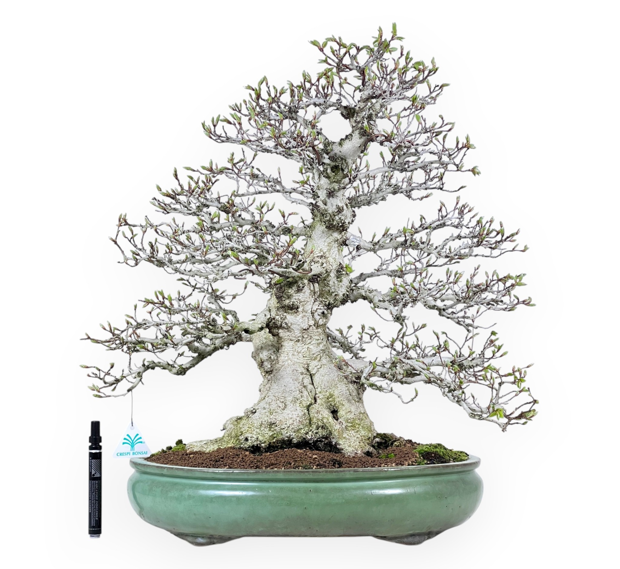 Bonsai esemplare di carpino caratterizzato da altezza senza vaso di 50 cm, dimensione del tronco di 12 cm e nebari di 24 cm. La pianta è coltivata in un vaso ovale in grès smaltato le cui dimensioni sono 40x30xH9 cm.