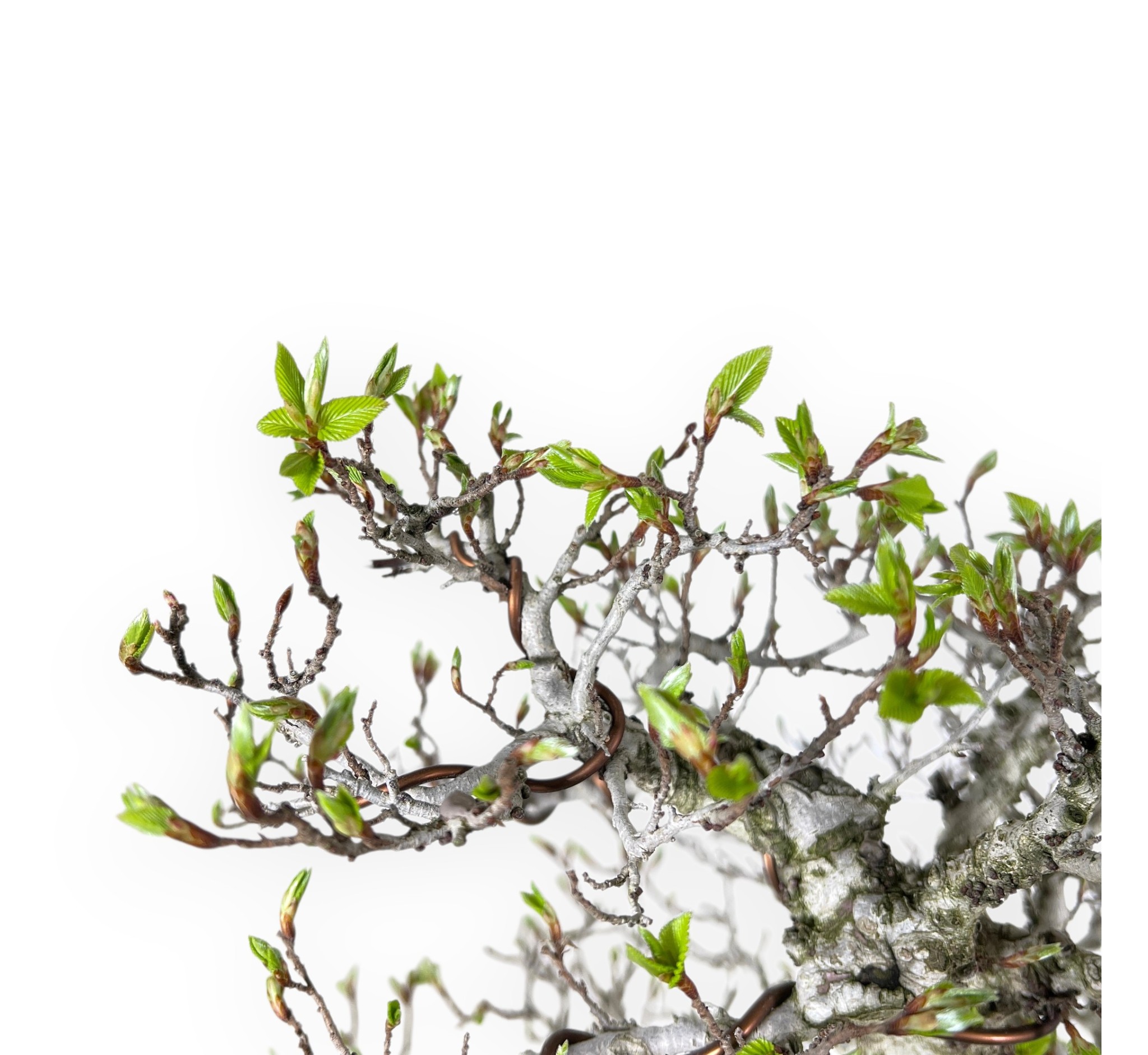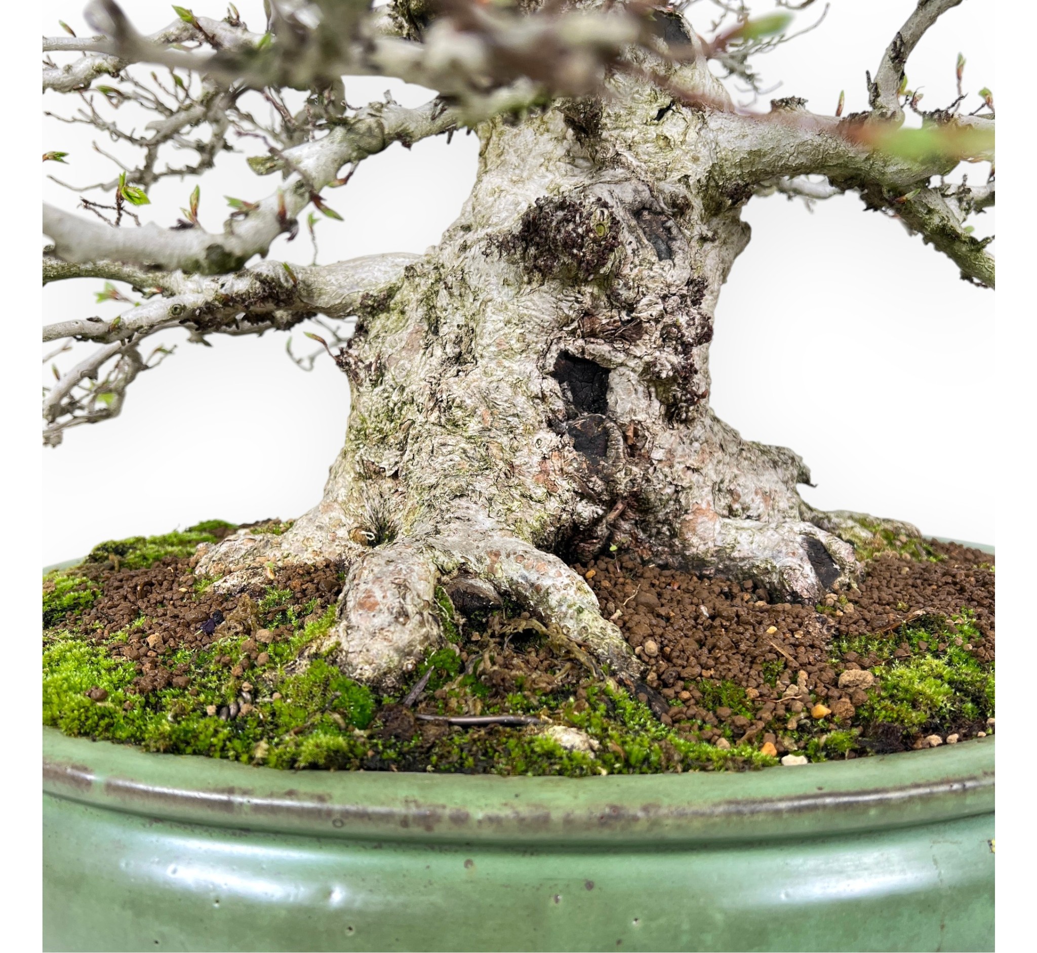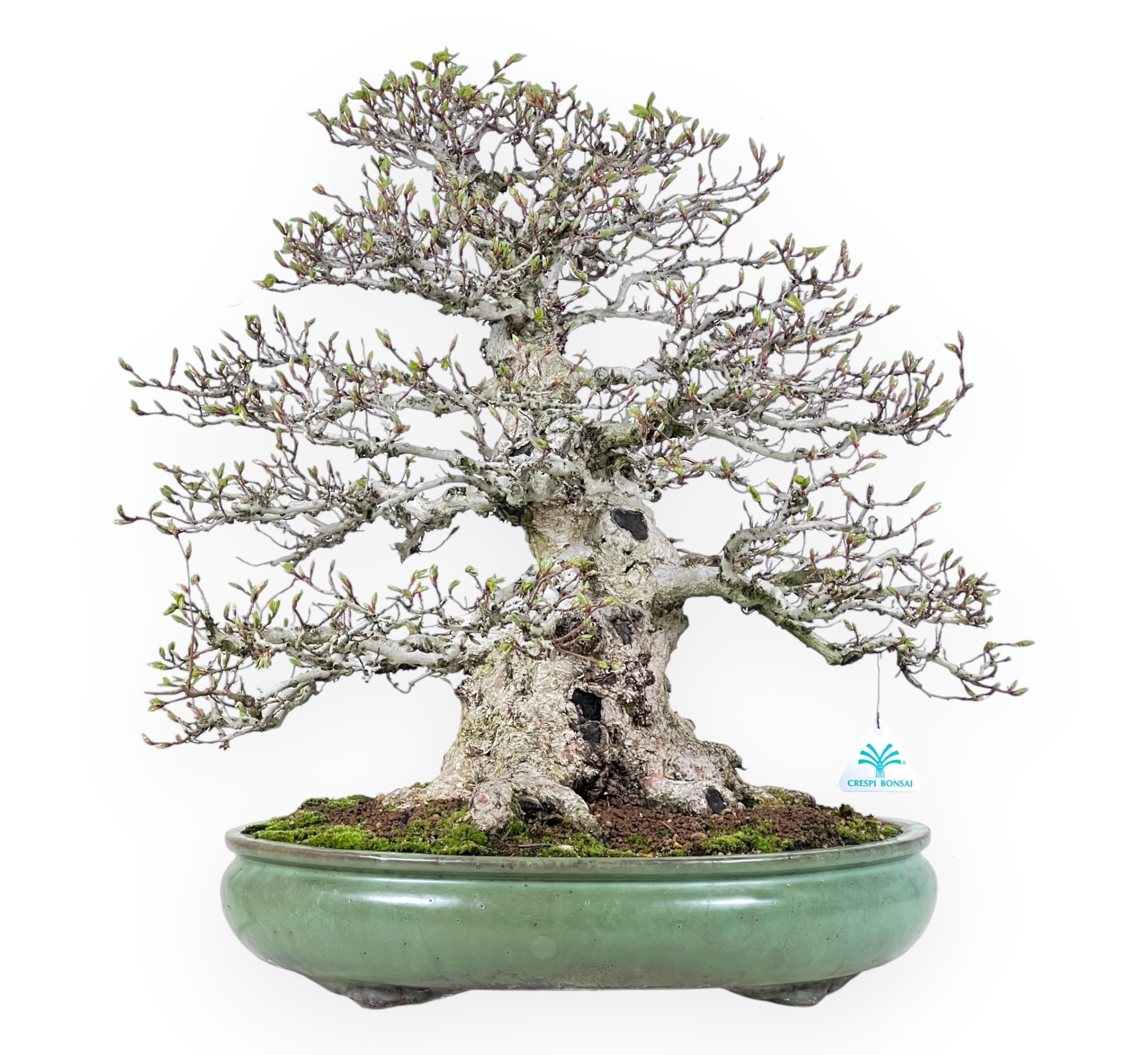 Bonsai esemplare di Carpinus turczaninovii (carpino), specie caducifoglie, apprezzata per la sua corteccia chiara e le foglie dentellate di colore verde brillante. La chioma si colora di giallo dorato all'arancio brunastro in autunno e si spoglia in inverno, donando un aspetto molto decorativo. Coltivato in stile eretto formale (Chokkan), caratterizzato da un tronco dritto e conico che trasmette stabilità, forza ed equilibrio. La ramificazione si sviluppa in modo ordinato e progressivo, creando una struttura armoniosa che esalta la maestosità naturale della pianta. Il vaso ovale in grès smaltato verde, valorizza la pianta e richiama il fogliame e il sottobosco, creando un insieme visivo elegante.