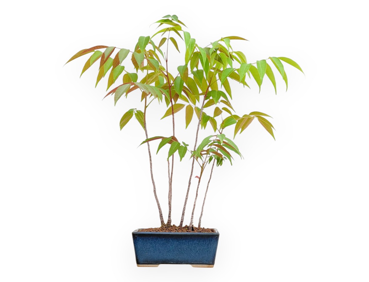 Il bonsai di Rhus succedanea, specie da esterno, presenta piccole foglie lanceolate che nella stagione autunnale si tingono di un intenso e acceso colore rosso prima di cadere in inverno. Questo bonsai è coltivato in un vaso quadrato blu smaltato, che valorizza il colore verde chiaro della chioma nel periodo primaverile e quello rosso nel periodo autunnale. Questa specie presenta un'elegante fioritura estiva. Lo stile in cui è modellato è stile quello a bosco.