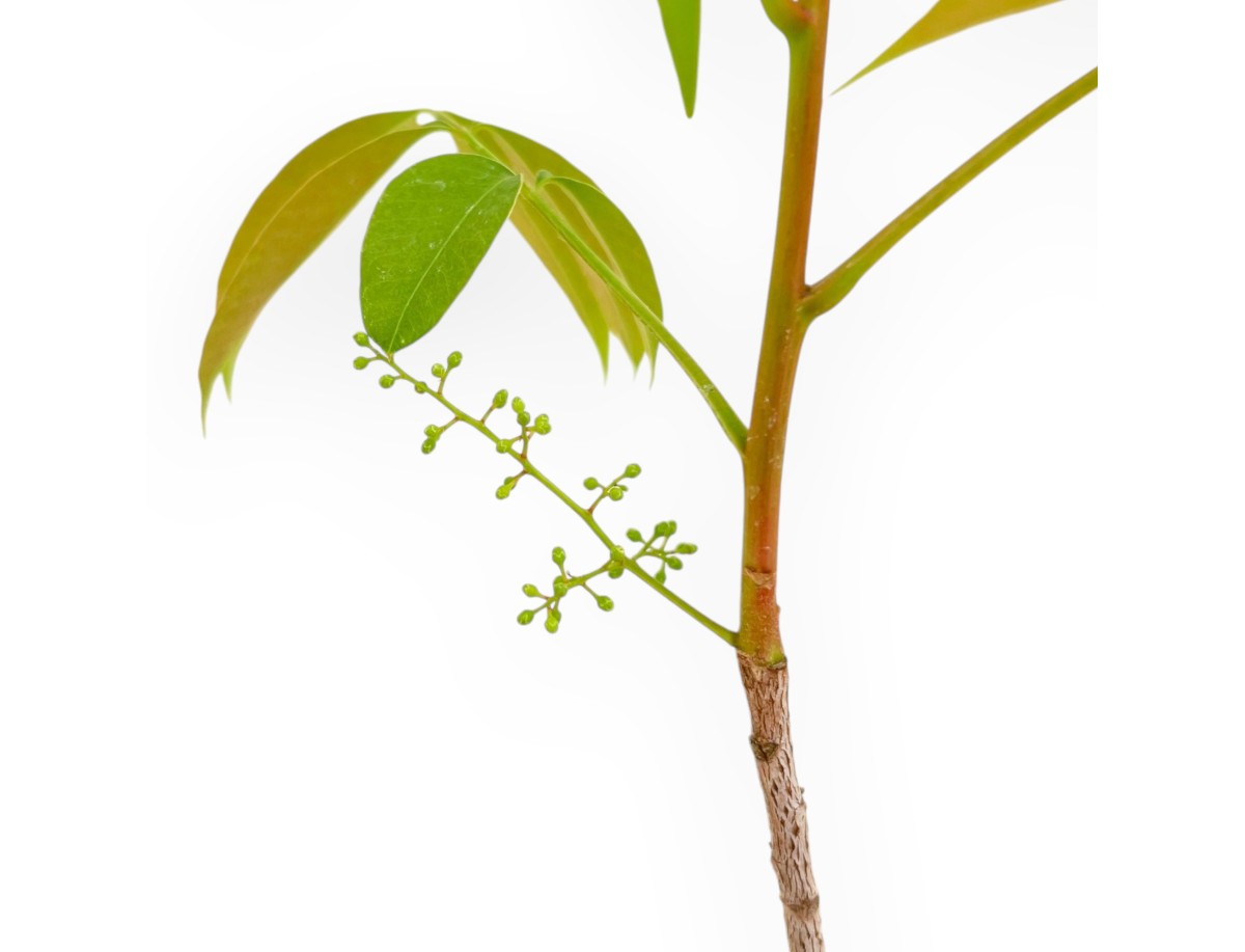Bonsai di Rhus succedanea caratterizzato da altezza senza vaso di 42,5 cm e dimensione del tronco di 0,5 cm. La pianta è coltivata in un vaso quadrato in grès smaltato le cui dimensioni sono 16,5 x 16,5 x H 6,5 cm.