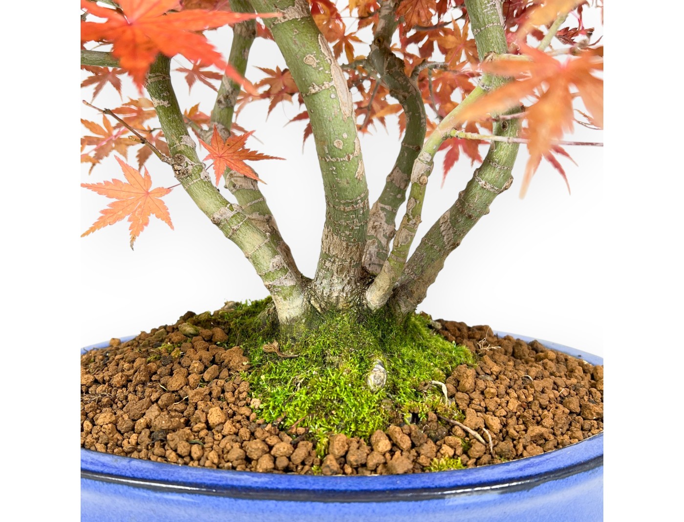 Questo bonsai di Acer palmatum deshojo (acero) è una specie caducifoglie, noto per le sue foglie palmate dai vivaci toni stagionali. La chioma dal verde brillante, si colora di giallo aranciato fino al rosso intenso in autunno e si spoglia in inverno. Coltivato in stile a ceppaia (Kabudachi), presenta più tronchi che si sviluppano da un unico nebari, creando un effetto naturale e armonioso. Il vaso ovale in grès smaltato blu contrasta elegantemente con le sfumature del fogliame esaltandone la bellezza.