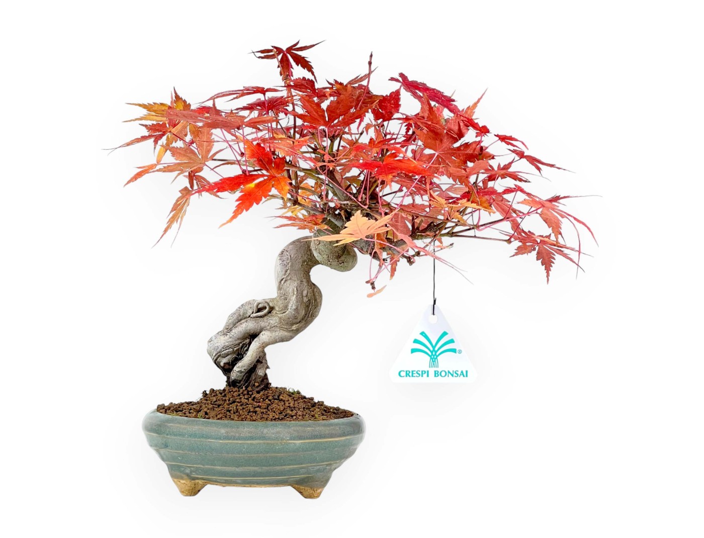 Questo bonsai shohin di Acer palmatum (acero) è una specie caducifoglie, apprezzata per il suo fogliame raffinato che cambia colore con l'avanzare delle stagioni, passando da verde intenso a sfumature giallo aranciato fino al rosso intenso in autunno, e si spoglia in inverno. Presenta uno stile a radici esposte (neagari) con struttura sinuosa e inclinata del tronco, creando un effetto scultoreo e dinamico e mettendo in risalto la bellezza delle radici. È coltivato in un vaso tondo in grès smaltato verde per mettere in risalto le radici e creare un contrasto elegante con il fogliame.