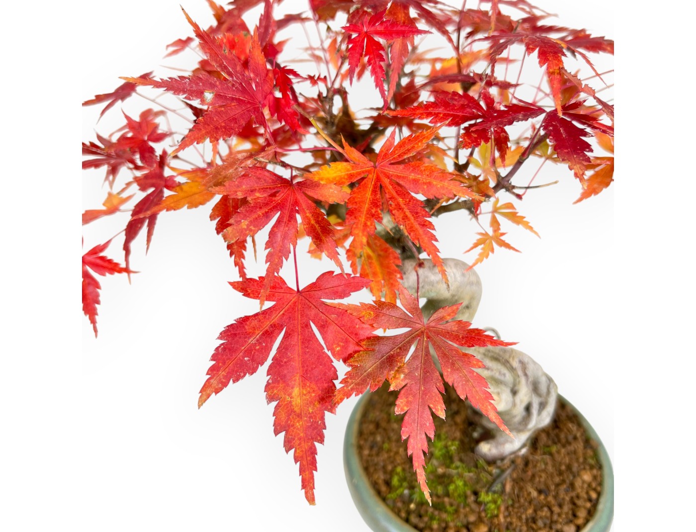 Bonsai di Acero caratterizzato da altezza senza vaso di 20,5 cm, dimensione del tronco di 2 cm e nebari di 4 cm. La pianta è coltivata in un vaso tondo in grès smaltato le cui dimensioni sono Ø12,5xH4,5 cm.