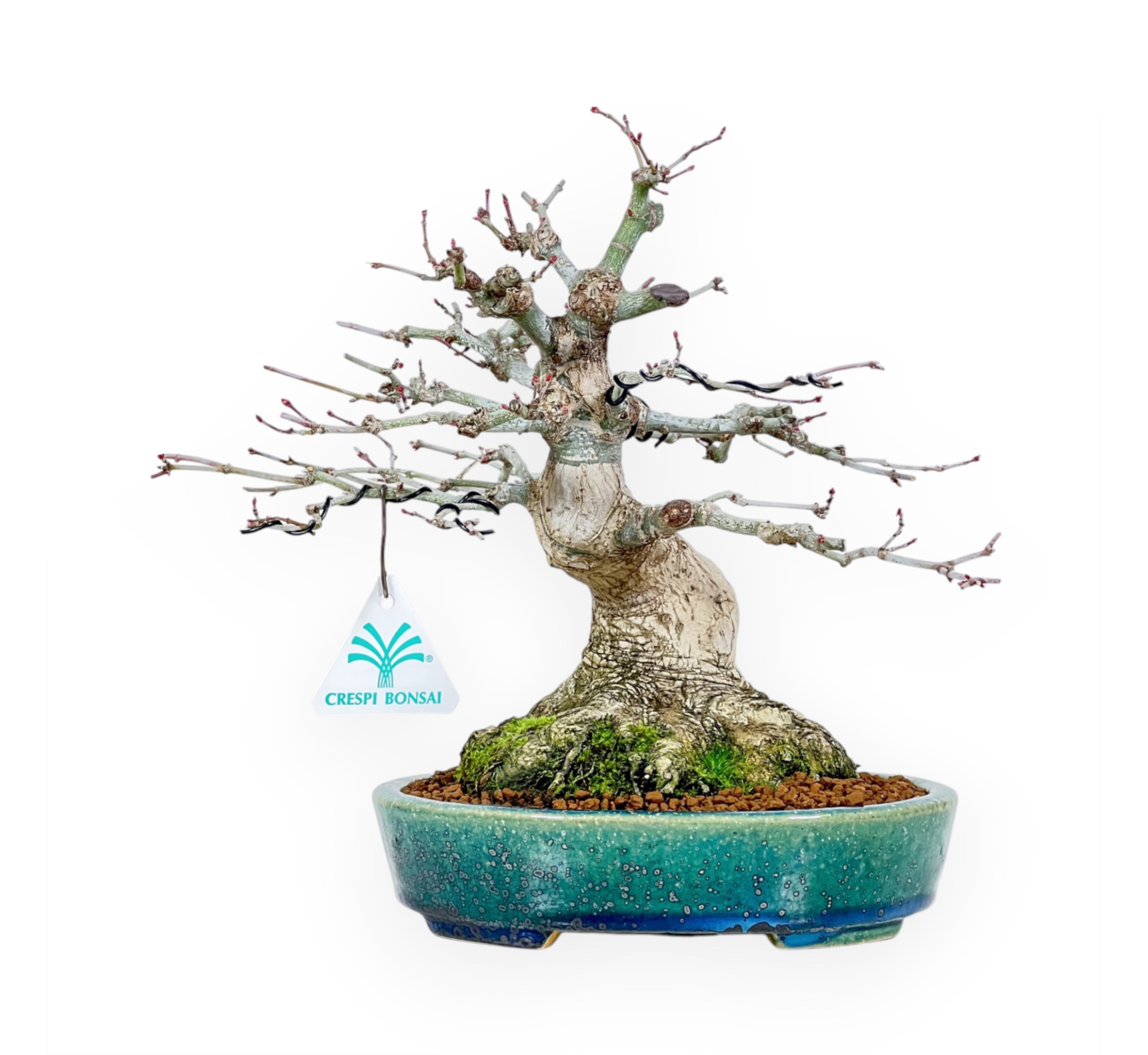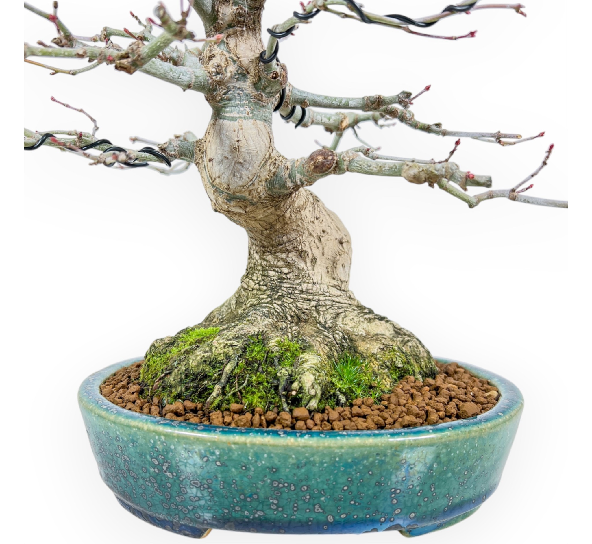 Bonsai shohin di Acer palmatum (acero), specie caducifoglie, apprezzato per le sue foglie palmate dai vivaci toni stagionali. La chioma dal verde brillante, si colora di giallo aranciato fino al rosso intenso in autunno e si spoglia in inverno. Presenta un tronco sinuoso e ben sviluppato che conferisce un aspetto naturale ed elegante, rami sottili che si diramano verso l'alto e un nebari ben strutturato che dona maggiore stabilità alla pianta. Coltivato in un raffinato vaso Koyo, ovale in grès smaltato verde-blu con leggere sfumature e texture che valorizzano il tronco chiaro, e contrasta elegantemente con le sfumature del fogliame esaltandone la bellezza.