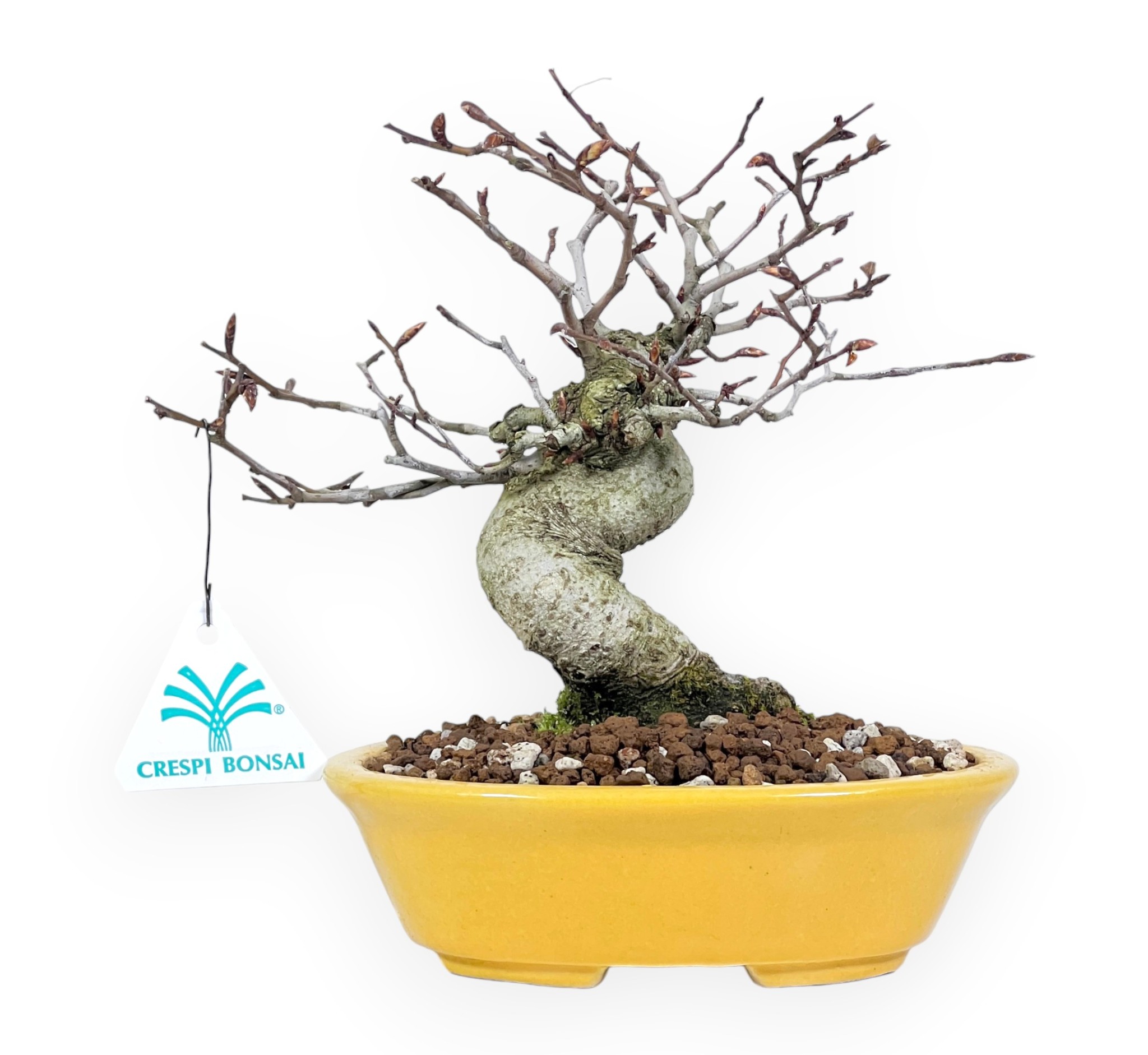 Shohin bonsai di Fagus crenata (faggio), specie caducifoglie dalle foglie lanceolate. La chioma dal verde brillante, si colora di giallo aranciato fino a diventare bruna in autunno e si spoglia in inverno. Presenta tronco con base solida, ramificazioni armoniose e ben bilanciate, creando una pianta che emana eleganza e forza. Lo stile eretto informale (Moyogi), è caratterizzato da un tronco con leggera torsione che mostra forza e stabilità. La ramificazione si sviluppa in modo ordinato e ben bilanciato, creando un effetto di eleganza naturale. Coltivato in un vaso ovale in grès smaltato giallo, crea un contrasto delicato con la tonalità naturale del tronco e delle radici, enfatizzando la bellezza complessiva della pianta.