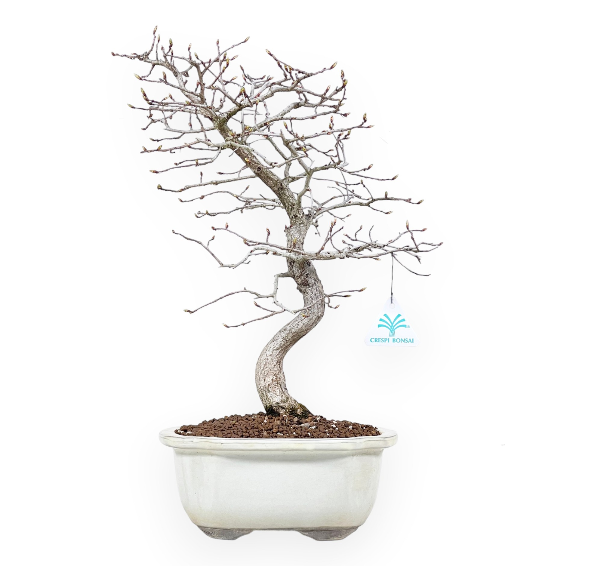 Bonsai di Carpinus turczaninovii (carpino), caducifoglie, è apprezzato per la sua corteccia chiara e le foglie dentellate di colore verde brillante. La chioma si colora di giallo dorato all'arancio brunastro in autunno e si spoglia in inverno, donando un aspetto molto decorativo. Presenta una struttura che si sviluppa con una curva delicata lungo il tronco in modo armonioso e naturale, i rami ben distanziati si diramano con equilibrio creando una struttura che conferisce profondità all’insieme. Il vaso a nuvola in grès smaltato crema, crea contrasto con il verde brillante delle foglie in primavera ed estate oppure con il giallo-aranciato tipico del periodo autunnale.