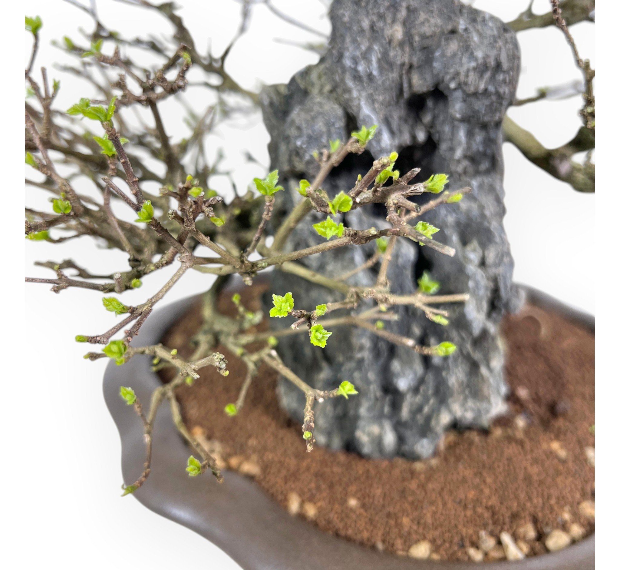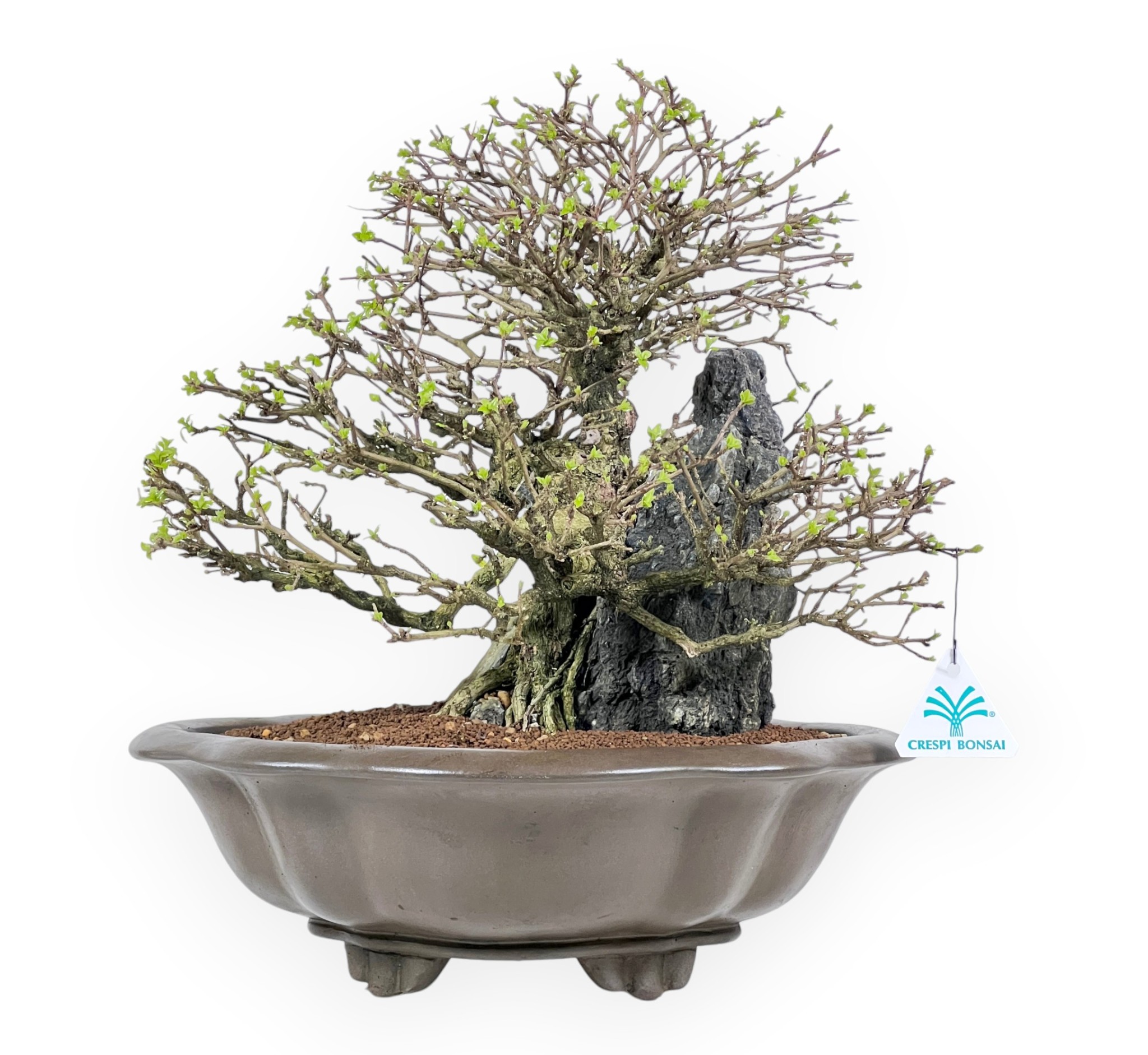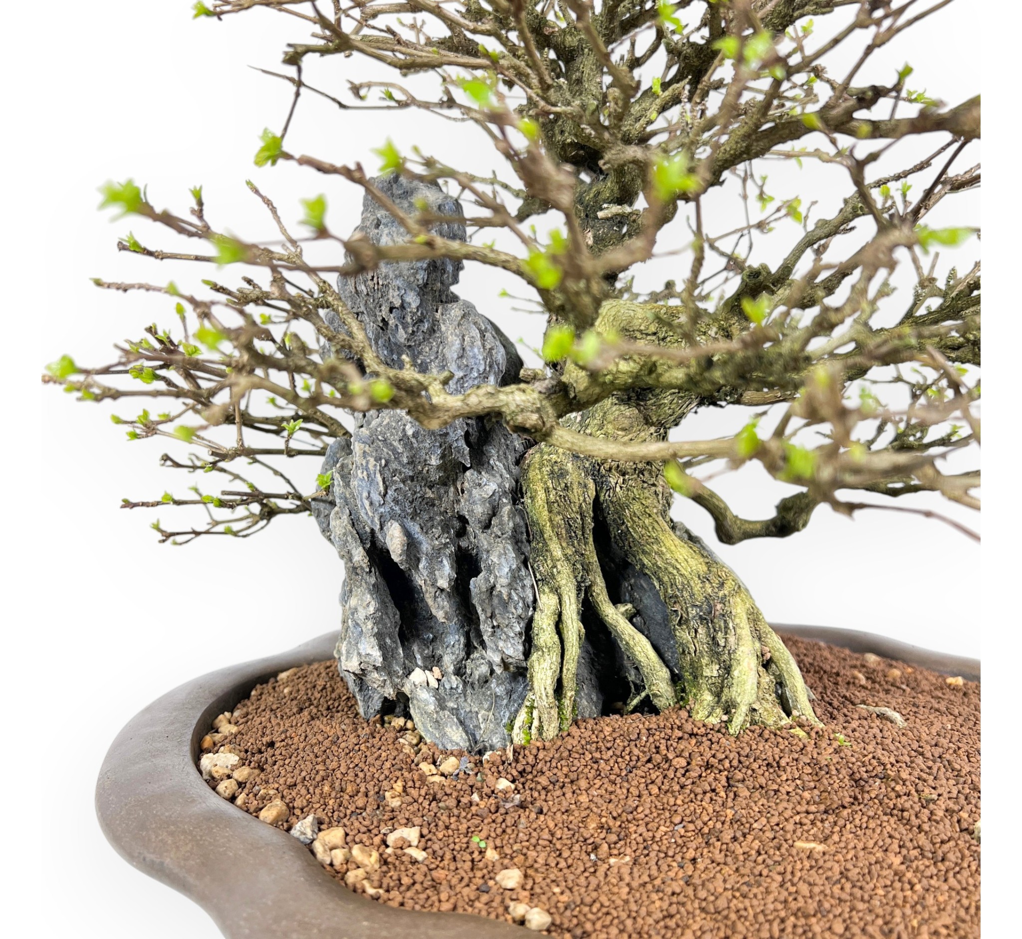 Il Bonsai di Premna japonica, specie caducifoglia apprezzata per il suo fogliame fine e compatto, è capace di offrire un aspetto ordinato ed elegante durante tutta la stagione vegetativa. In primavera e in estate le foglie si presentano di un verde brillante, mentre in autunno assumono tonalità più calde prima della caduta, lasciando intravedere in inverno la struttura nuda della pianta e la particolare impostazione stilistica. Presenta uno stile su roccia (Seki-joju), in cui le radici avvolgono e si aggrappano saldamente alla pietra, creando una composizione suggestiva e dinamica che richiama gli ambienti naturali più impervi. Le radici, ben evidenti e armoniosamente distribuite, scendono verso il substrato integrandosi con il tronco e contribuendo a una forte presenza scenica. È coltivato in un vaso a nuvola in grès non smaltato dalle linee morbide che si armonizzano con la composizione e ne esaltano l’equilibrio complessivo, creando un insieme raffinato ed evocativo.