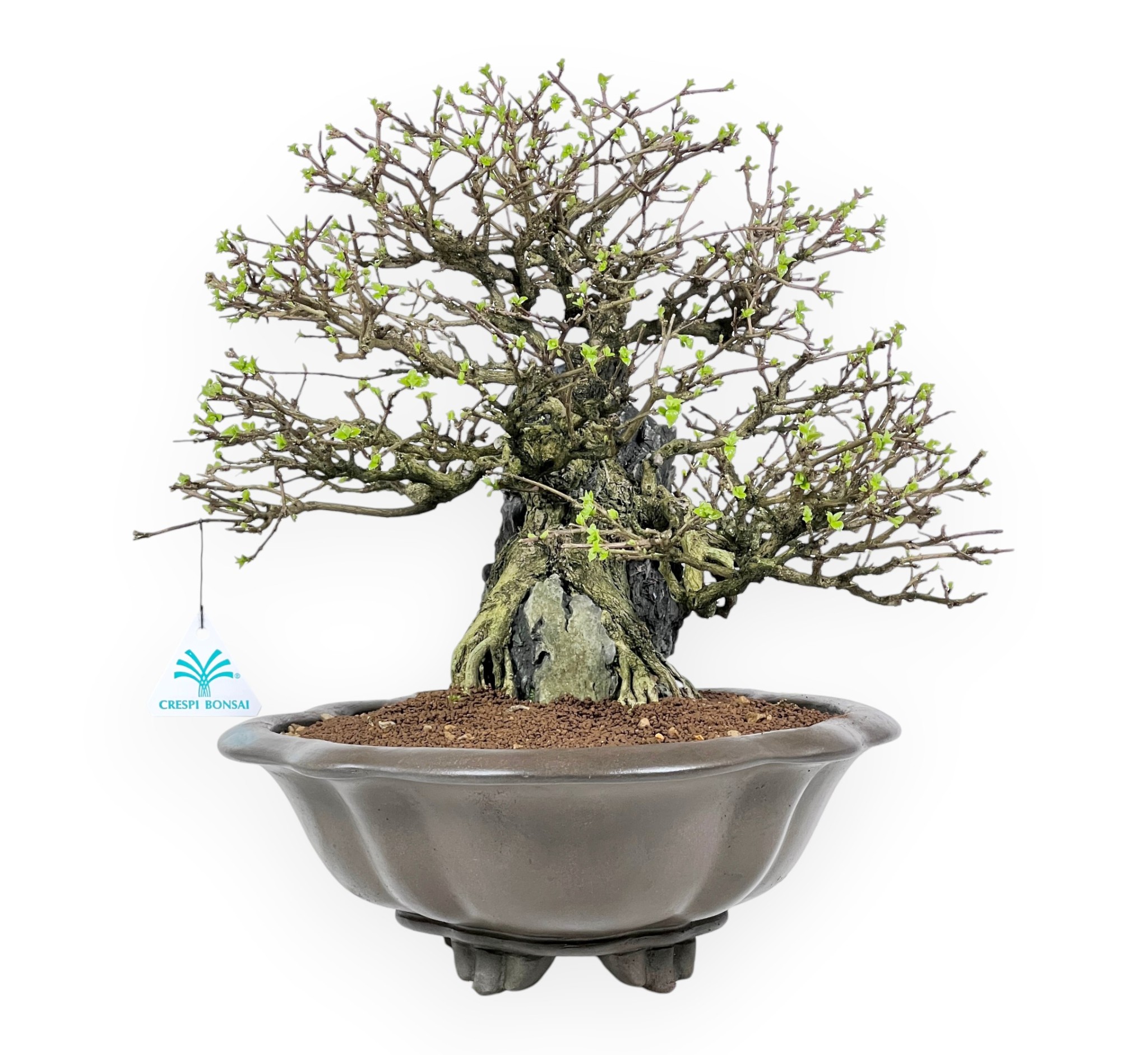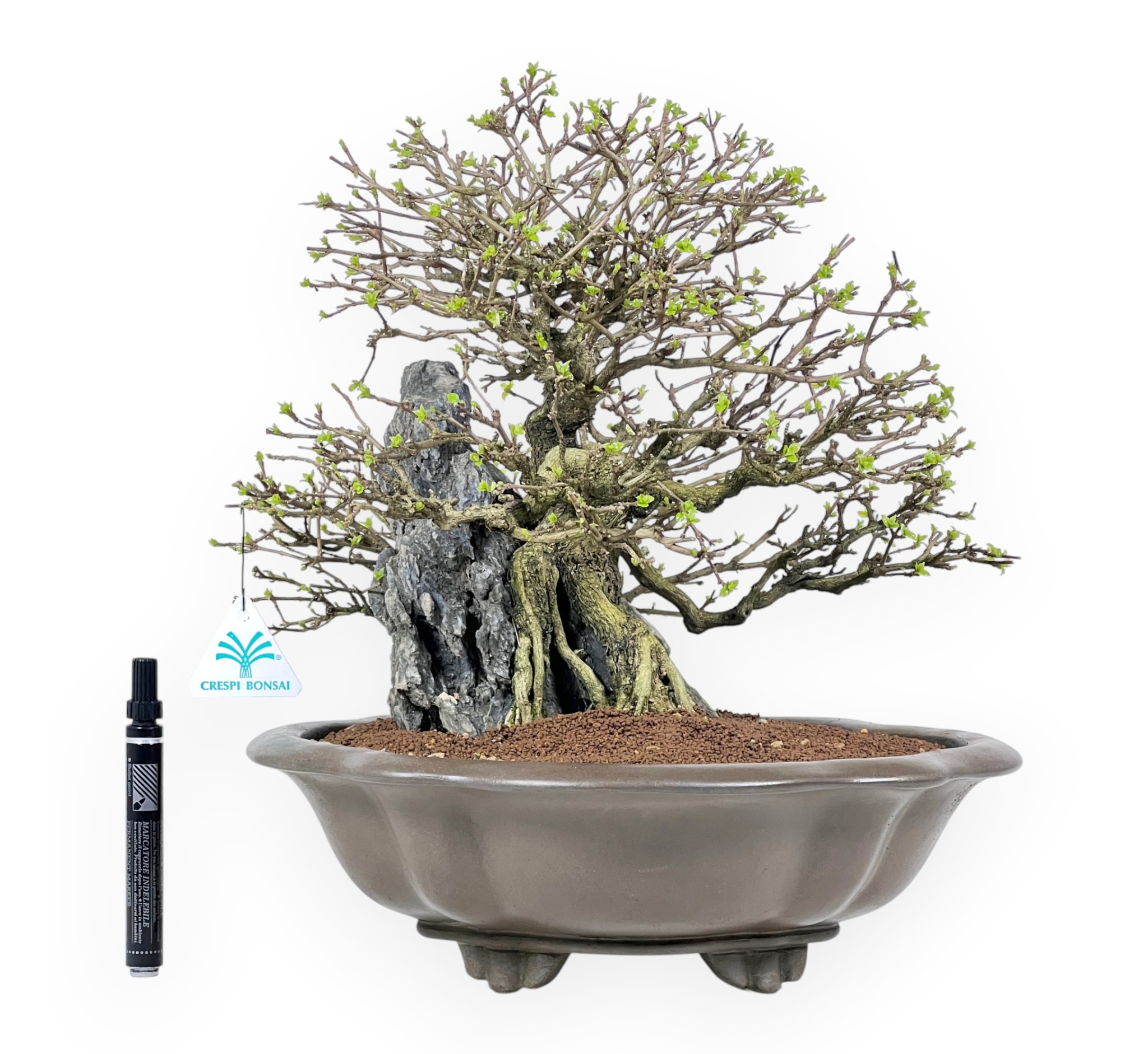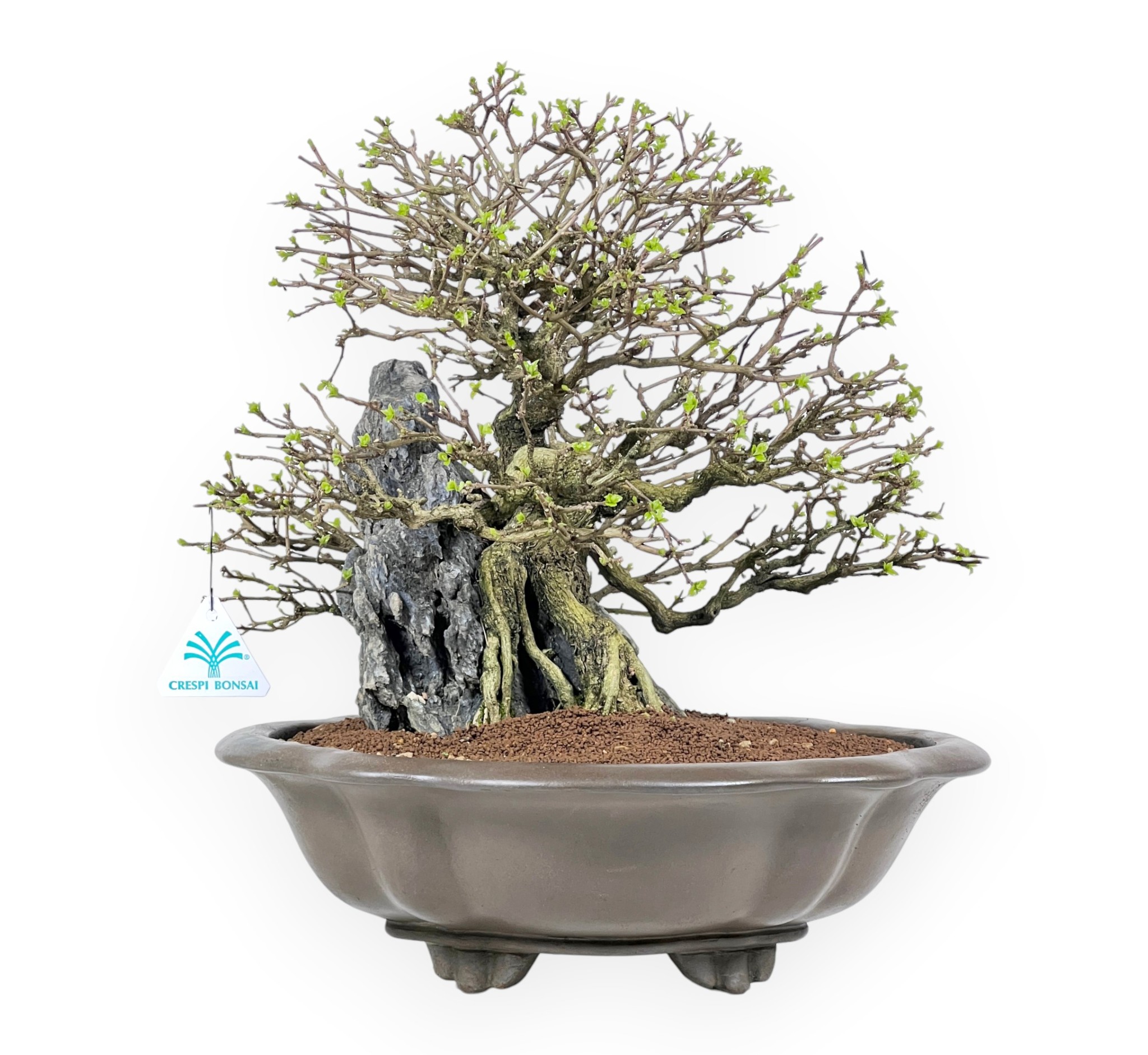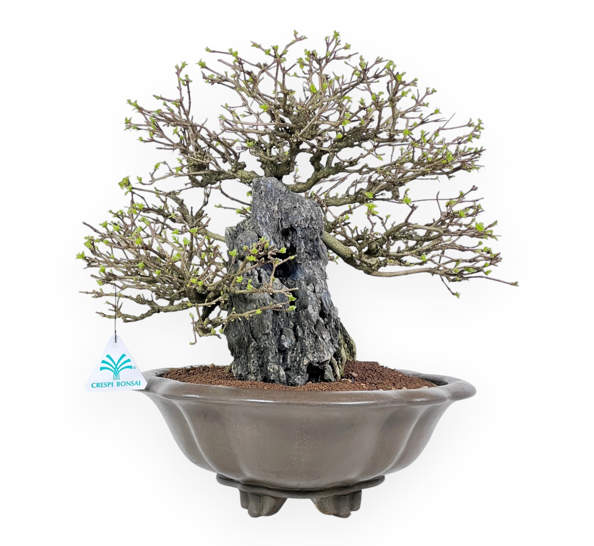 Il Bonsai di Premna japonica, specie caducifoglia apprezzata per il suo fogliame fine e compatto, è capace di offrire un aspetto ordinato ed elegante durante tutta la stagione vegetativa. In primavera e in estate le foglie si presentano di un verde brillante, mentre in autunno assumono tonalità più calde prima della caduta, lasciando intravedere in inverno la struttura nuda della pianta e la particolare impostazione stilistica. Presenta uno stile su roccia (Seki-joju), in cui le radici avvolgono e si aggrappano saldamente alla pietra, creando una composizione suggestiva e dinamica che richiama gli ambienti naturali più impervi. Le radici, ben evidenti e armoniosamente distribuite, scendono verso il substrato integrandosi con il tronco e contribuendo a una forte presenza scenica. È coltivato in un vaso a nuvola in grès non smaltato dalle linee morbide che si armonizzano con la composizione e ne esaltano l’equilibrio complessivo, creando un insieme raffinato ed evocativo.