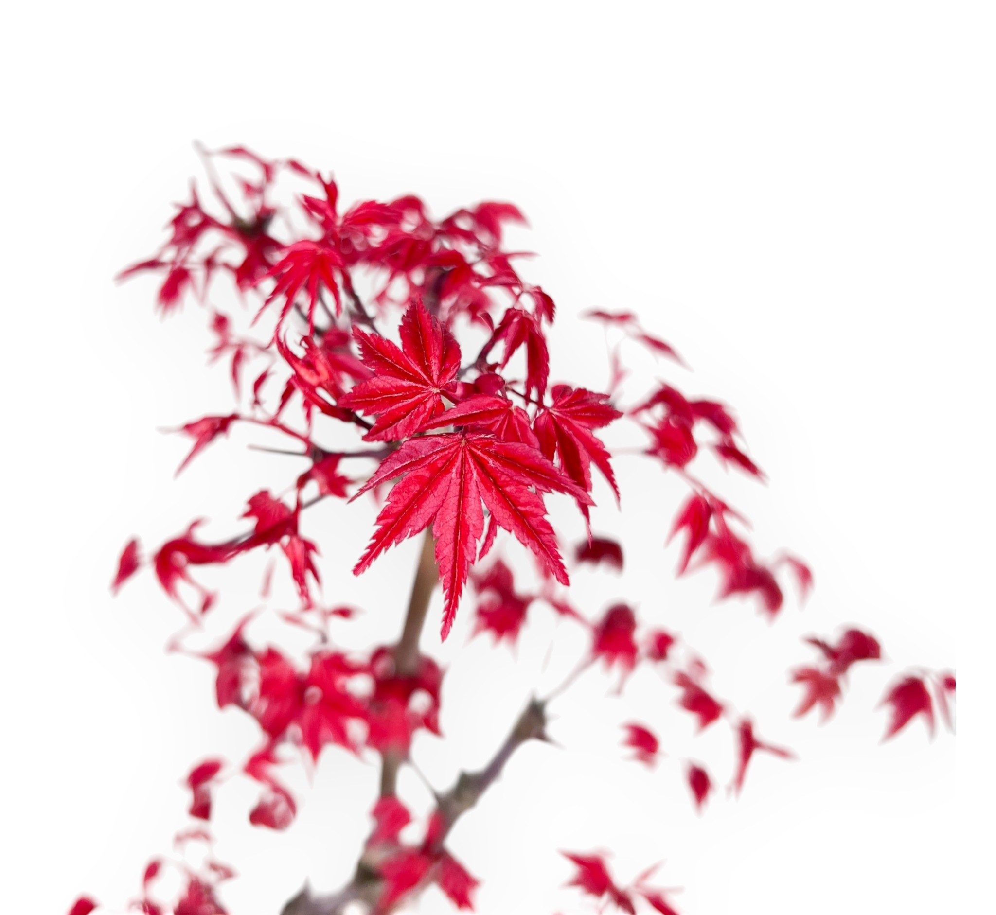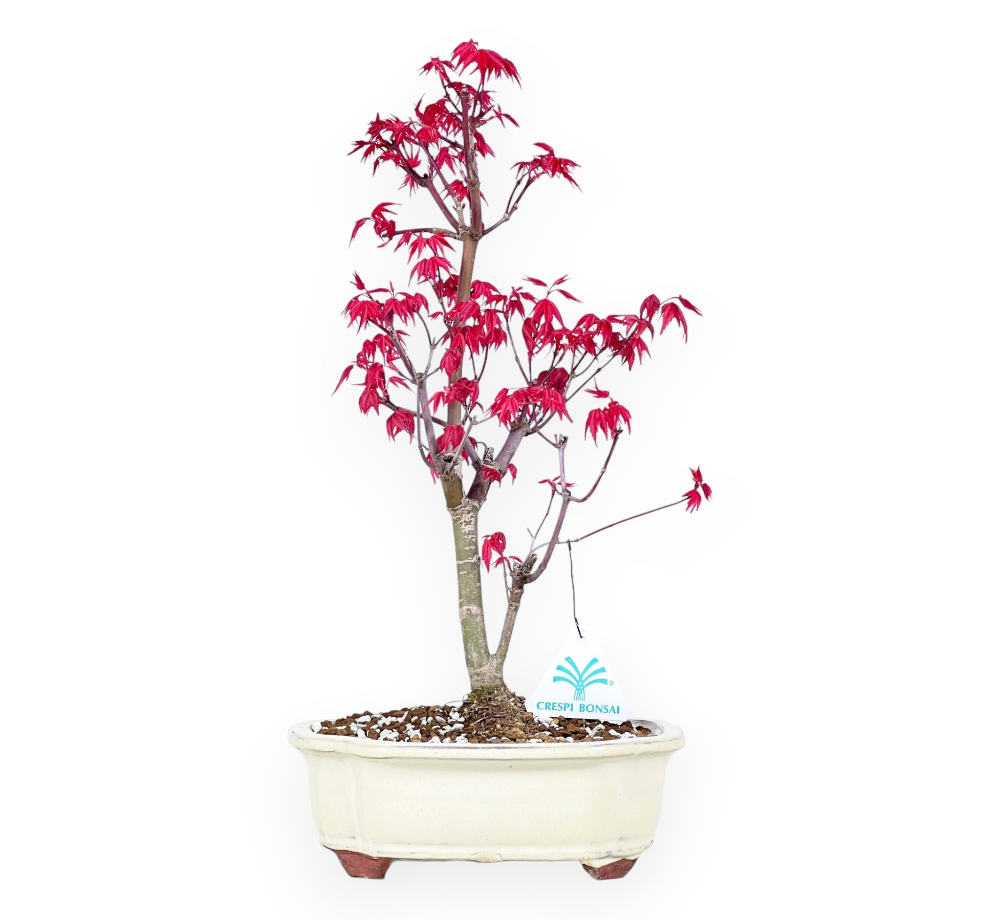 Bonsai di Acer palmatum deshojo (acero), specie caducifoglie, apprezzata per il suo fogliame raffinato che cambia colore con l'avanzare delle stagioni, passando da verde intenso a sfumature giallo aranciato fino al rosso intenso in autunno, finché il bonsai si spoglia in inverno. In stile multitronco, è caratterizzato da due tronchi che partono dalla base, per creare una composizione equilibrata e dinamica che dona stabilità e armonia al bonsai. Coltivato in un vaso a nuvola in grès smaltato crema, completa il bonsai esaltando la bellezza della pianta, donando equilibrio e raffinatezza.
