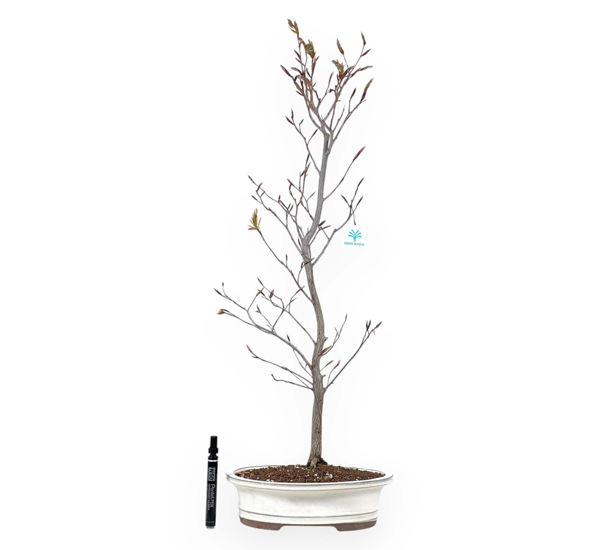 Bonsai di Faggio caratterizzato da altezza senza vaso di 71,5 cm, dimensione del tronco di 2,5 cm e nebari di 7 cm. La pianta è coltivata in un vaso ovale in grès smaltato le cui dimensioni sono 26x21,5xH7,5 cm.