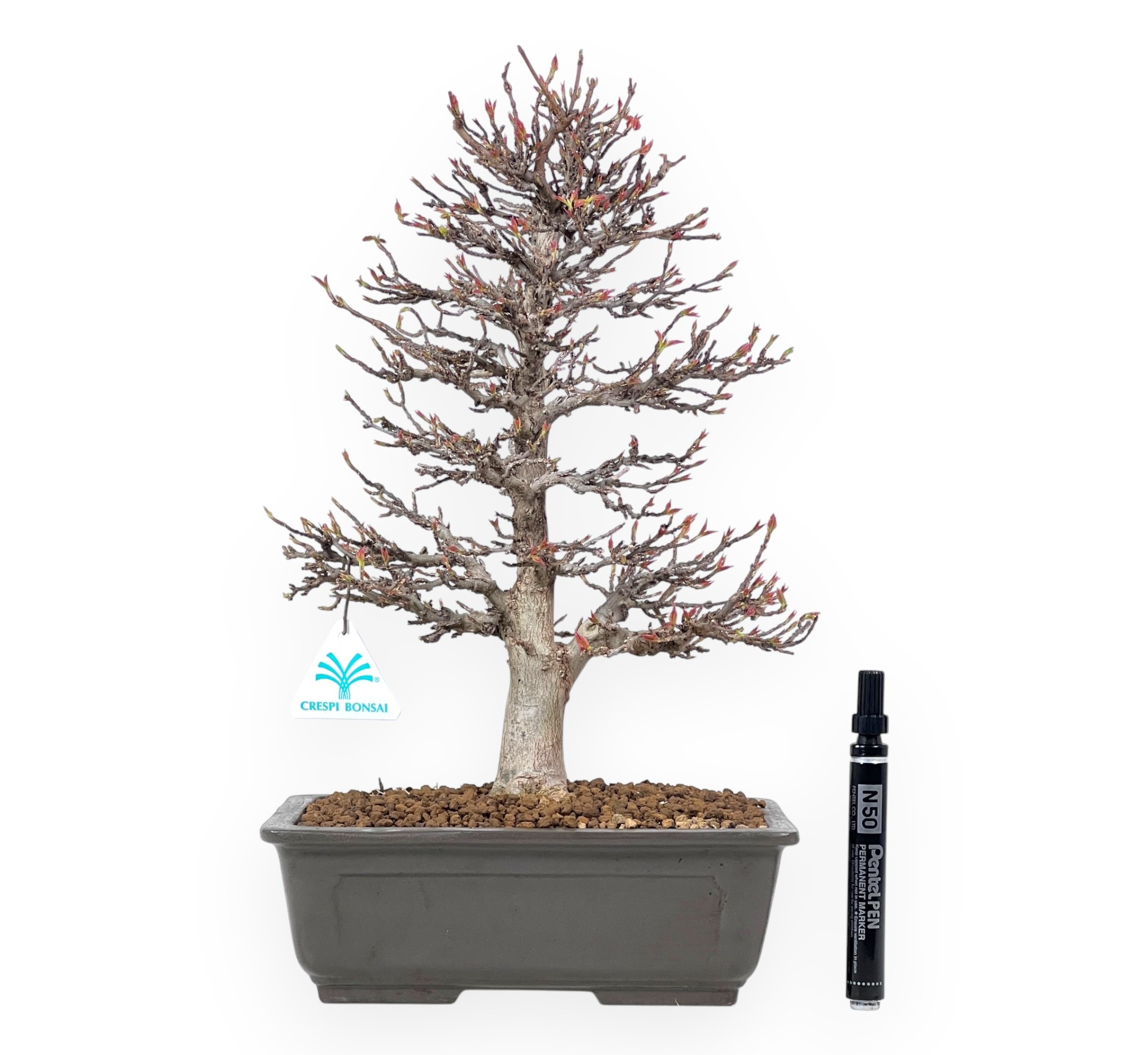 Bonsai di Acer buergerianum (acero), specie caducifoglie, apprezzata per il suo fogliame distintivo che cambia colore con l'avanzare delle stagioni. Durante la primavera e l'estate le sue foglie sono verdi vivaci, mentre in autunno si tingono di sfumature rosse e arancioni, finché il bonsai si spoglia in inverno. Lavorato in stile eretto formale (Chokkan) si distingue per il tronco perfettamente verticale e conico, che trasmette stabilità, forza e maturità. I rami si dispongono in modo ordinato e alternato lungo il tronco, diminuendo progressivamente di lunghezza verso l’apice, creando una silhouette equilibrata e armoniosa che richiama la crescita naturale degli alberi in ambienti aperti. Coltivato in un vaso rettangolare in grès non smaltato, esalta la bellezza del bonsai e gli conferisce un aspetto dinamico e raffinato.