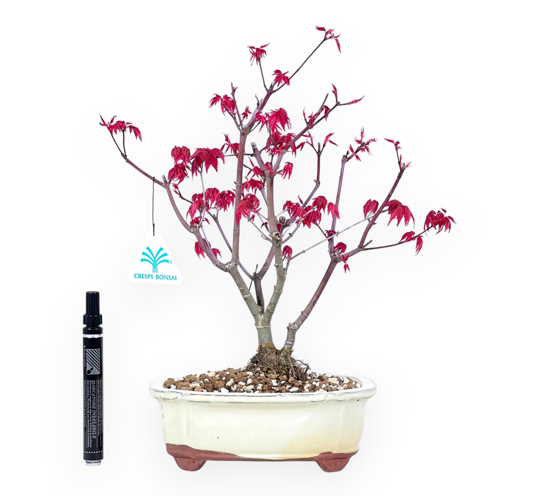 Bonsai di Acer palmatum deshojo (acero), specie caducifoglie, noto per le sue foglie palmate dai vivaci toni stagionali. La chioma dal rosso brillante, si colora di rosso intenso fino al rosso-arancione in autunno e si spoglia in inverno. In stile multitronco, è caratterizzato da due tronchi che partono dalla base, per creare una composizione equilibrata e dinamica che dona stabilità e armonia al bonsai. Coltivato in un vaso a nuvola in grès smaltato crema, completa il bonsai esaltando la bellezza della pianta, donando equilibrio e raffinatezza.