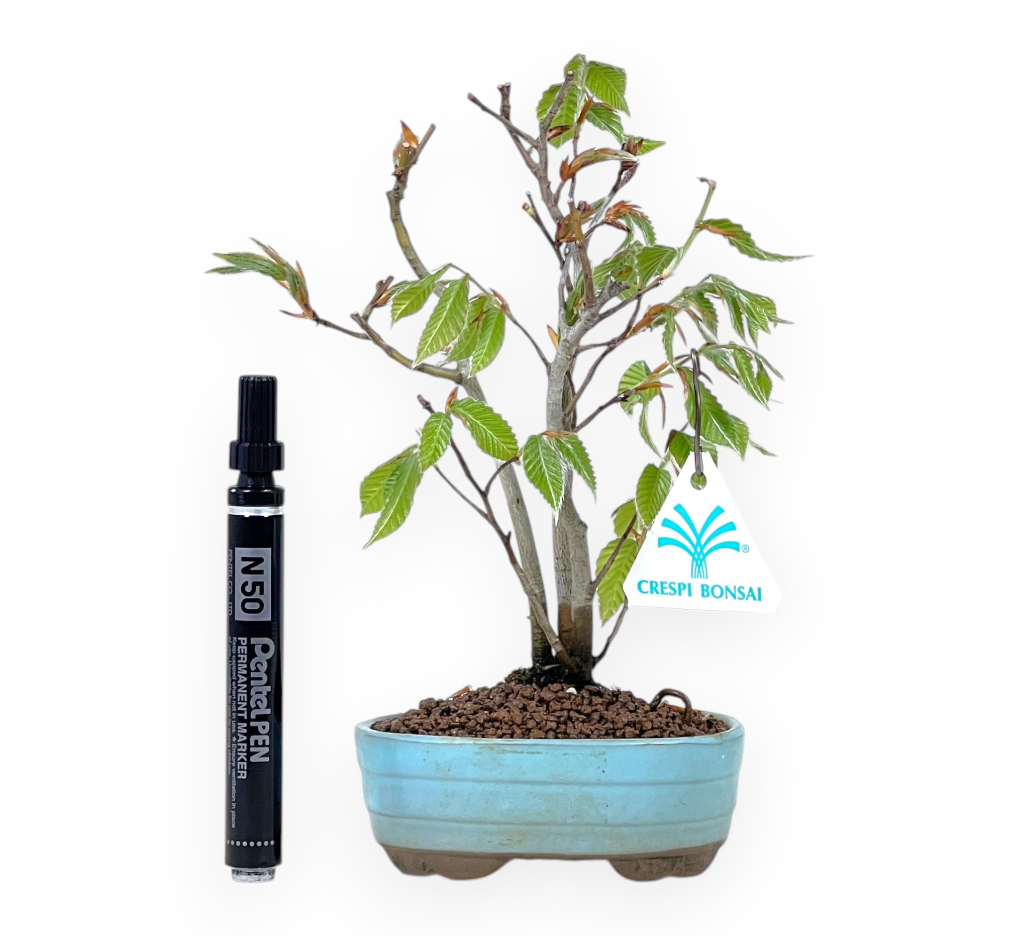 Bonsai shohin di Fagus crenata (faggio), specie caducifoglie dalle foglie lanceolate. La chioma dal verde brillante, si colora di giallo aranciato fino a diventare bruna in autunno e si spoglia in inverno. Impostato a stile multitronco, in cui più tronchi si sviluppano dalla stessa base, creando una composizione equilibrata e armoniosa che esalta la densità della chioma e dona grande profondità visiva alla pianta. Coltivato in un vaso ovale in grès smaltato azzurro, che contrasta elegantemente con le sfumature del fogliame esaltandone la bellezza.