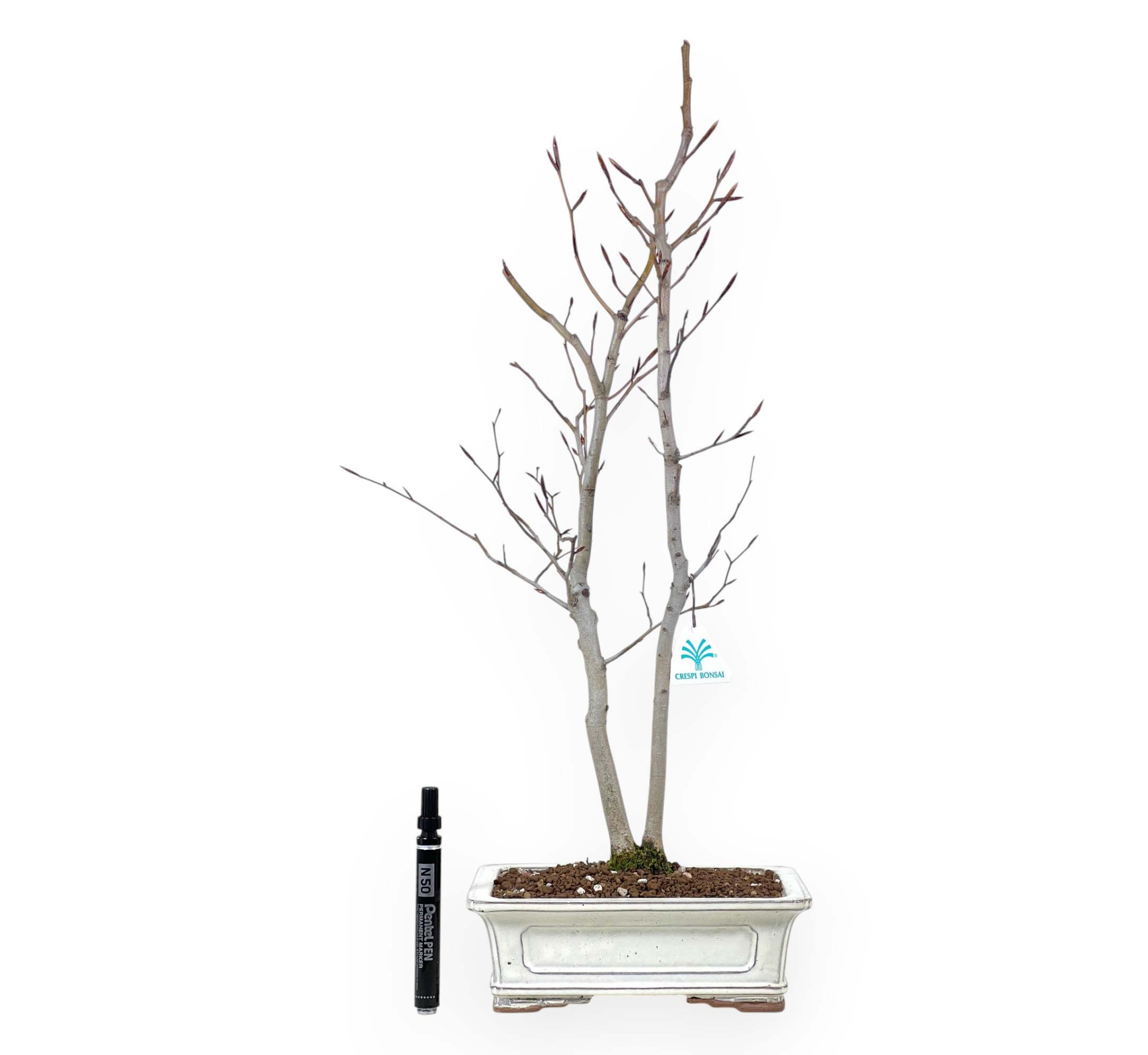 Bonsai di Fagus crenata (faggio), specie caducifoglie dalle foglie lanceolate. La chioma dal verde brillante, si colora di giallo aranciato fino a diventare bruna in autunno e si spoglia in inverno. In stile multitronco, è caratterizzato da due tronchi che partono dalla base, per creare una composizione equilibrata e dinamica che dona stabilità e armonia al bonsai. Coltivato in un vaso rettangolare in grès smaltato crema, completa il bonsai esaltando la bellezza della pianta, donando equilibrio e raffinatezza.