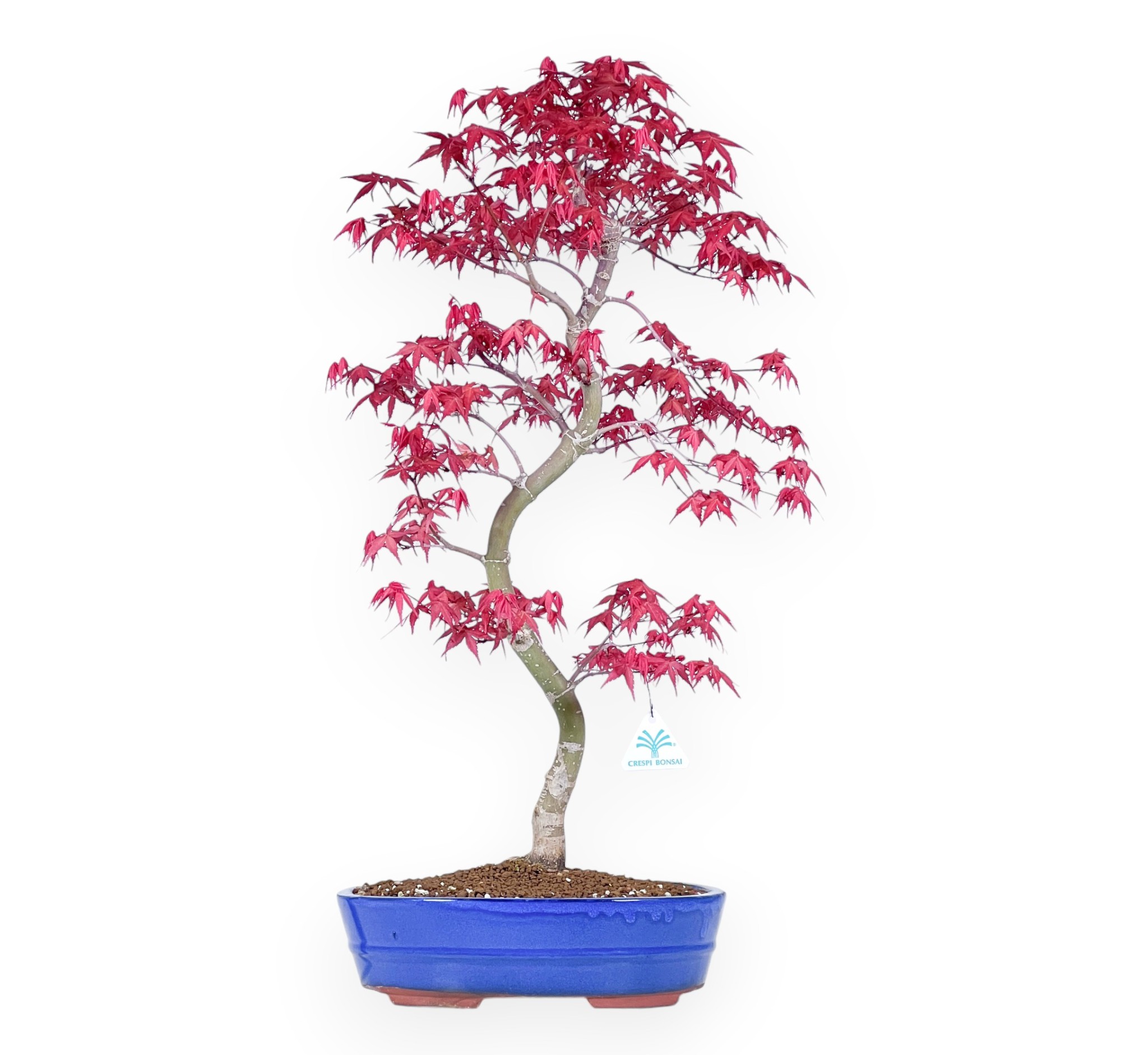Bonsai di Acer palmatum deshojo (acero), specie caducifoglie, noto per le sue foglie palmate dai vivaci toni stagionali. La chioma dal rosso brillante, si colora di rosso intenso fino al rosso-arancione in autunno e si spoglia in inverno. Presenta un tronco con movimento armonioso, accompagnato da una ramificazione leggera. Il vaso ovale in grès smaltato blu chiaro, crea un contrasto raffinato con il colore della vegetazione, esaltando la composizione con eleganza.