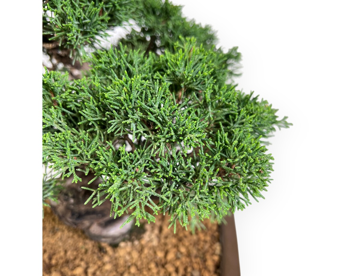 Bonsai di Ginepro caratterizzato da altezza senza vaso di 30,5 cm, e dimensione del tronco di 4 cm. La pianta è coltivata in un vaso retangolare in grès non smaltato le cui dimensioni sono 28x21xH8,5 cm.