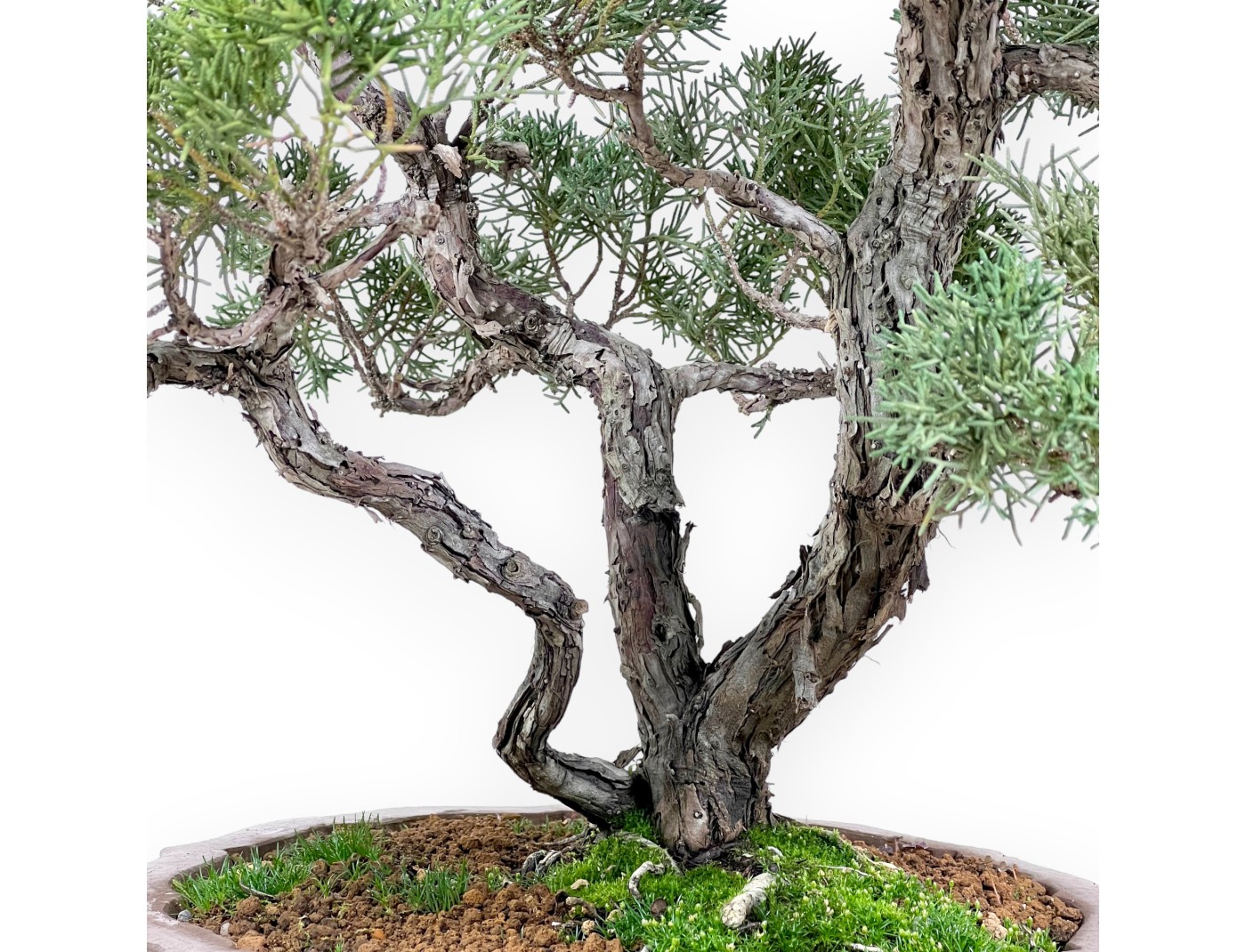 Il bonsai di Juniperus chinensis (ginepro) è una conifera sempreverde apprezzata per la sua eleganza e la resistenza alle diverse condizioni. La chioma dalla ramificazione compatta di colore verde intenso, i tronchi solidi e la corteccia che si screpola con il tempo conferiscono a questo bonsai un aspetto distintivo. Coltivato in stile a ceppaia (Kabudachi), presenta più tronchi che si sviluppano da un unico nebari, creando un effetto naturale e armonioso. Il bonsai è coltivato in un vaso a fiore in grès non smaltato richiama elementi naturali, esalta la bellezza del bonsai e conferisce un aspetto maestoso e raffinato.