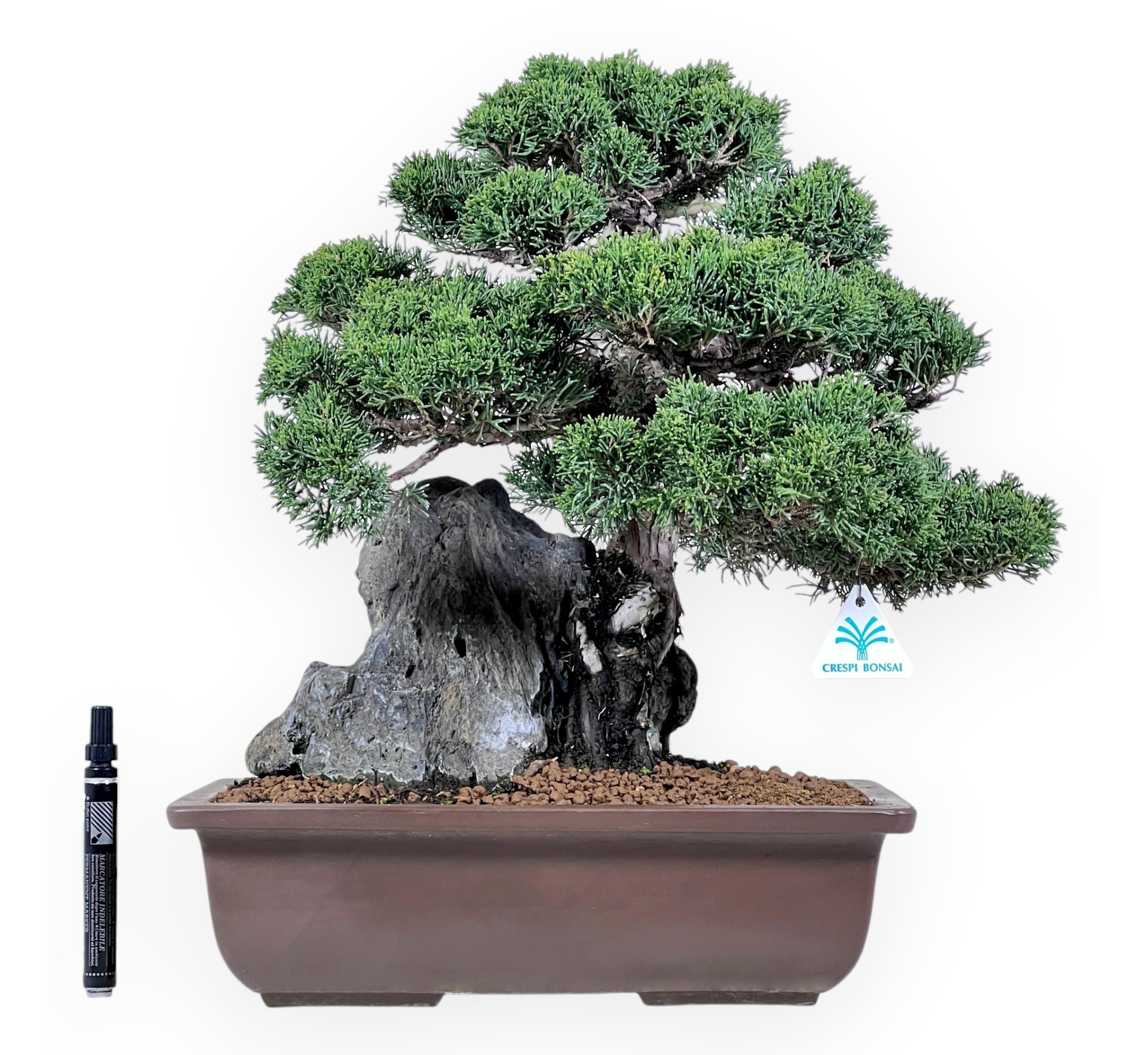 Il bonsai di Juniperus chinensis (Ginepro cinese), conifera sempreverde di grande fascino, è apprezzato per la sua eleganza e notevole resistenza. Il fogliame aghiforme di colore verde intenso, fitto e compatto, crea masse ben definite che valorizzano la struttura e donano profondità alla composizione. Con il tempo la corteccia tende a screpolarsi assumendo un aspetto maturo, elemento che accresce il carattere dell’esemplare. Questo bonsai è coltivato in stile su roccia (Seki-joju), dove il tronco si sviluppa aderendo alla pietra e le radici avvolgono la roccia in modo scenografico, evocando la forza della natura e la capacità della pianta di adattarsi ad ambienti impervi. L’insieme trasmette equilibrio, solidità e armonia, con una linea dinamica che accompagna lo sguardo dalla base fino alla sommità della chioma. È coltivato in vaso rettangolare in grès non smaltato, dai toni naturali e materici che richiamano gli elementi della terra e della roccia, esaltando l’autenticità della composizione e conferendo al bonsai un aspetto maestoso e raffinato.