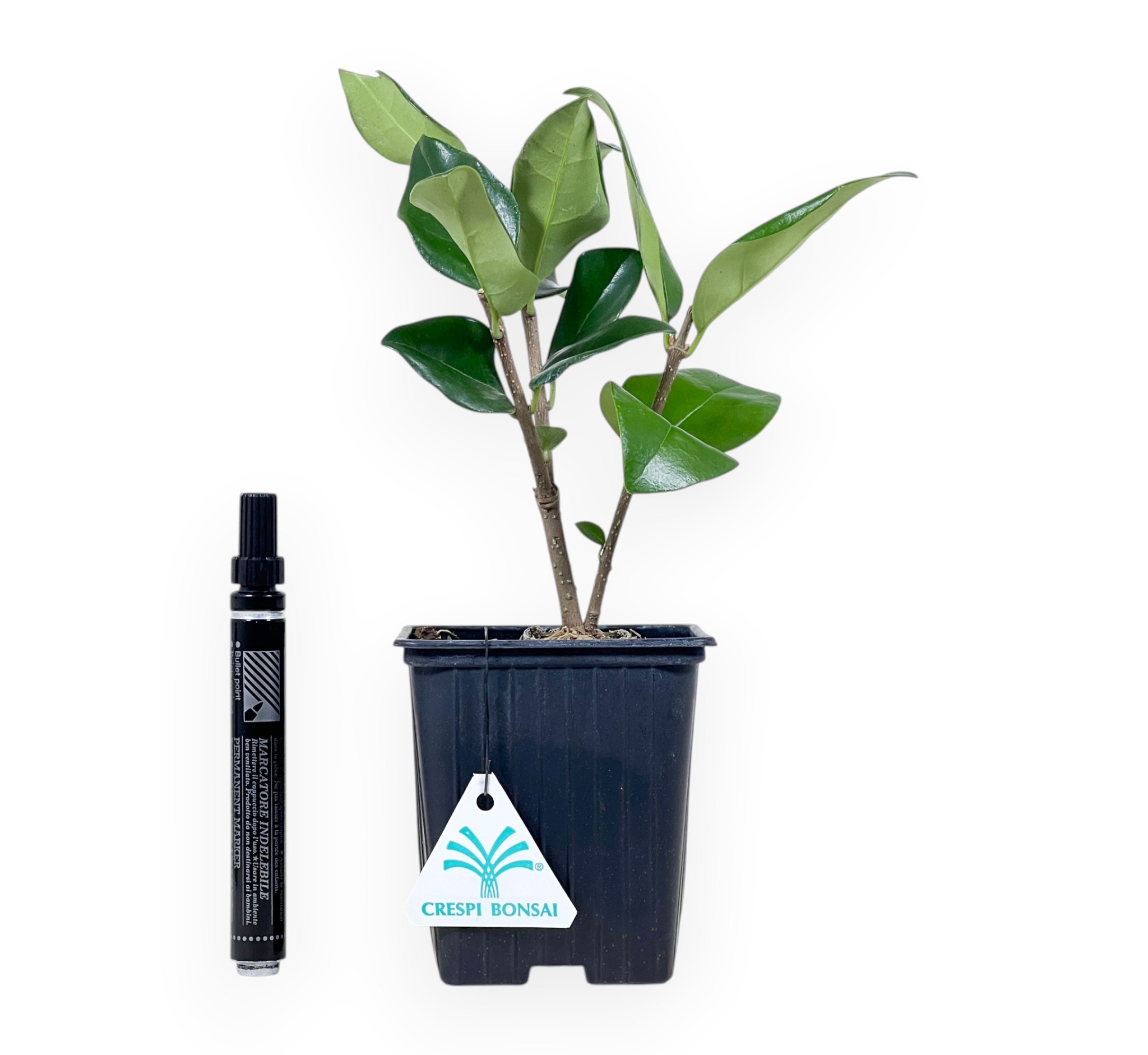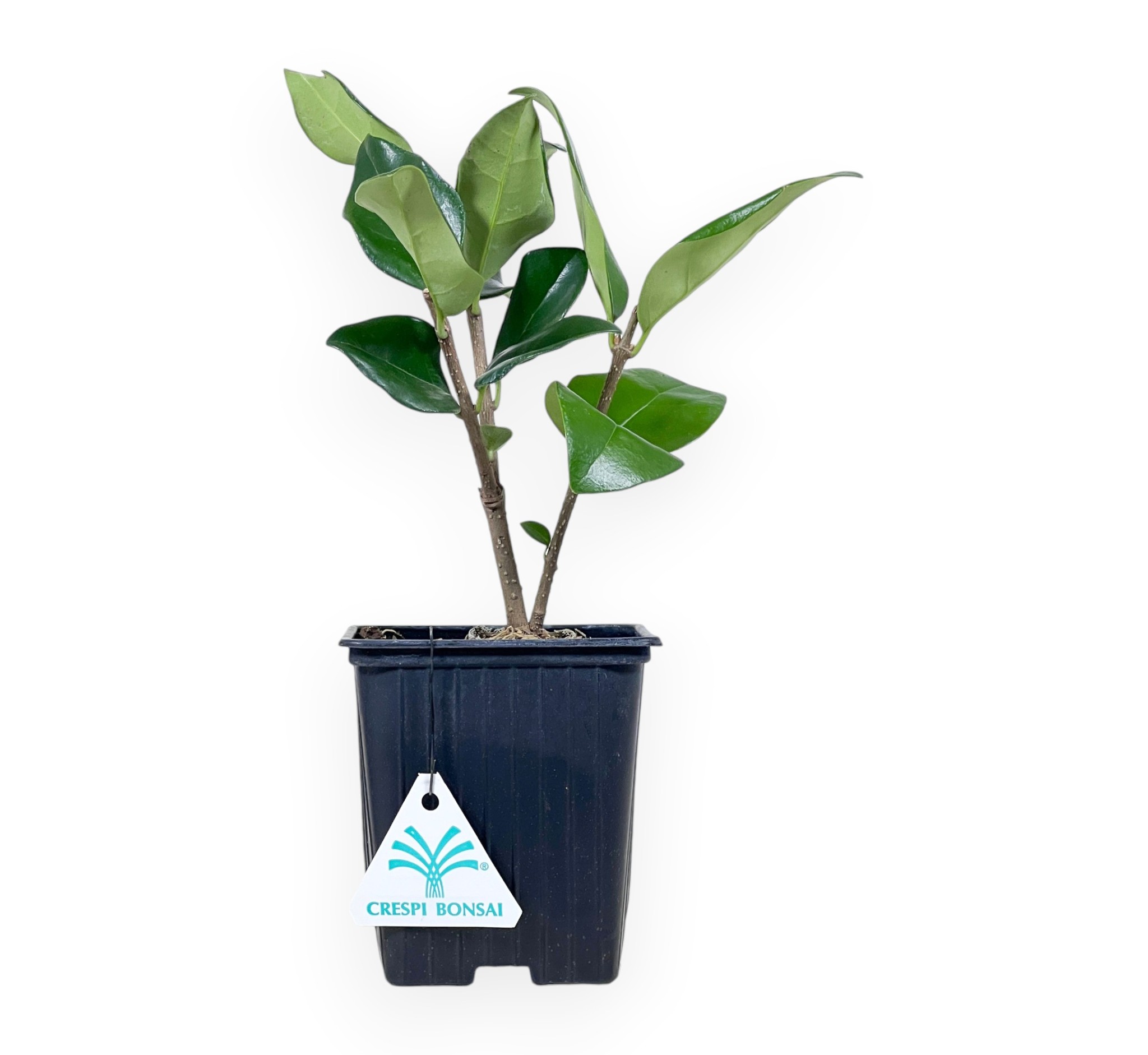 Pianta da lavorare di Ligustrum japonicum texanum caratterizzato da altezza senza vaso di 15,5 cm, e dimensione del tronco di 1 cm. La pianta è coltivata in un vaso quadrato in plastica le cui dimensioni sono 9x9xH9,5 cm