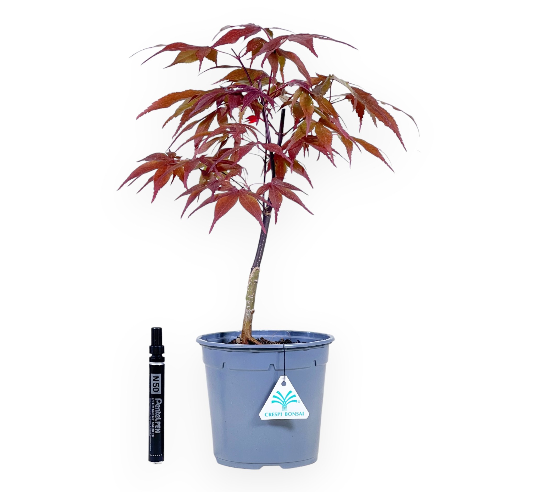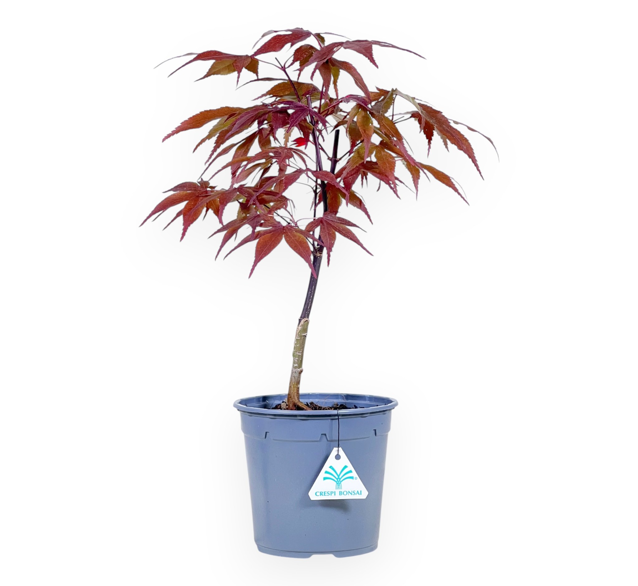 Pianta da lavorare di Acer palmatum blood good (acero), specie caducifoglie, apprezzato per le sue foglie palmate dai vivaci toni stagionali. La chioma dal rosso rubino, si colora di rosso scuro-porpora in estate, vira al rosso acceso in autunno e si spoglia in inverno. È una pianta in fase di crescita e modellatura. Coltivata in un vaso in plastica tondo grigio.