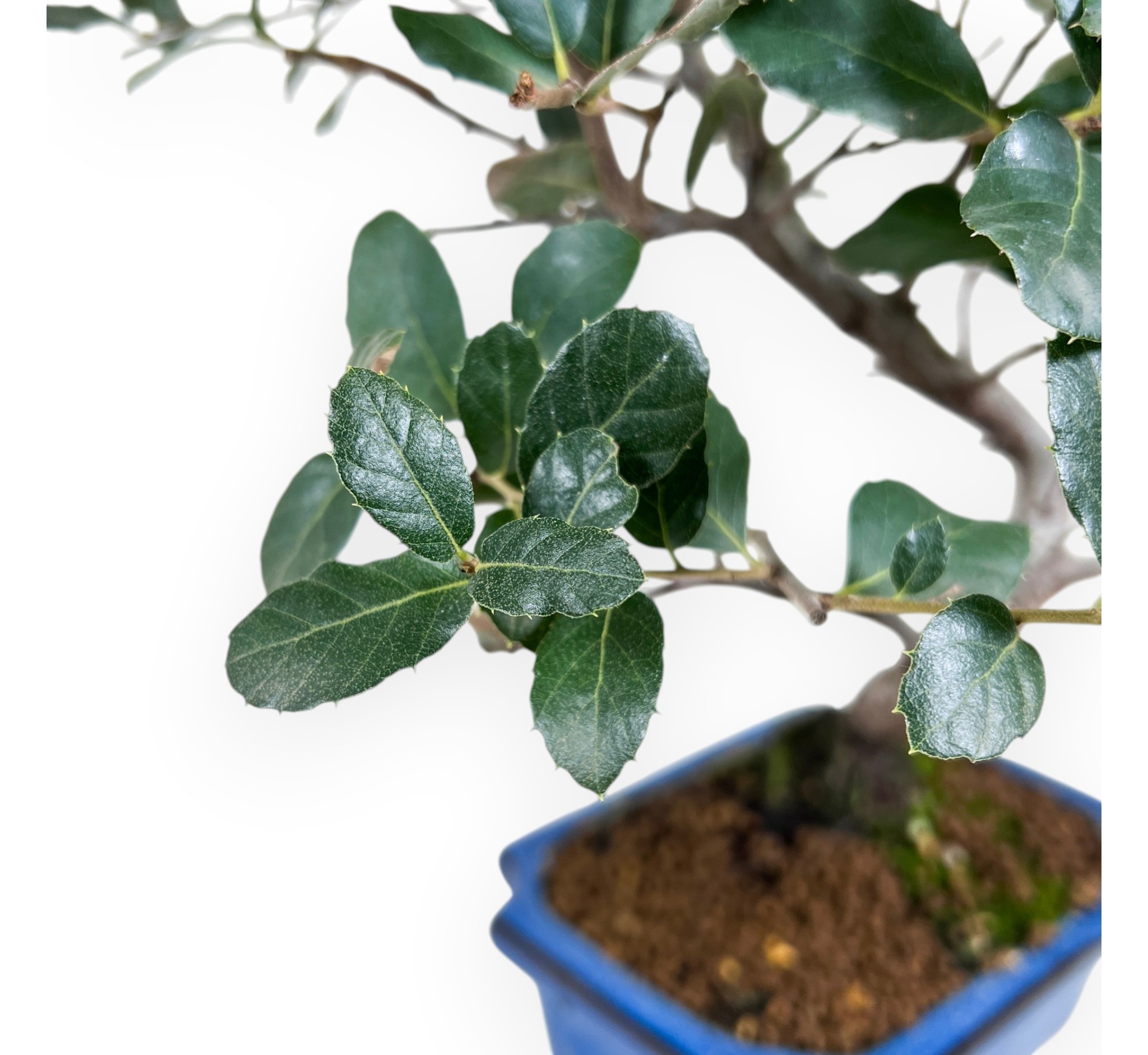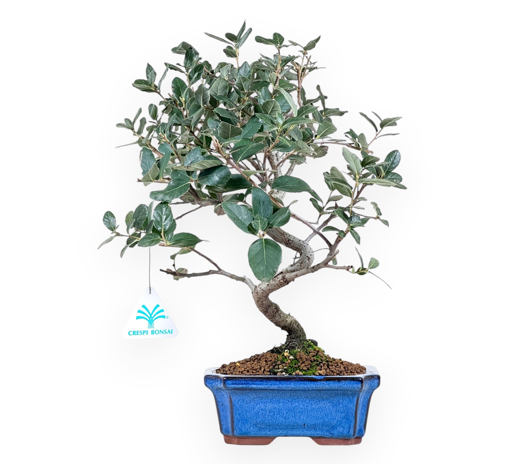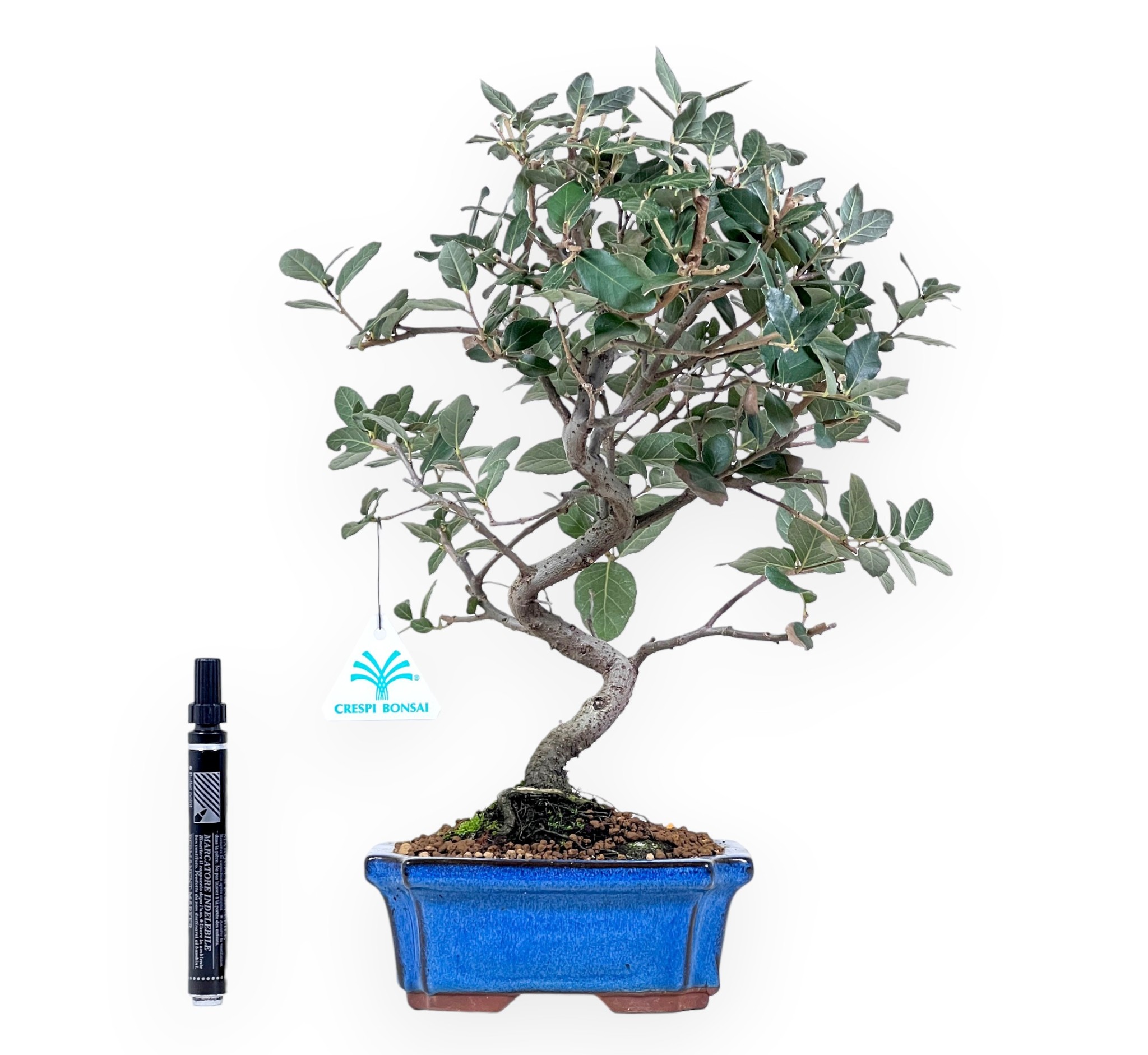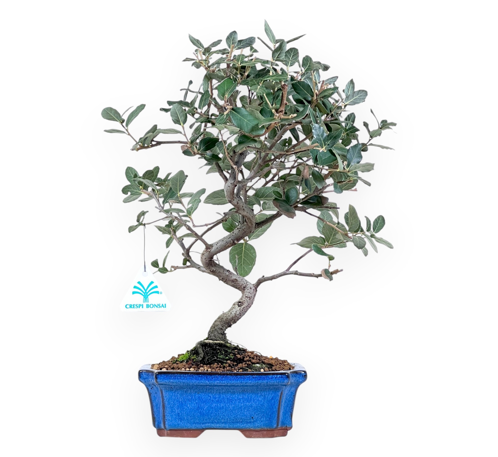 Il bonsai di Quercus suber (Quercia), sempreverde, è apprezzato per la caratteristica corteccia sugherosa e per le foglie piccole, coriacee e di un verde intenso. Con chioma compatta e ben distribuita, crea un insieme armonioso ed equilibrato. Presenta un tronco dal sinuoso che dona dinamicità, movimento naturale e carattere alla composizione. Coltivato in vaso rettangolare, con angoli smussati, in grès smaltato blu, crea un contrasto elegante con il colore della vegetazione.
