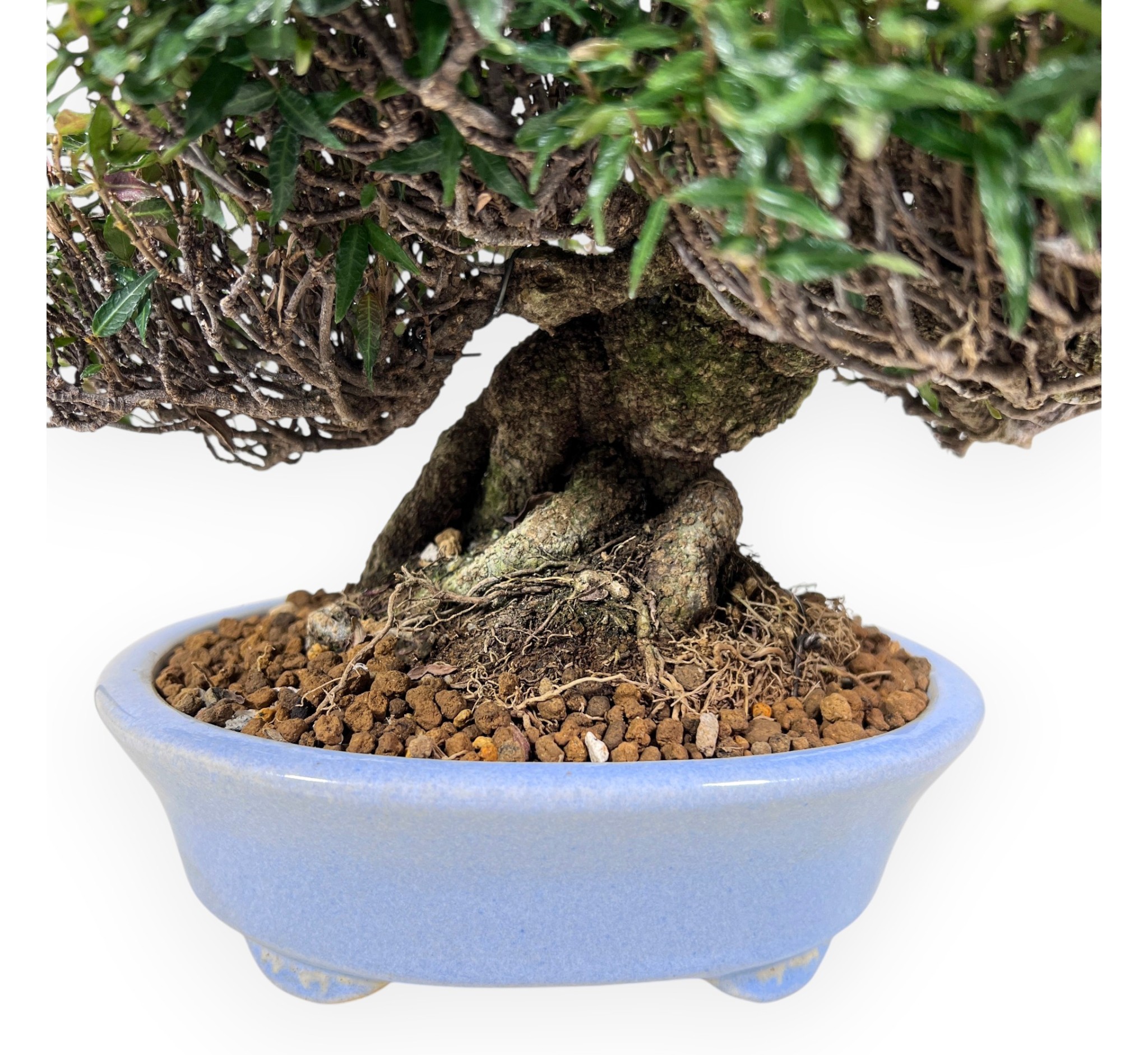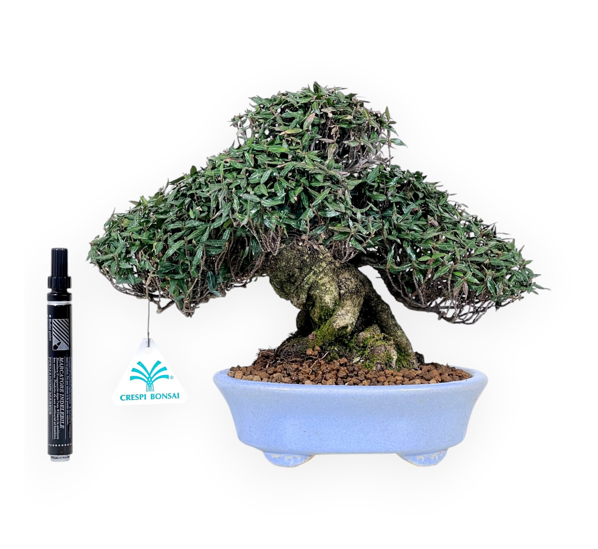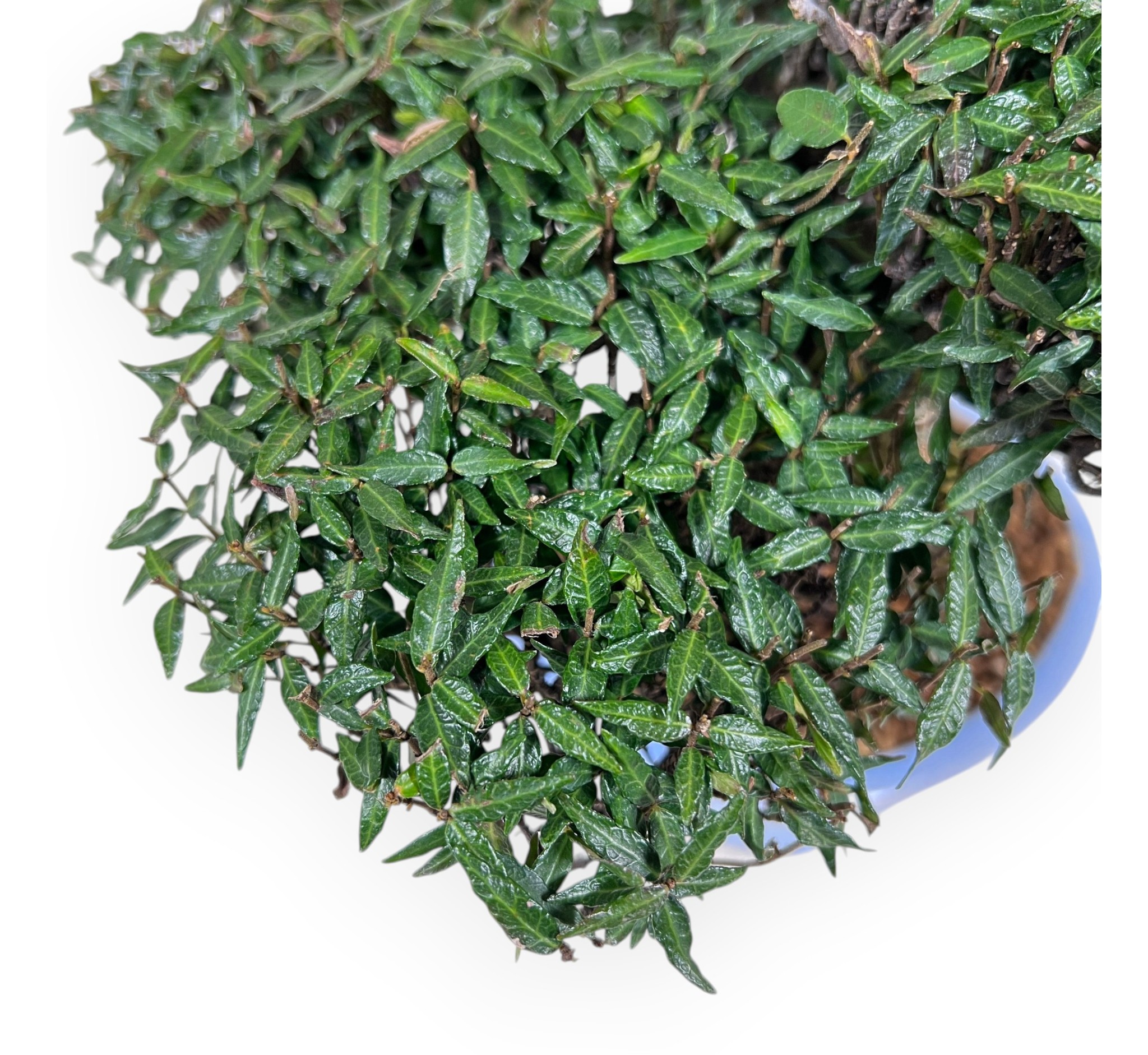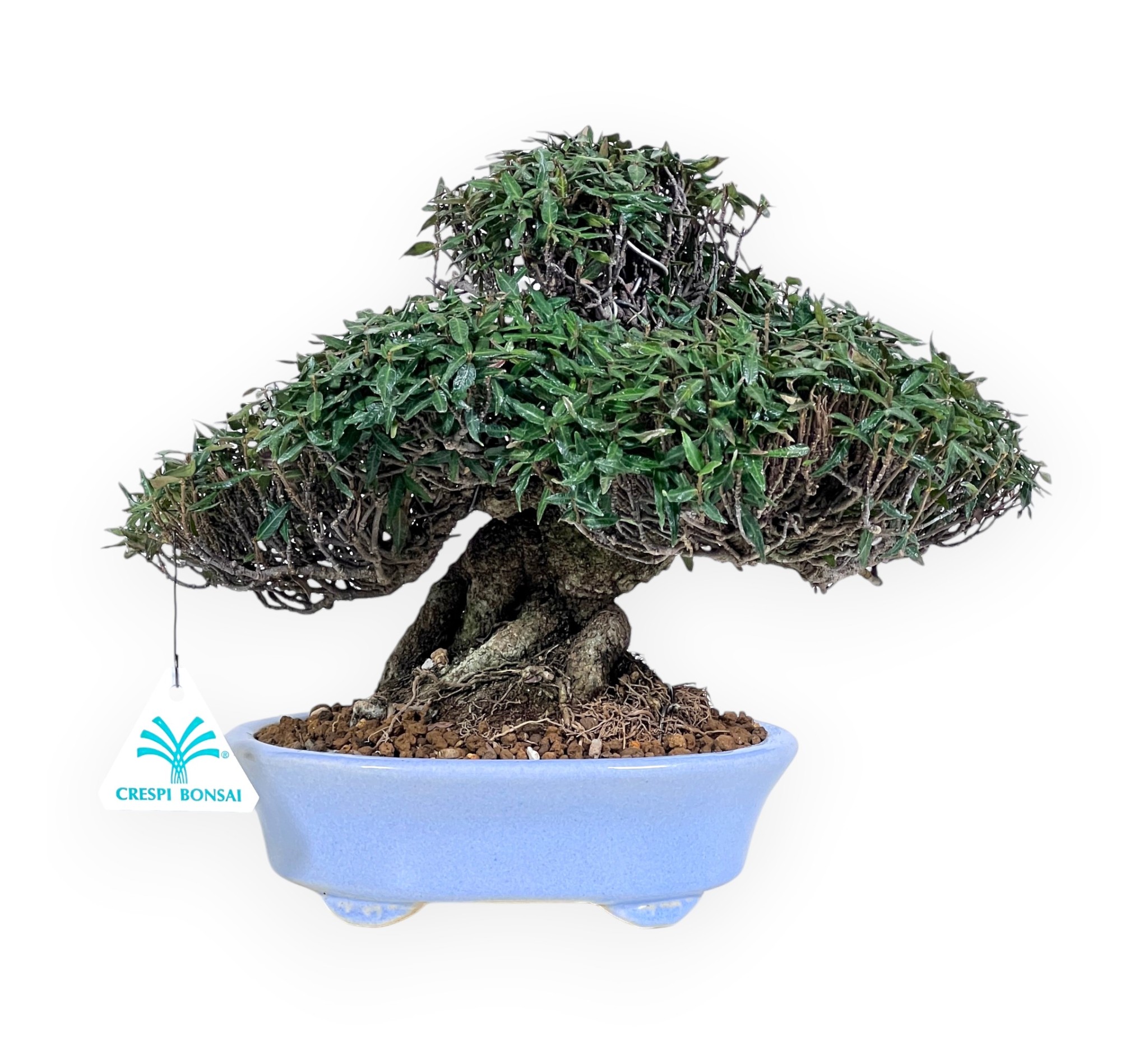Bonsai shohin di Trachelospermum asiaticum (gelsomino orientale), specie sempreverde elegante e resistente, caratterizzata dal piccolo e fitto fogliame, con sfumature che virano dal verde al rosso durante l'alternarsi delle stagioni. Durante la primavera, le nuove foglioline assumono bellissime tonalità rossastre o bronzo, che con il tempo virano a un verde intenso e brillante in estate. Con l’arrivo dell’autunno, parte del fogliame si tinge di sfumature rosse e rame, mantenendo comunque un aspetto fitto e decorativo anche in inverno. Inoltre nel periodo tra la fine della primavera e l'inizio dell'estate può produrre una fioritura discreta ma raffinata, con piccoli fiori bianchi profumati che emergono tra il fogliame, aggiungendo un tocco di eleganza alla pianta. È coltivato in vaso ovale in grès smaltato azzurro, che valorizza la struttura e i colori della chioma.