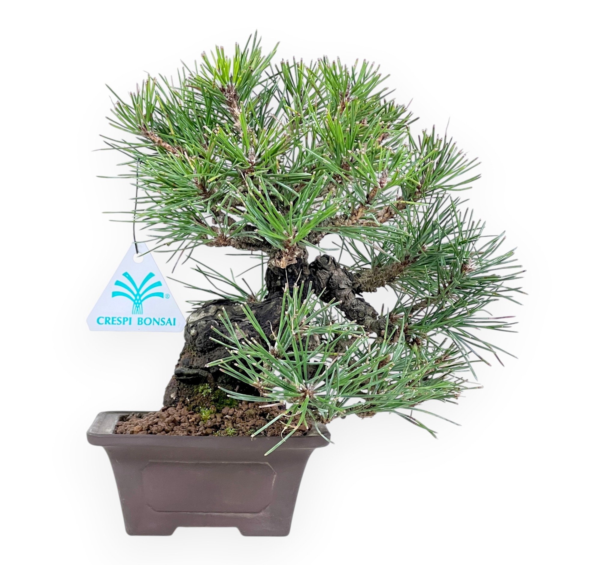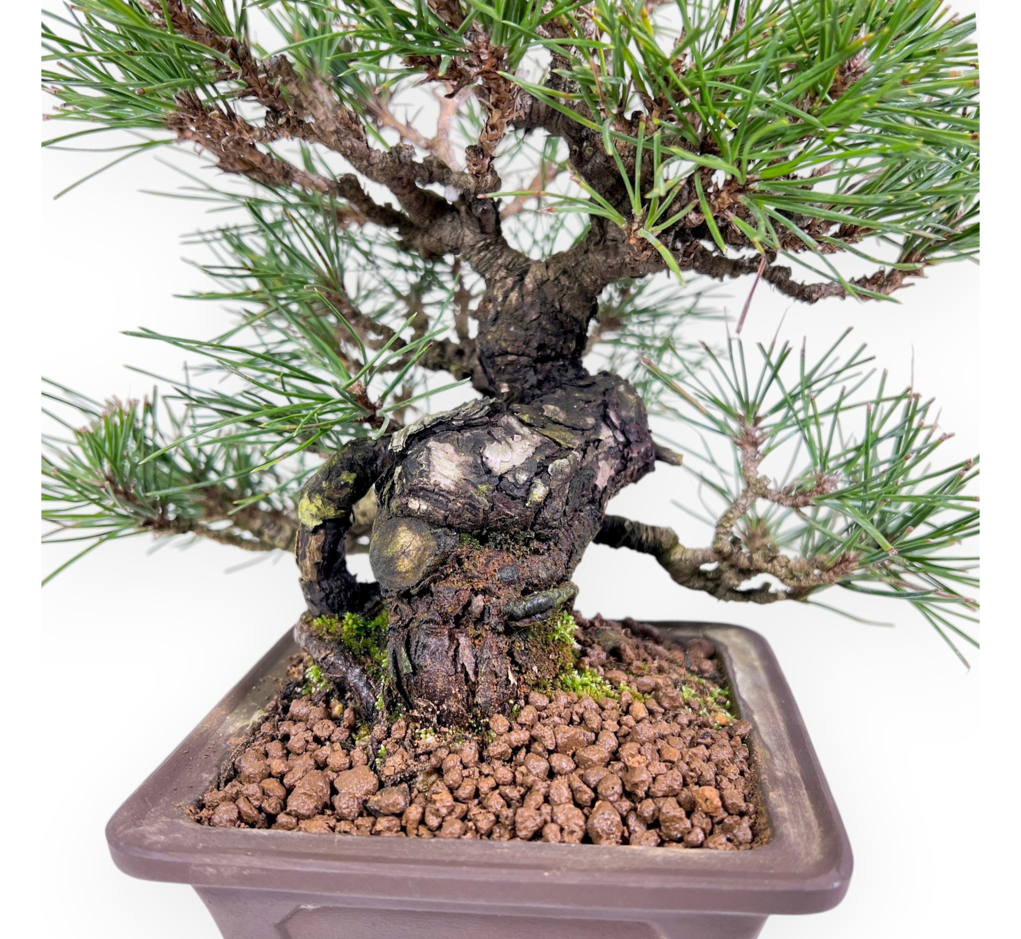 Il bonsai shohin di Pinus thunbergii (pino nero), conifera sempreverde, è robusto e molto apprezzato per la sua corteccia rugosa e gli aghi vigorosi. La chioma è densa e formata da aghi doppi, lunghi e sottili di un verde brillante. La corteccia matura e rugosa invecchiando si fessura diventando sempre più interessante. Coltivato in vaso quadrato in grès non smaltato, esalta il contrasto cromatico e valorizza l’estetica naturale del bonsai.